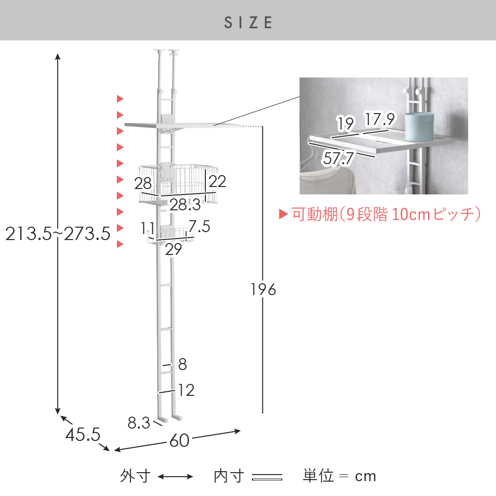 | サイズ | 約幅60×奥行き45.5×高さ213.5〜273.5cm |