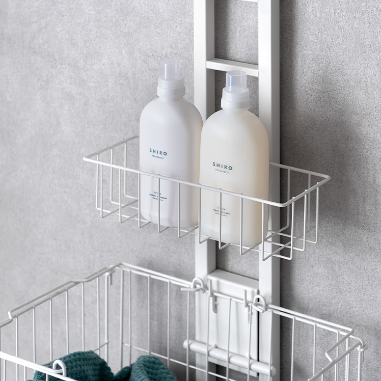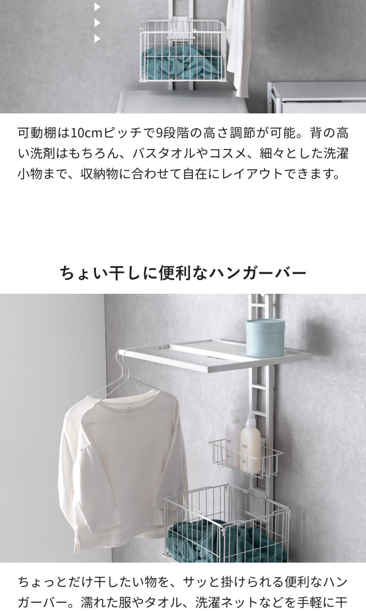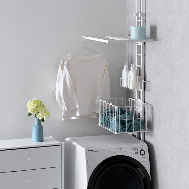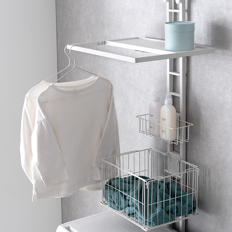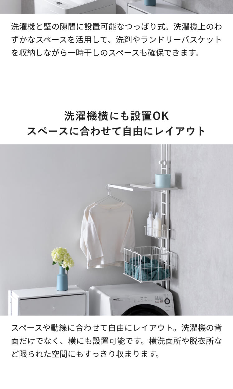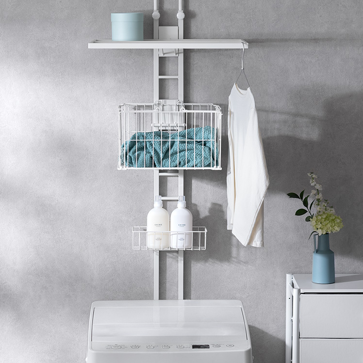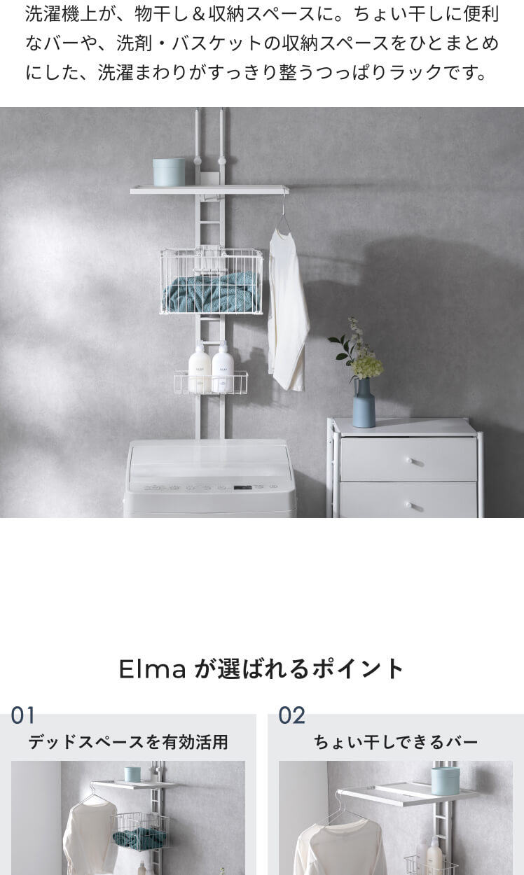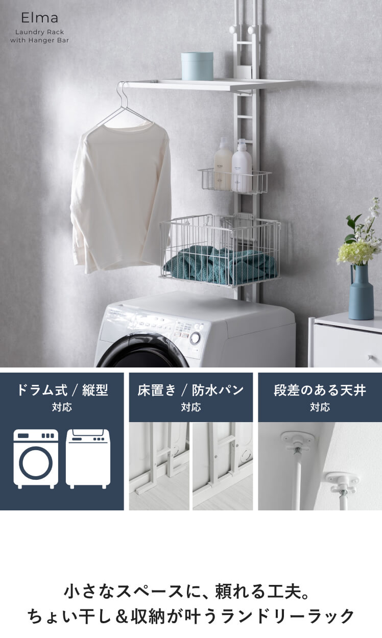 服をかけられるつっぱりランドリーラック Elma〔エルマ〕/洗濯機上が、物干し&収納スペースに。ちょい干しに便利なバーや、洗剤・バスケットの収納スペースをひとまとめにした、洗濯まわりがすっきり整うつっぱりラックです。