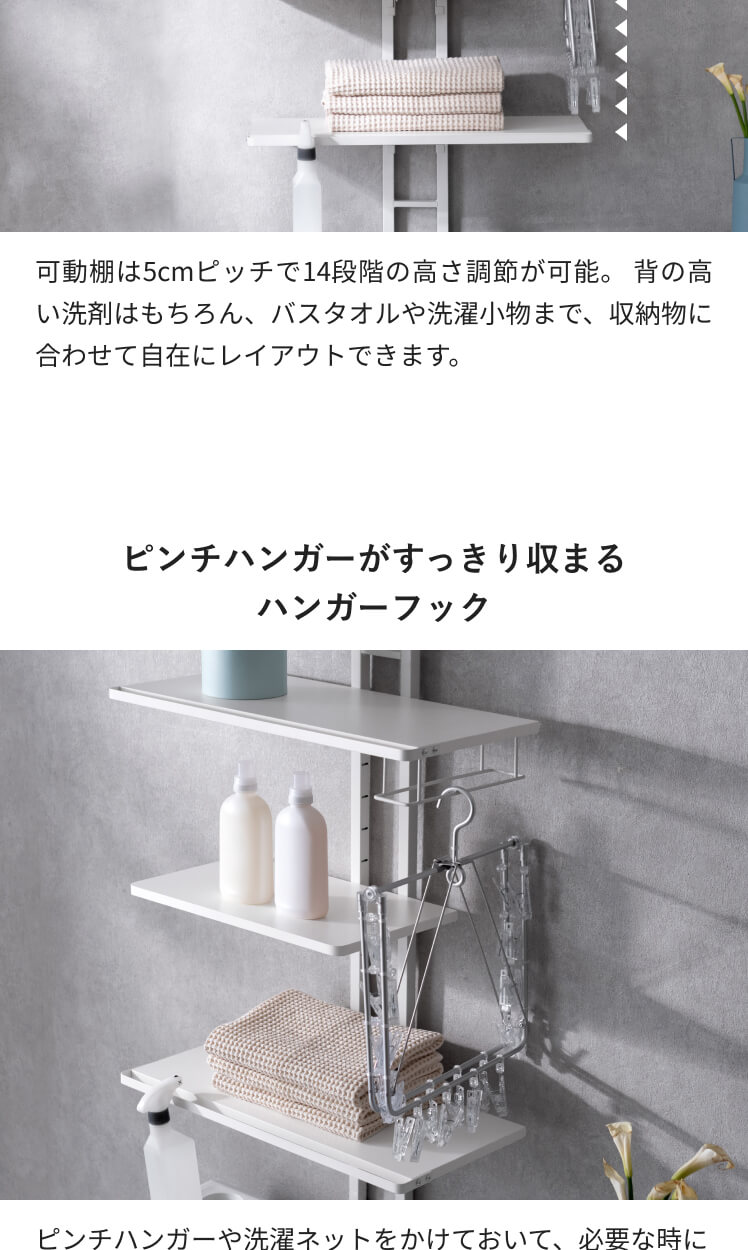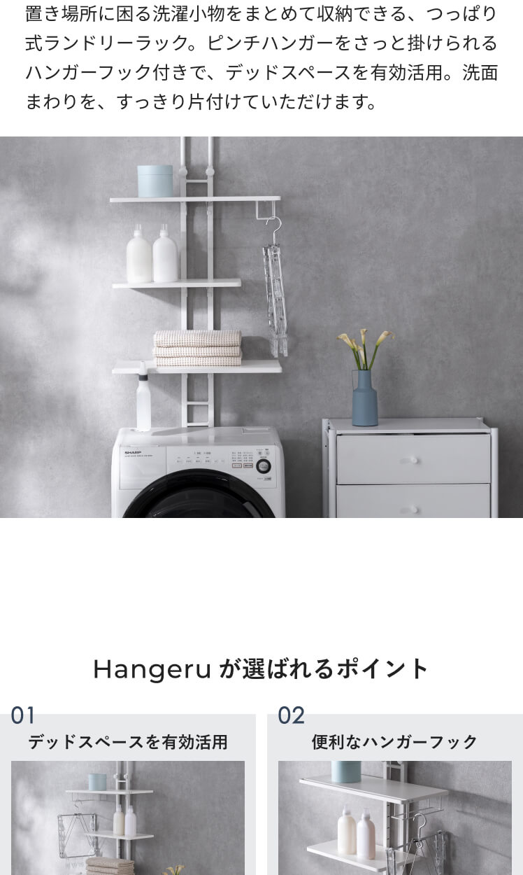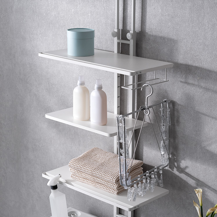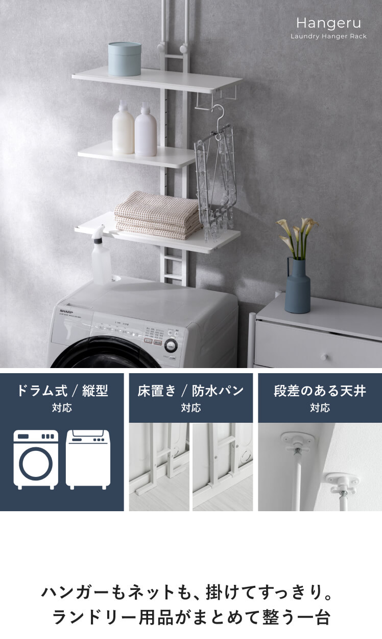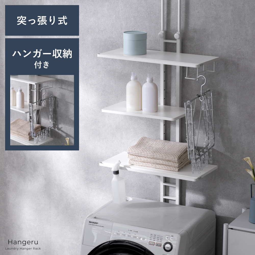 ハンガー収納付きつっぱりランドリーラック Hangeru〔ハンゲル〕/置き場所に困る洗濯小物をまとめて収納できる、つっぱり式ランドリーラック。ピンチハンガーをさっと掛けられるハンガーフック付きで、デッドスペースを有効活用。洗面まわりを、すっきり片付けていただけます。