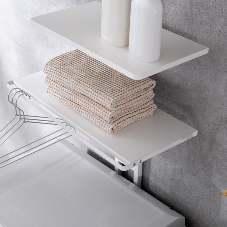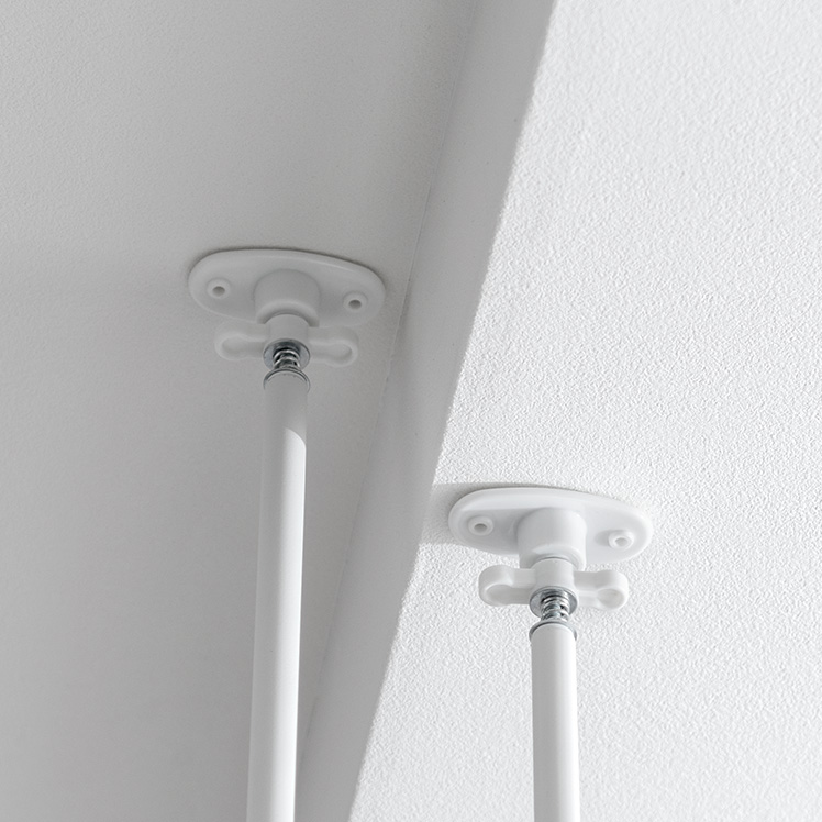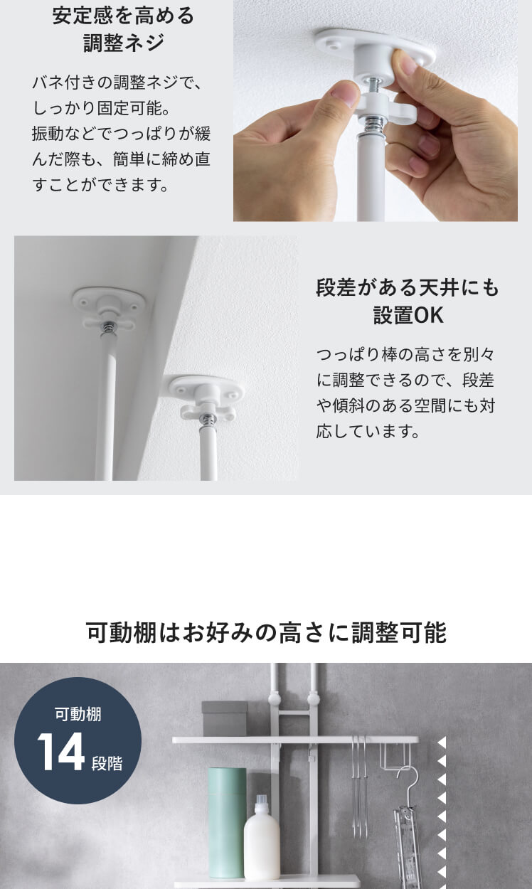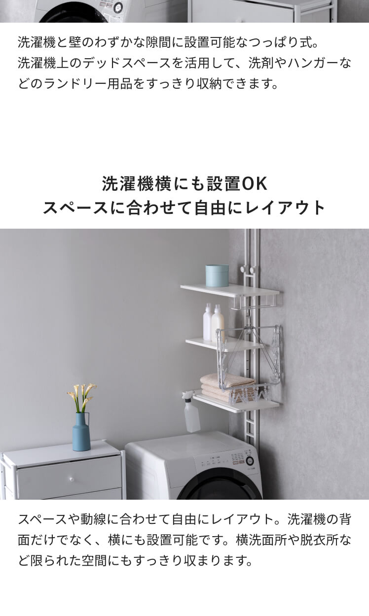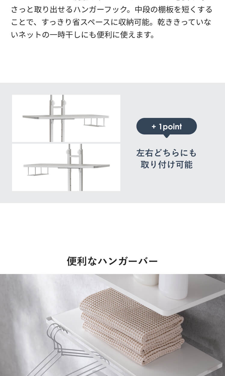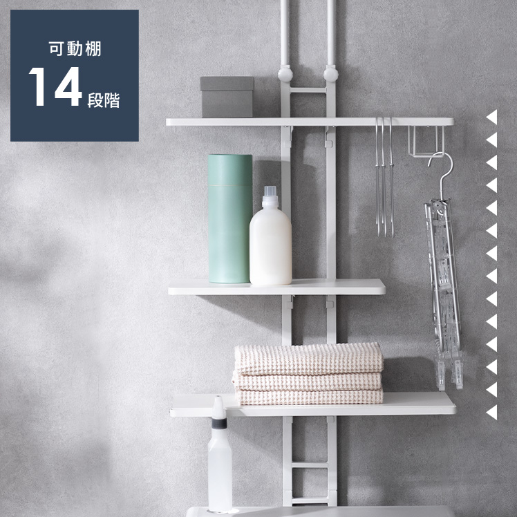 ハンガー収納付きつっぱりランドリーラック Hangeru〔ハンゲル〕/置き場所に困る洗濯小物をまとめて収納できる、つっぱり式ランドリーラック。ピンチハンガーをさっと掛けられるハンガーフック付きで、デッドスペースを有効活用。洗面まわりを、すっきり片付けていただけます。