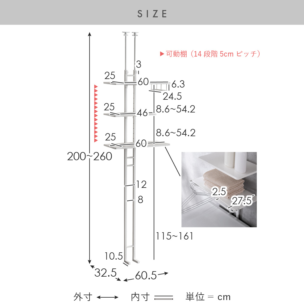 | サイズ | 約幅60.5×奥行き32.5×高さ200〜260cm |