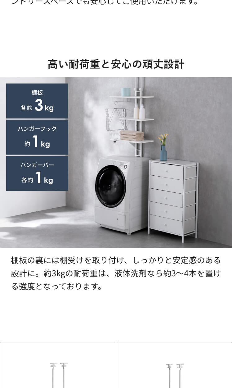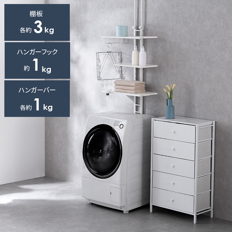 | 耐荷重 | 棚板/約3kg、バー(ハンガー)/約1kg、フック/約1kg |