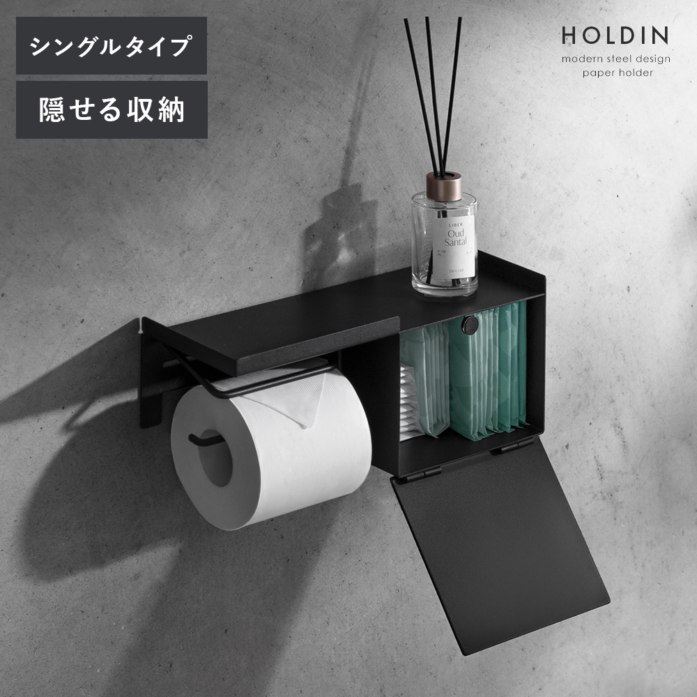 収納ケース付きペーパーホルダー HOLDIN〔ホルディン〕 シングルタイプ/フタ付き収納を備えた、便利なペーパーホルダー。生活感が出やすいサニタリー用品や掃除用品などを、すぐ手が届く場所に、すっきり隠して収納できます。