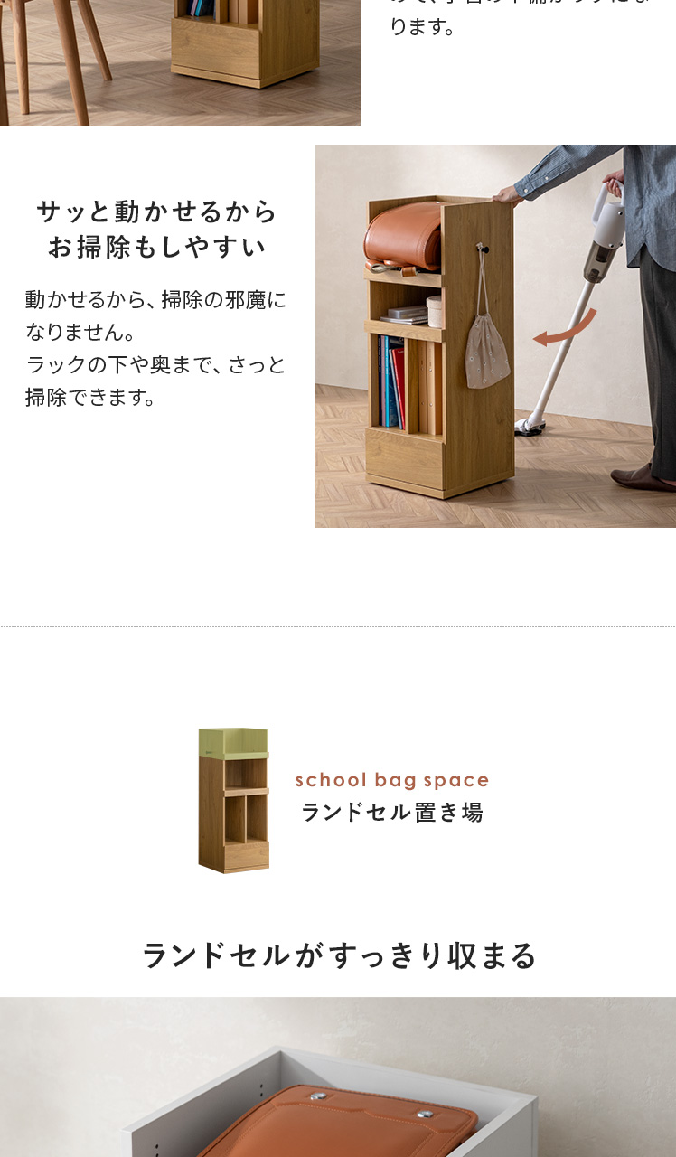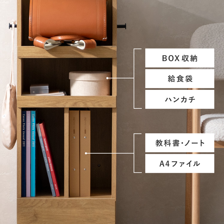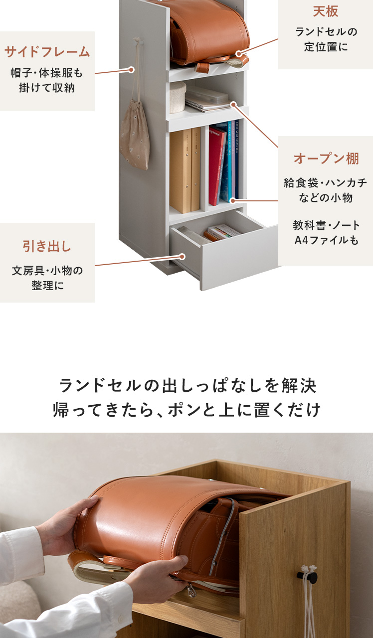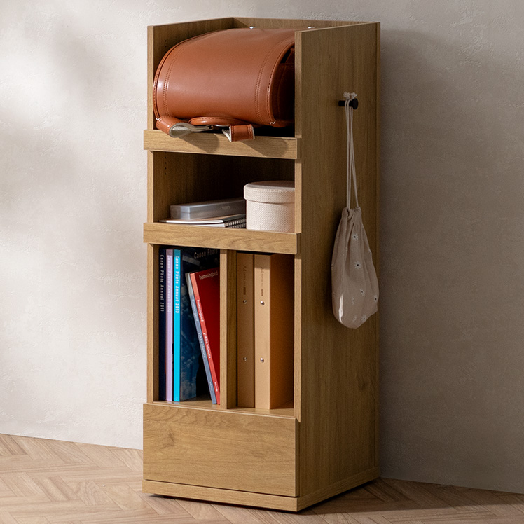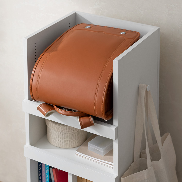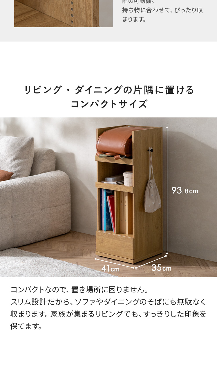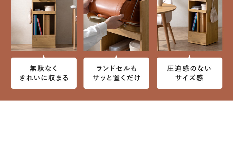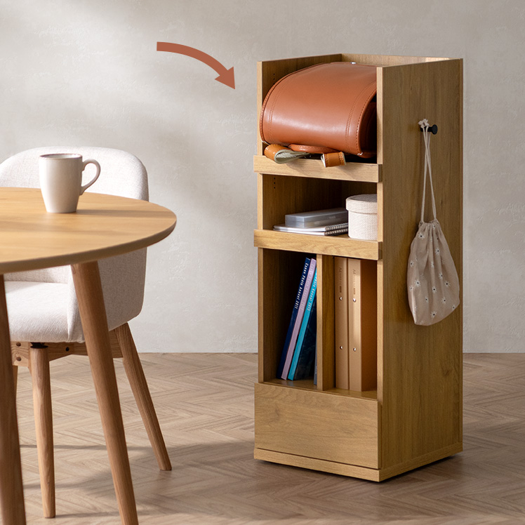 くるっと隠せるランドセルラック TONO〔トノ〕/スリムで場所を取らず、空間になじむサイズ設計。学習スペースもリビングも、どちらもすっきり整います。