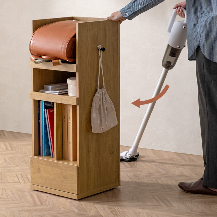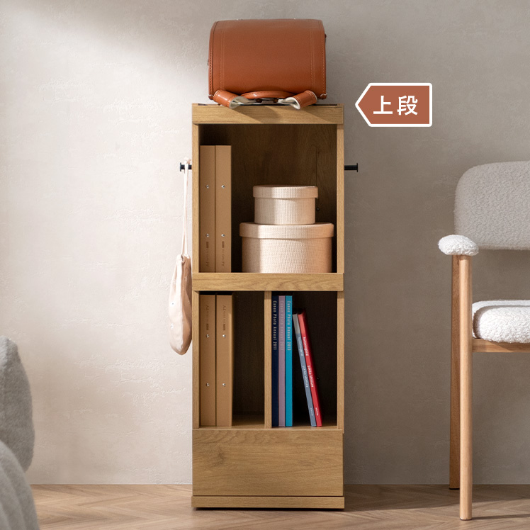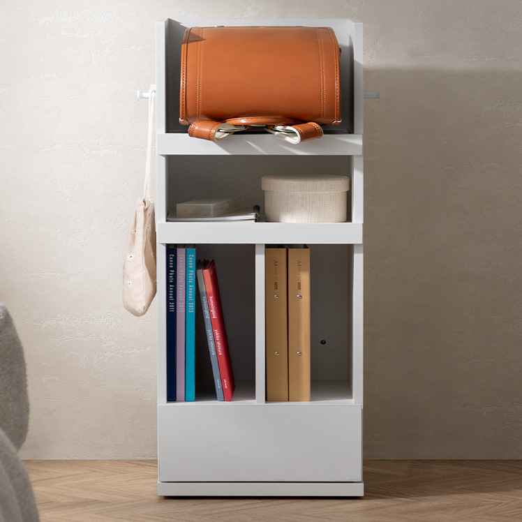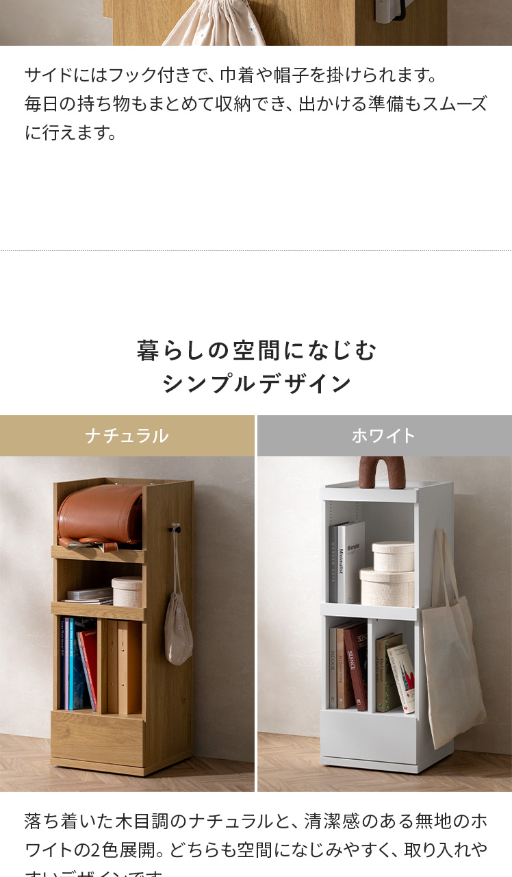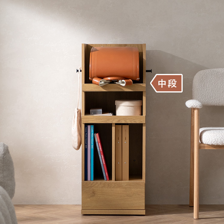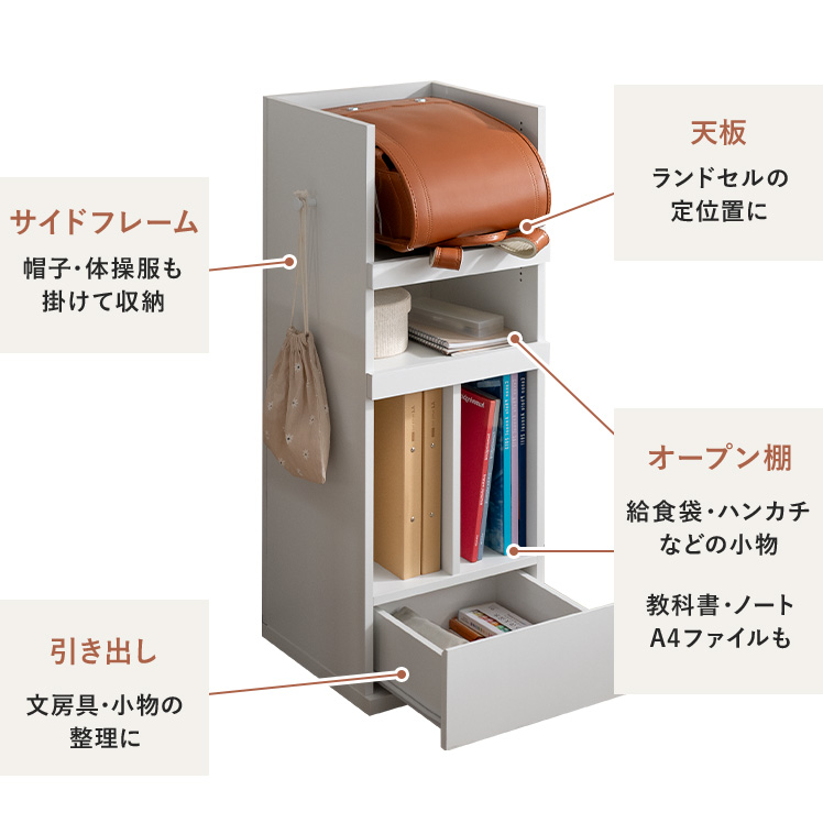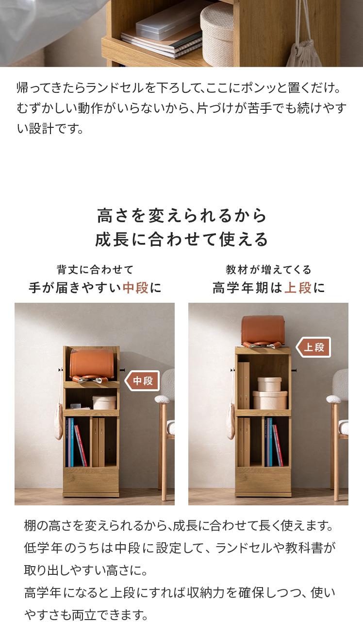 くるっと隠せるランドセルラック TONO〔トノ〕/スリムで場所を取らず、空間になじむサイズ設計。学習スペースもリビングも、どちらもすっきり整います。