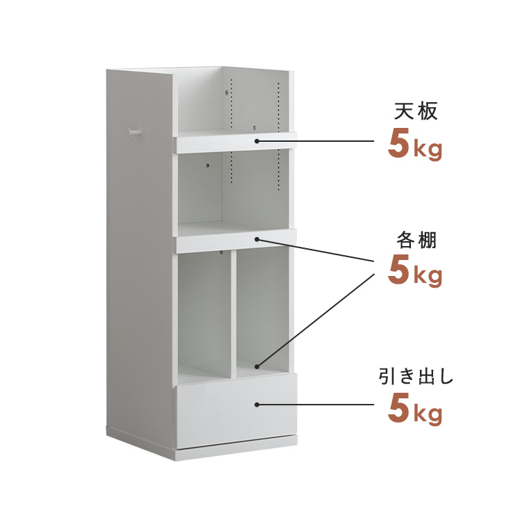 | 耐荷重 | 天板/約5kg、各棚/約5kg、引き出し/約5kg |