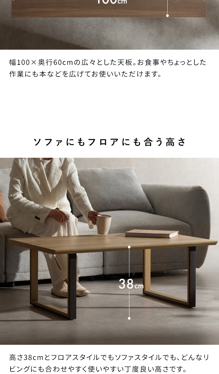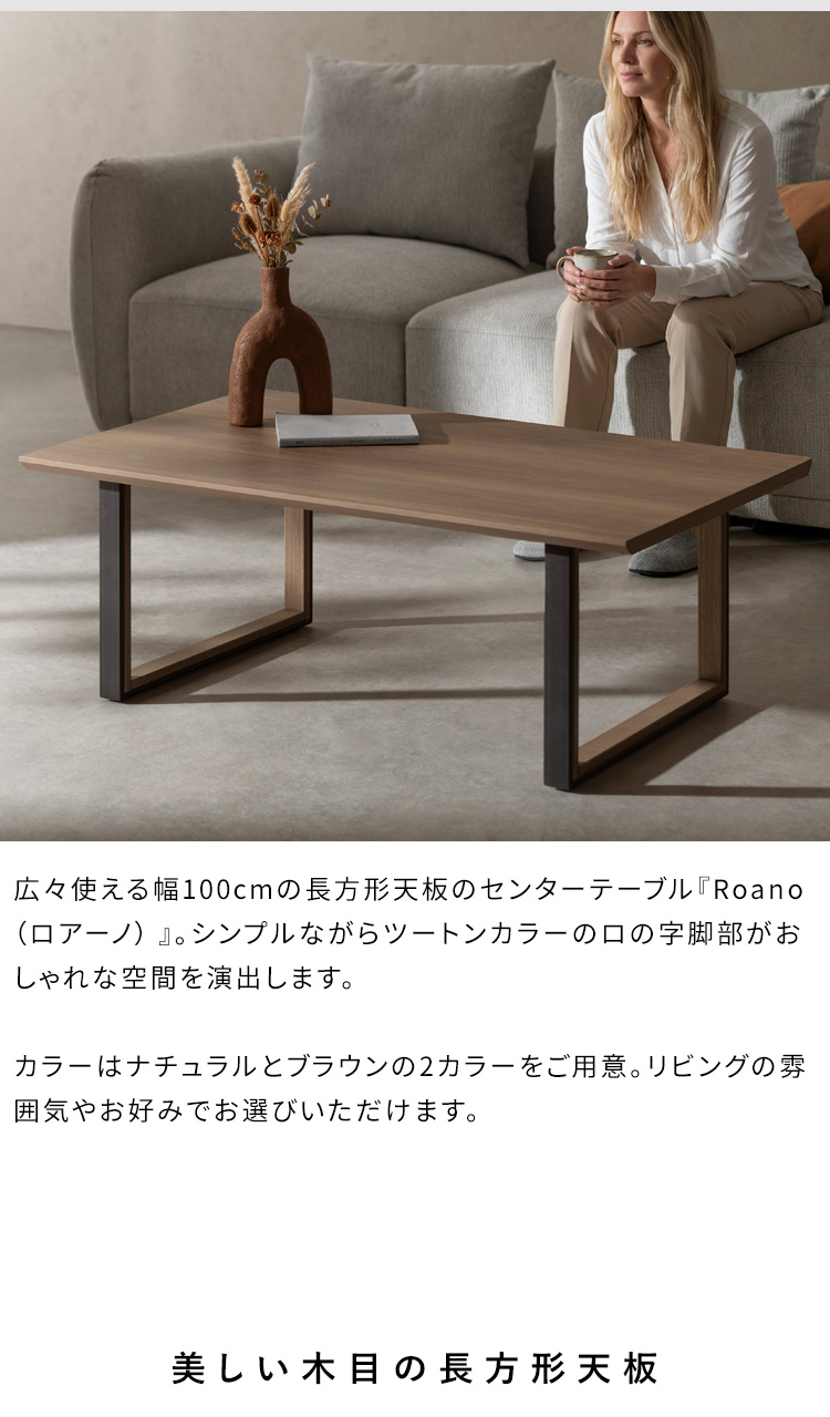 センターテーブル Roano〔ロアーノ〕/広々使える幅100cmの長方形天板のセンターテーブル『Roano(ロアーノ) 』。シンプルながらツートンカラーのロの字脚部がおしゃれな空間を演出します。カラーはナチュラルとブラウンの2カラーをご用意。リビングの雰囲気やお好みでお選びいただけます。