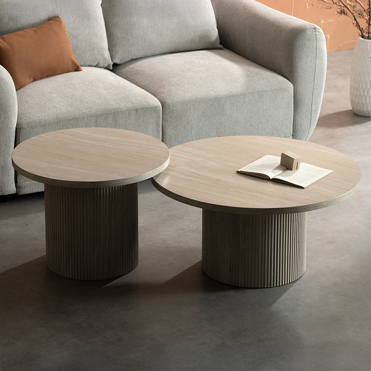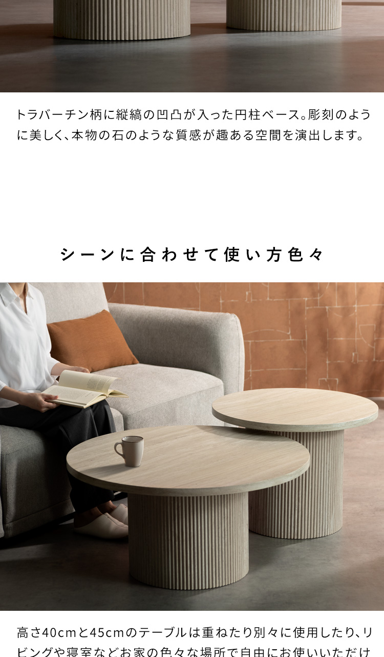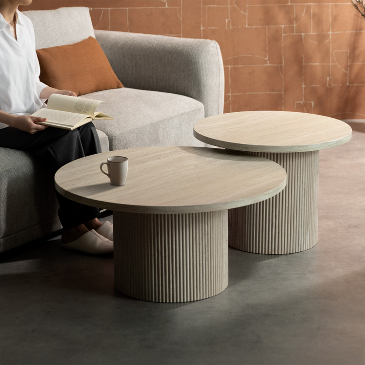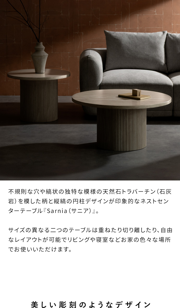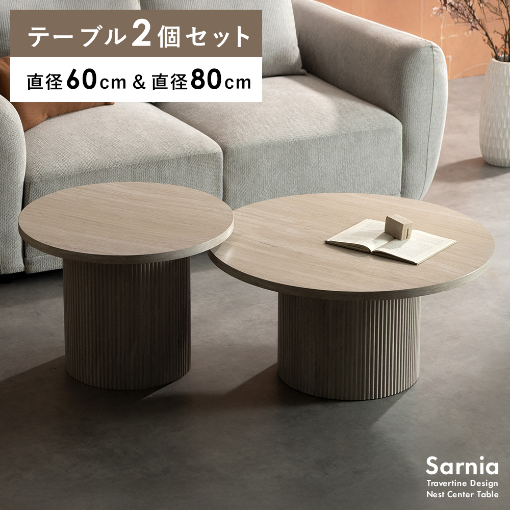 ネストセンターテーブル Sarnia〔サニア〕/サイズの異なる二つのテーブルは重ねたり切り離したり、自由なレイアウトが可能でリビングや寝室などお家の色々な場所でお使いいただけます。