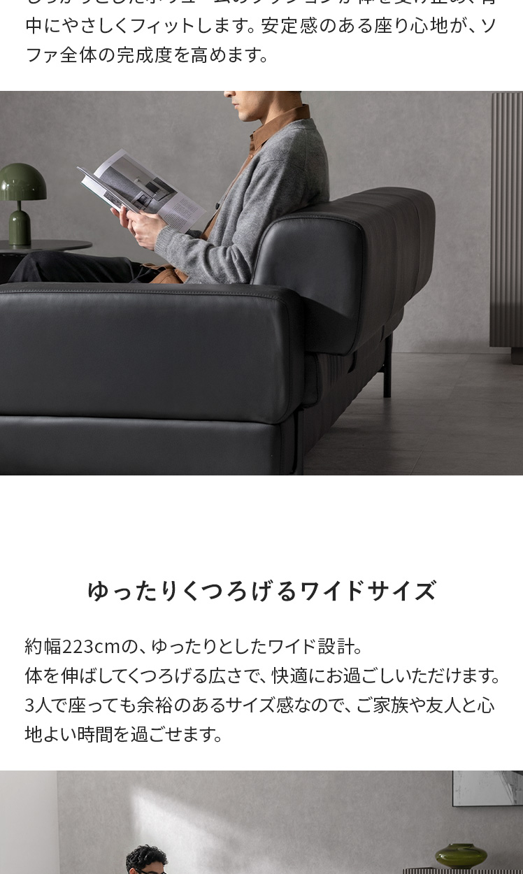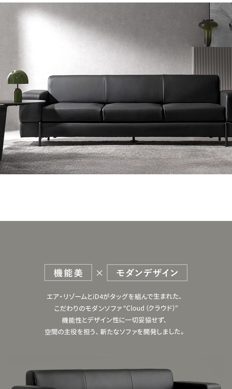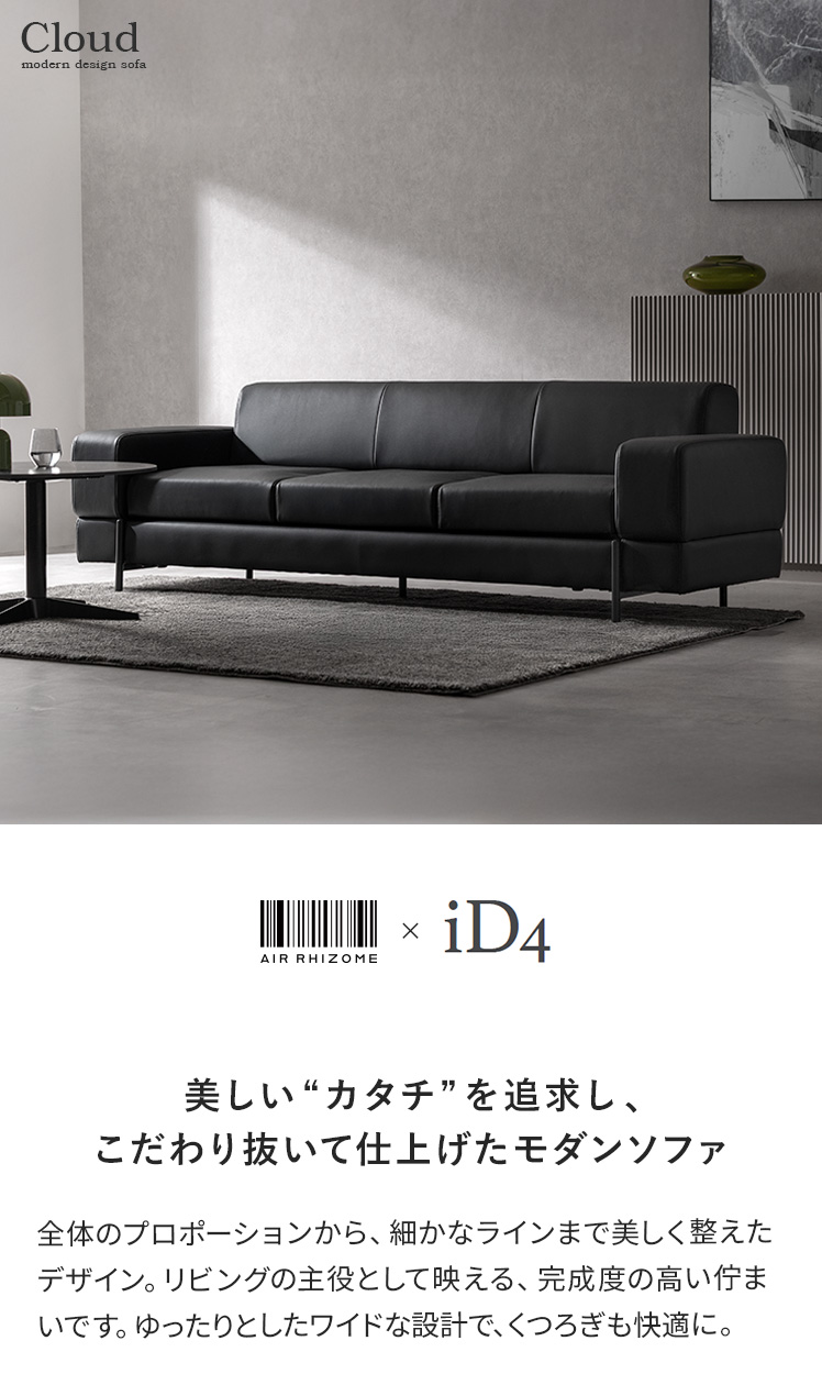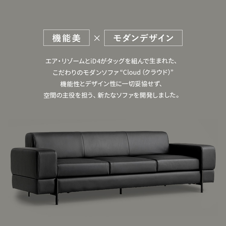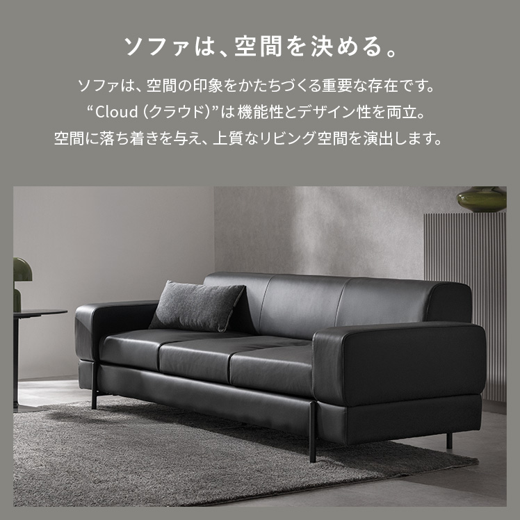 モダンソファ Cloud〔クラウド〕/全体のプロポーションから、細かなラインまで美しく整えたデザイン。リビングの主役として映える、完成度の高い佇まいです。ゆったりとしたワイドな設計で、くつろぎも快適に。