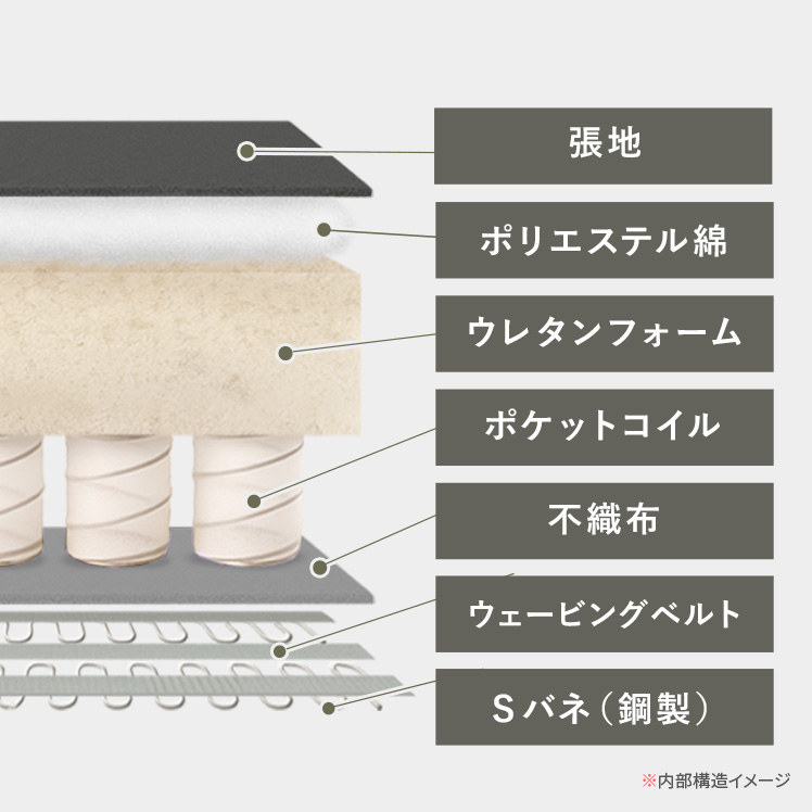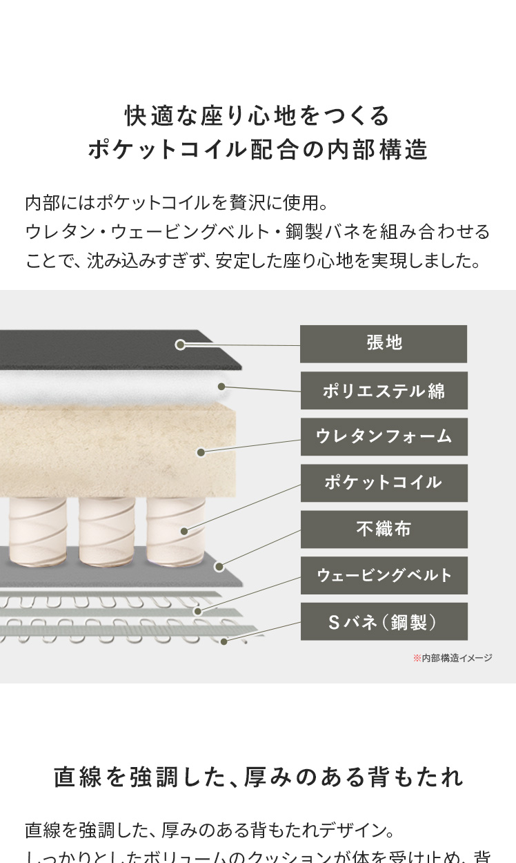 | 材質 | ウェービングベルト、ポケットコイル、鋼製バネ、ウレタン、スチール(粉体塗装仕上げ)、合成皮革(PU)、ウレタンフォーム |