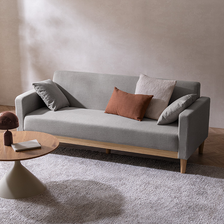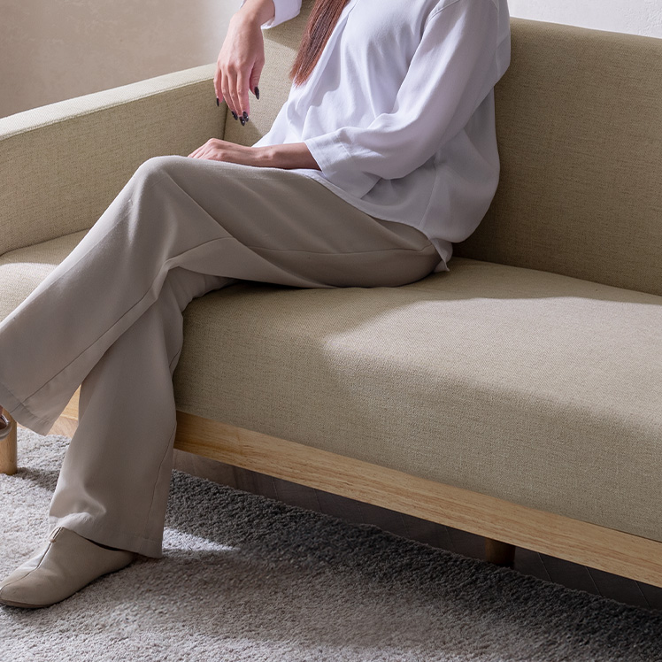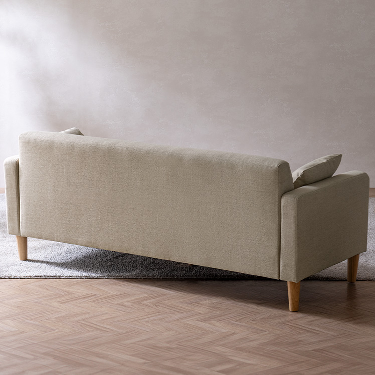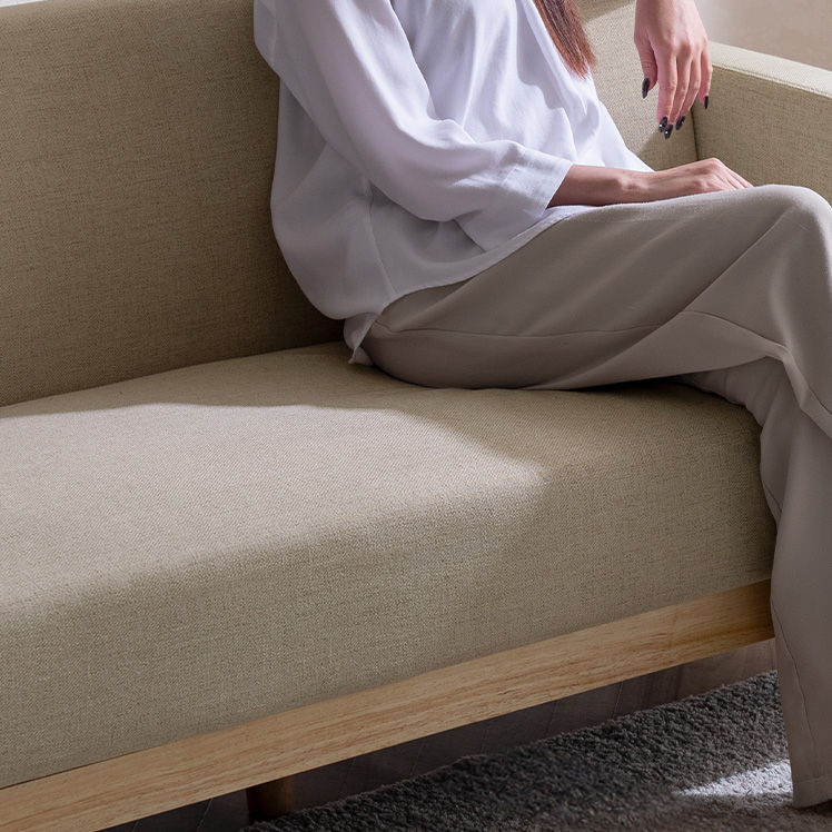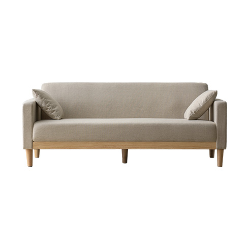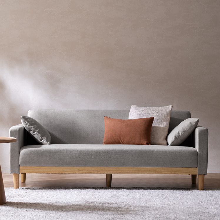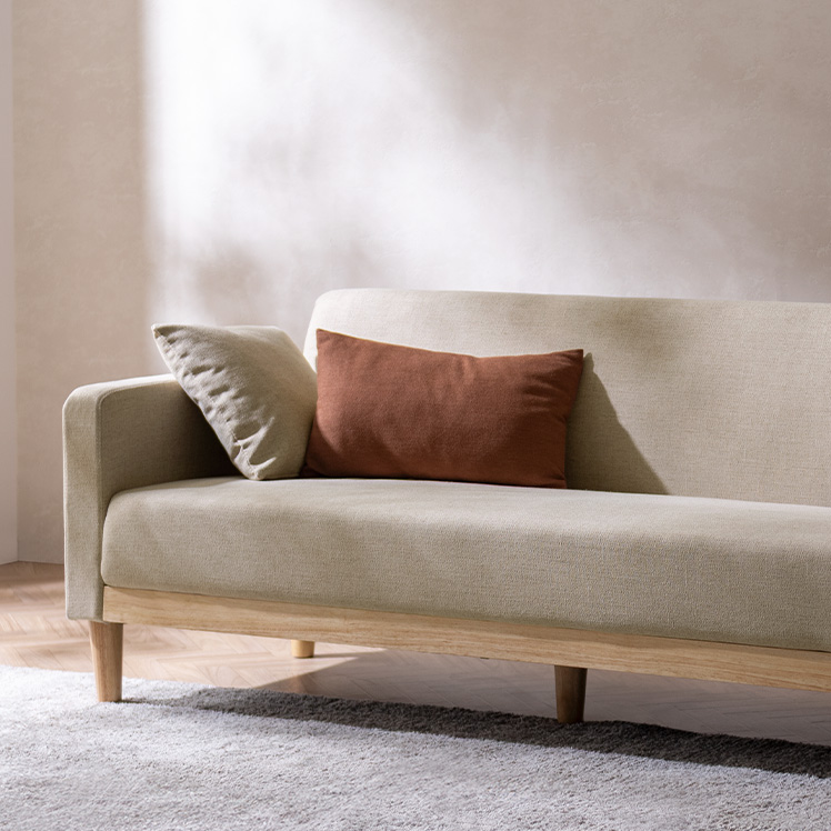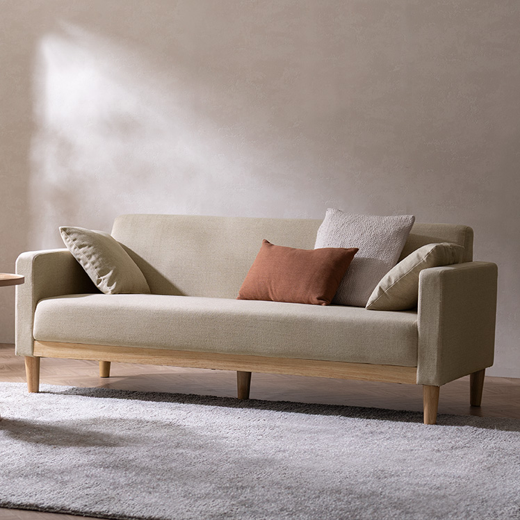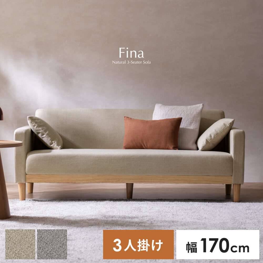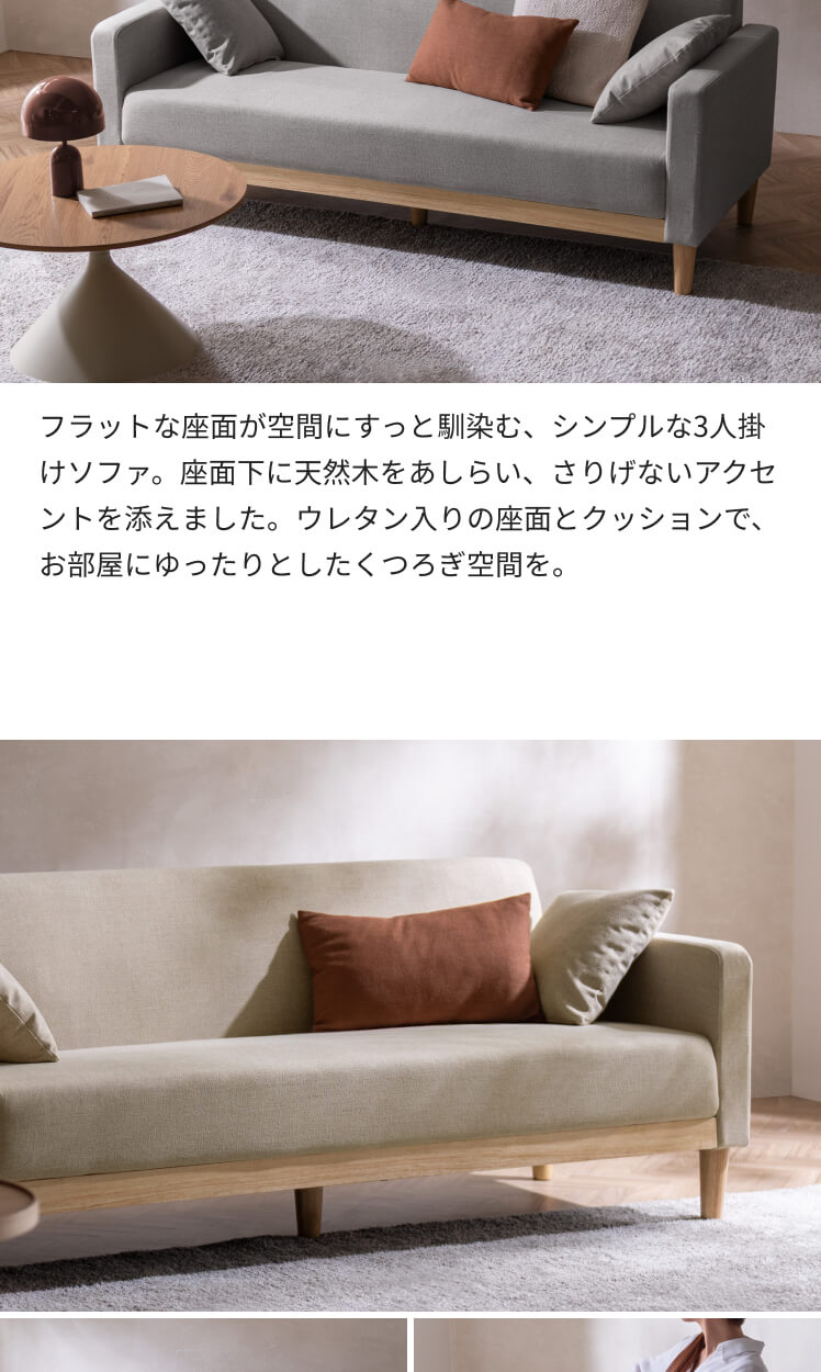3Pソファ Fina〔フィーナ〕/フラットな座面が空間にすっと馴染む、シンプルな3人掛けソファ。座面下に天然木をあしらい、さりげないアクセントを添えました。ウレタン入りの座面とクッションで、お部屋にゆったりとしたくつろぎ空間を。