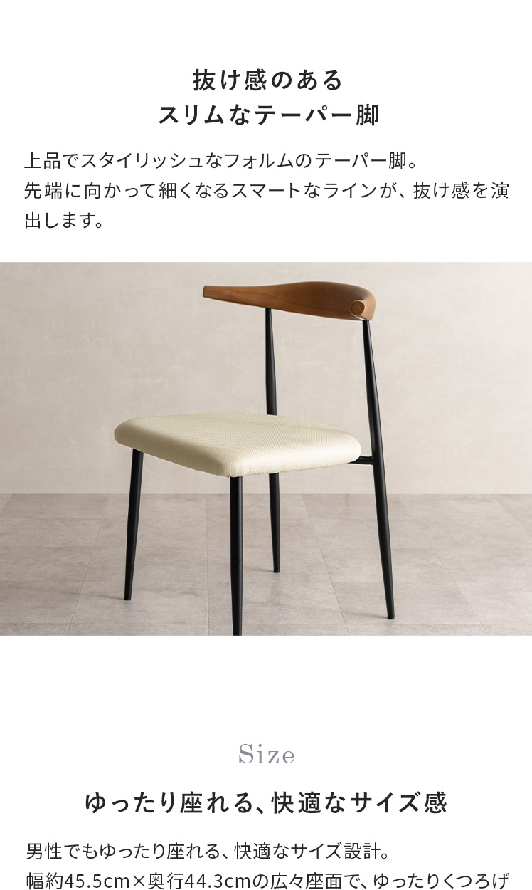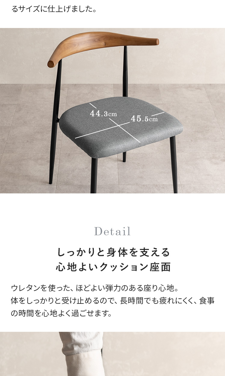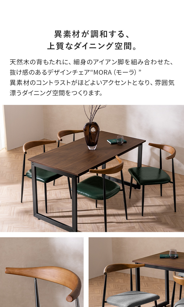 ダイニングチェア MORA〔モーラ〕2脚セット/天然木の背もたれに、細身のアイアン脚を組み合わせた、抜け感のあるデザインチェア。異素材のコントラストがほどよいアクセントとなり、雰囲気漂うダイニング空間をつくります。