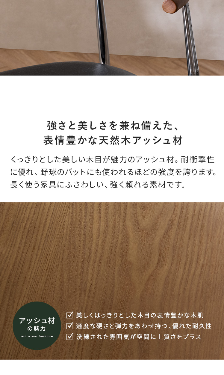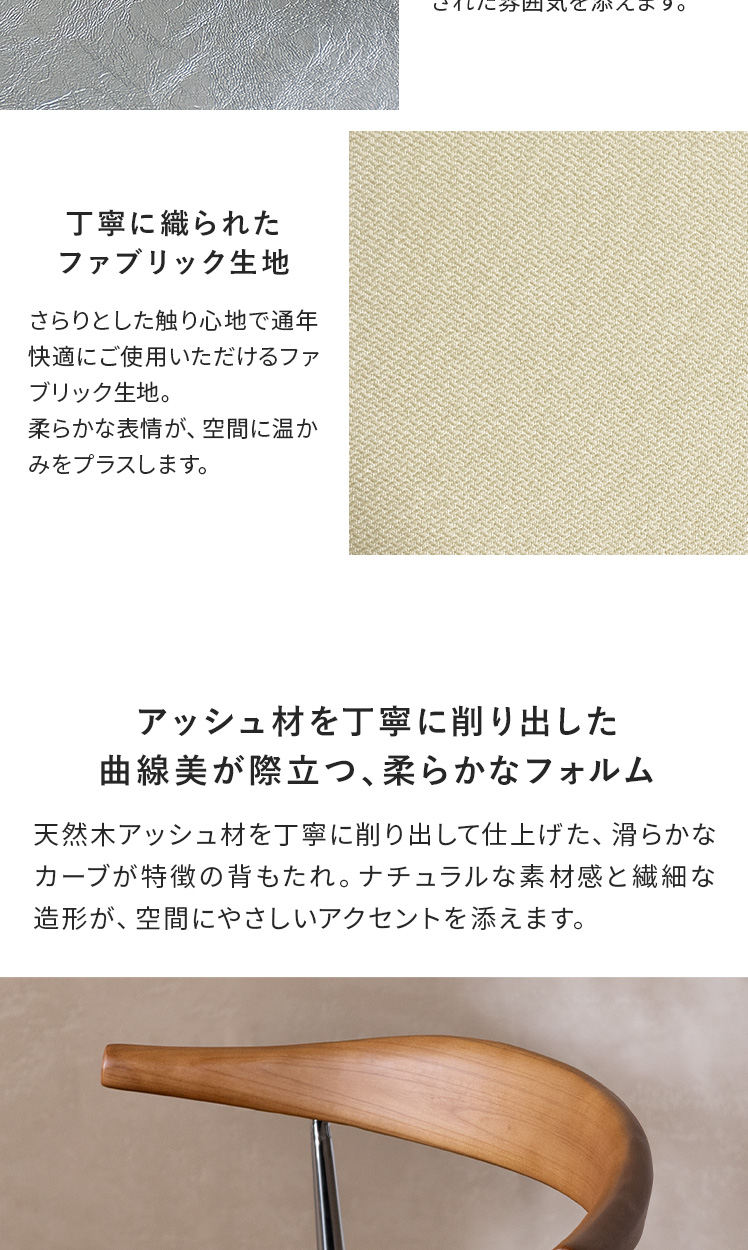 | 材質 | 天然木、クッション材/ウレタンフォーム、張地/ファブリックタイプ=ポリエステル、レザータイプ=合成皮革(ポリウレタン)、スチール(粉体塗装仕上げ) |