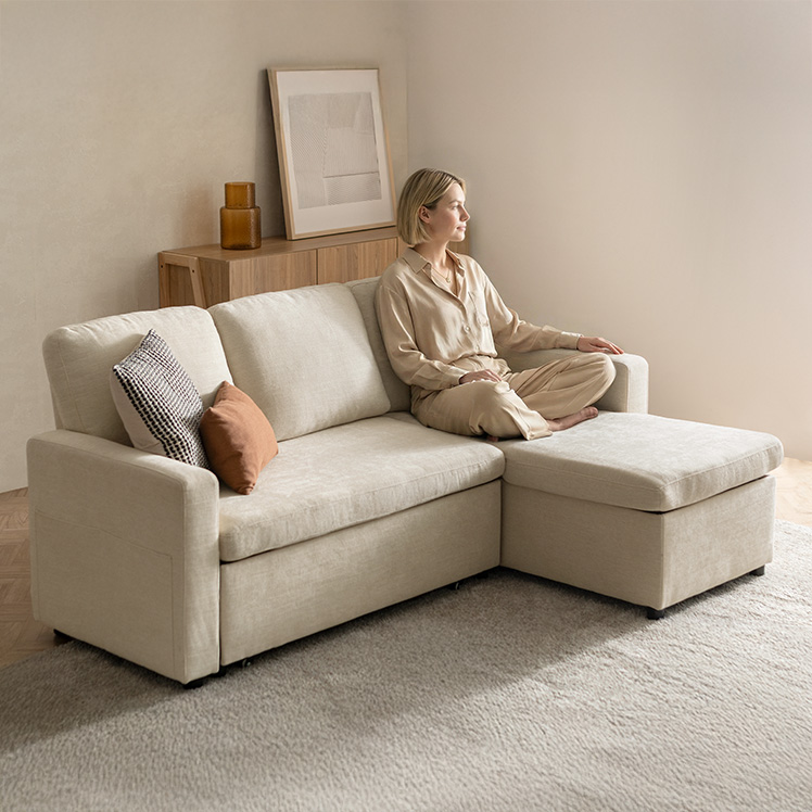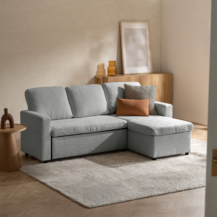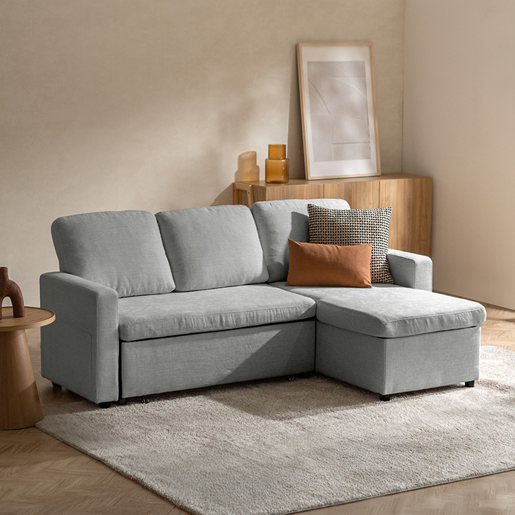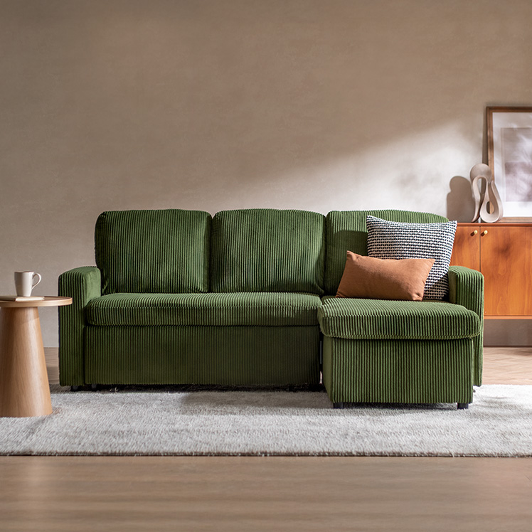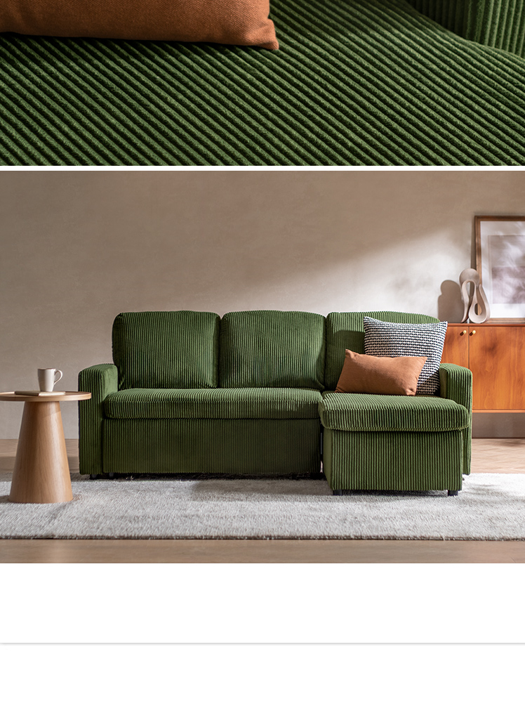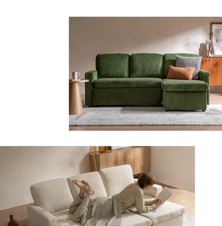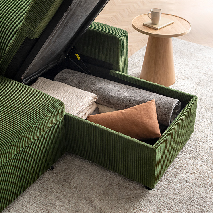 収納付き2WAYカウチソファ Owen〔オーウェン〕/座面を引出すだけで、カウチソファからベッドへ早変わり。ファブリック・コーデュロイから選べる2種類の張地と、シンプルなデザインが、どんな空間にもすっきりとなじみます。