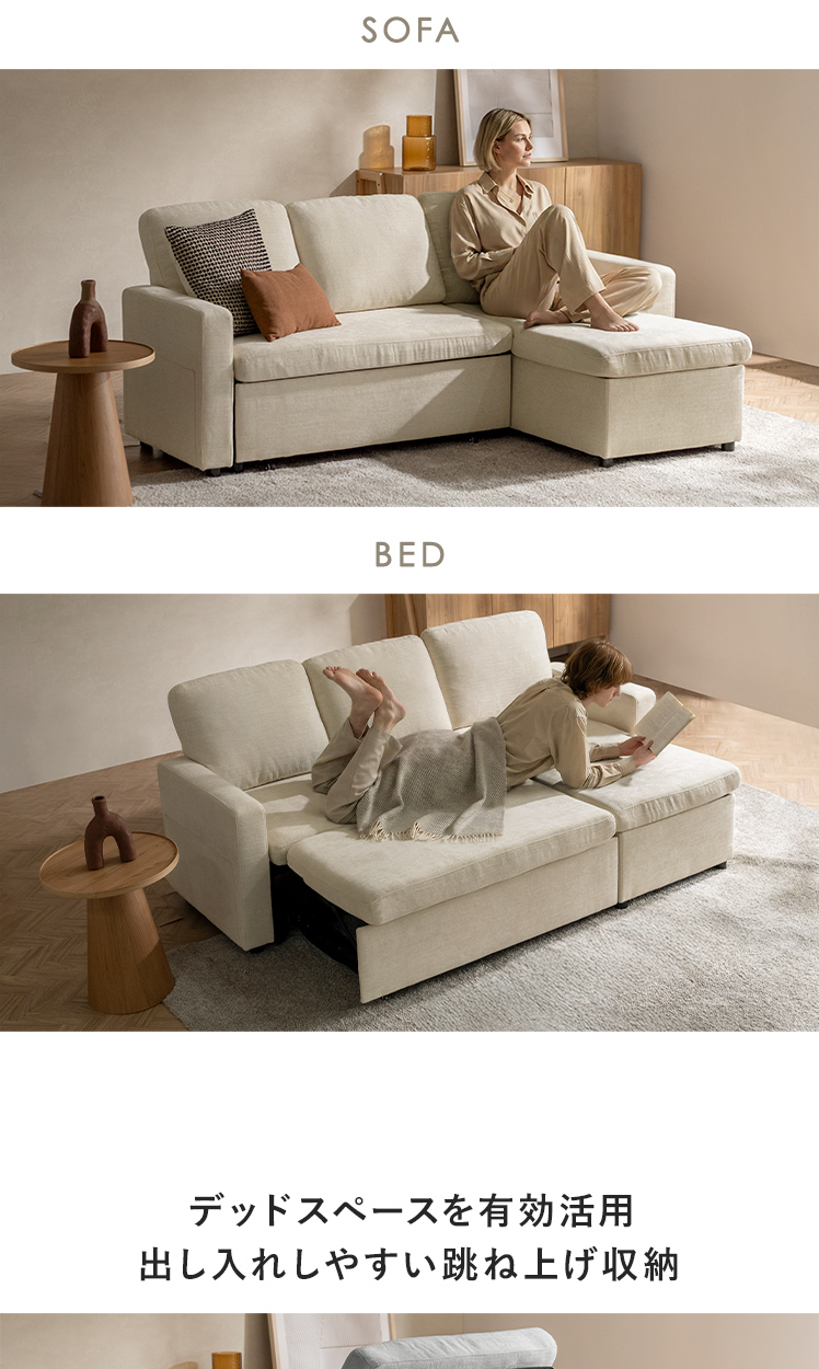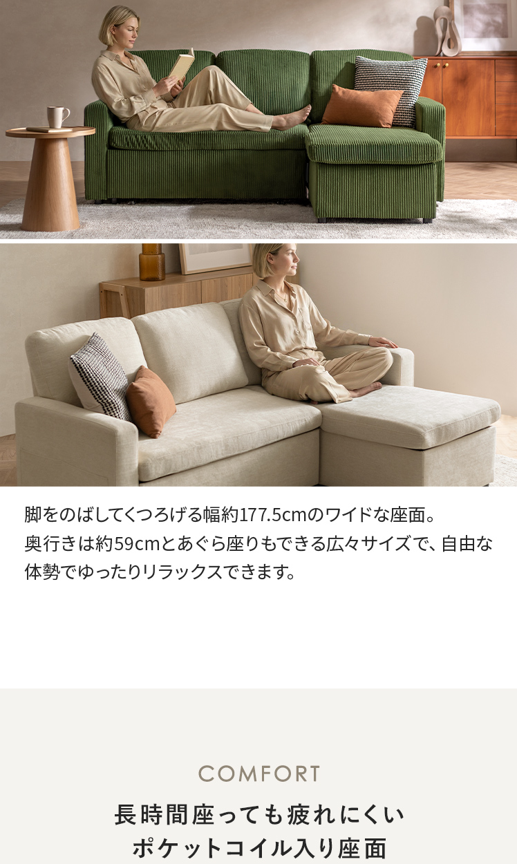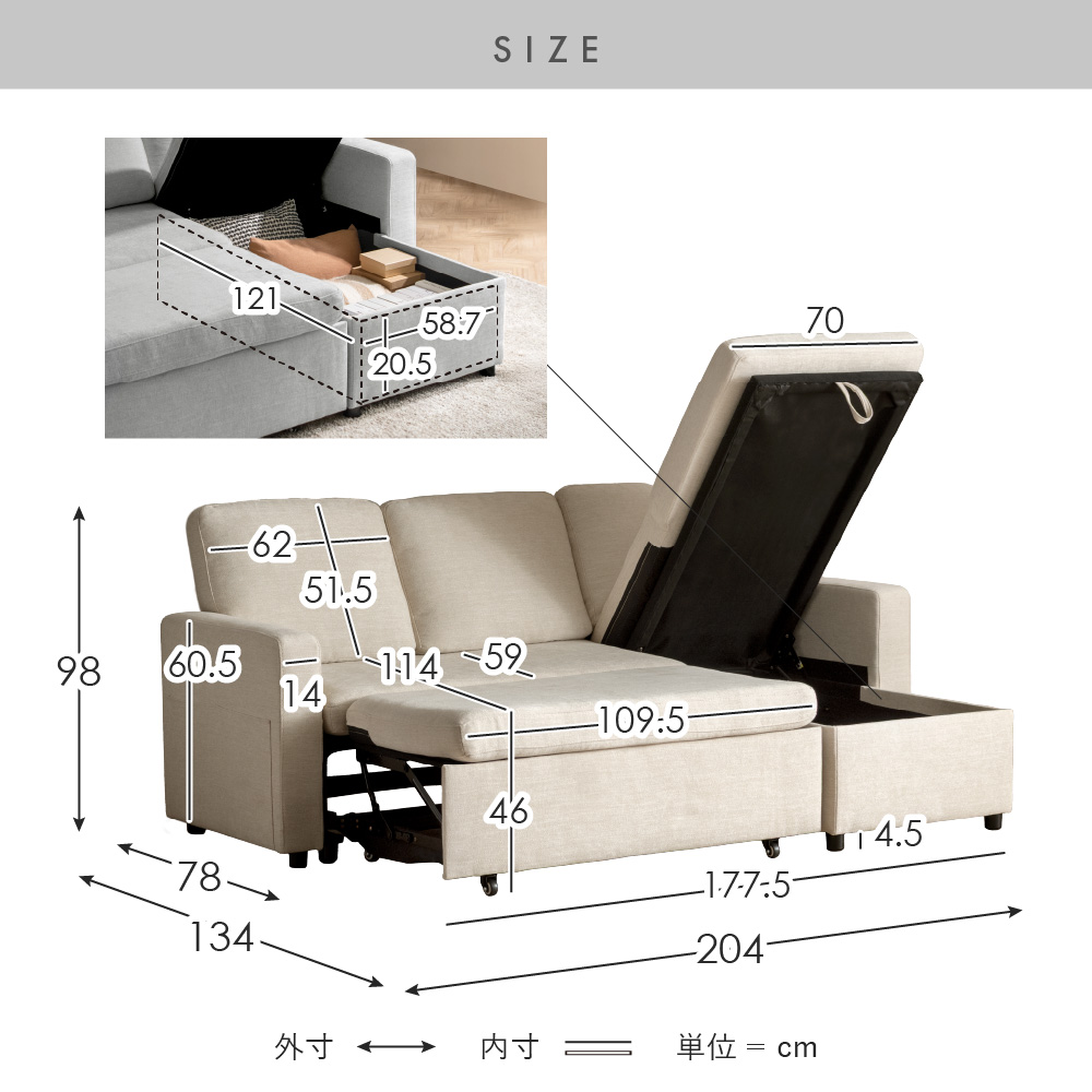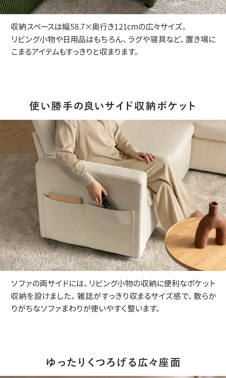 | 耐荷重 | 2P座面/約200kg、カウチ座面/約100kg、引き出し部/約100kg、カウチ収納部/約30kg |