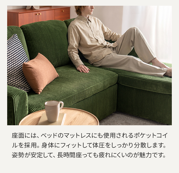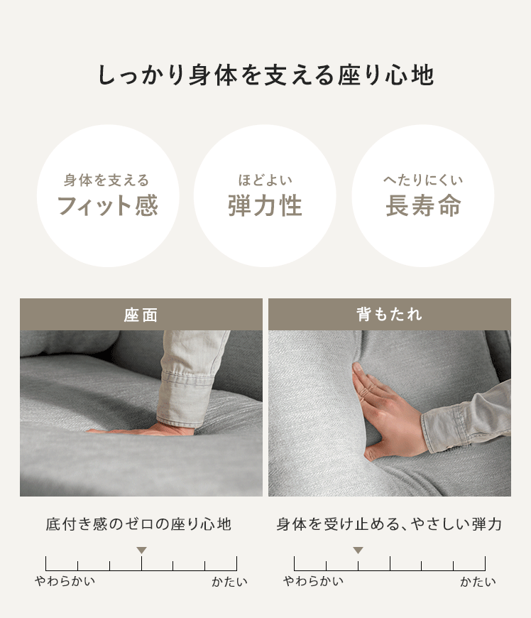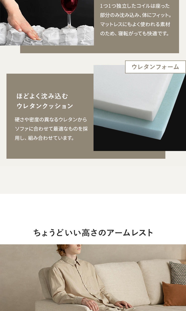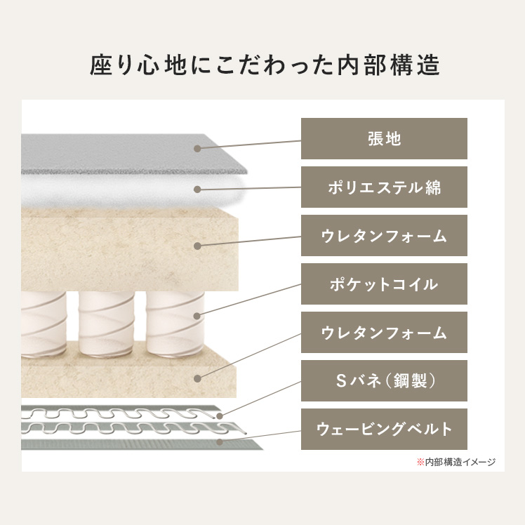 | 材質 | 本体/スチールフレーム、鋼製バネ、ウレタン、ポケットコイル、ウェービングベルト、ポリエステル綿、天然木 脚/プラスチック 張地/ポリエステル100% クッション材/ポリエステル綿、ウレタンフォーム |
