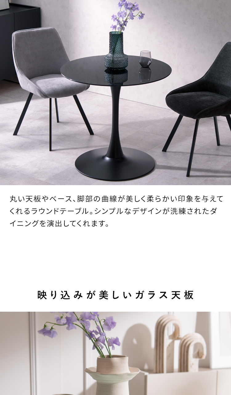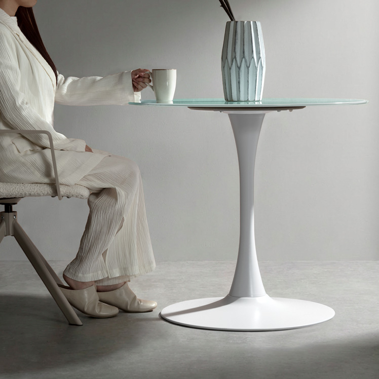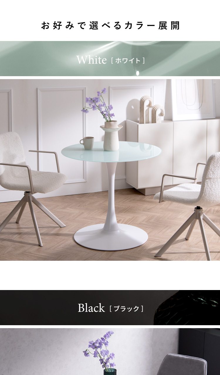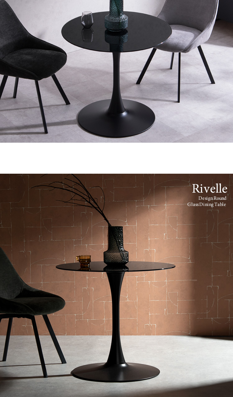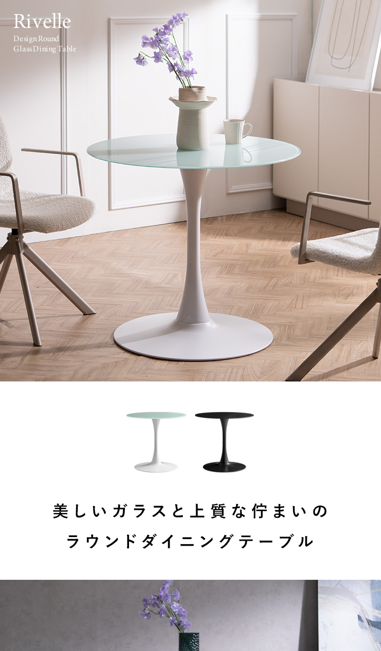円形ダイニングテーブル Rivelle〔リヴェル〕/反射や映り込みが美しいガラス天板と曲線を描く一本脚が特徴のラウンドダイニングテーブル。立ち座りしやすいラウンドタイプでお食事やカフェタイムも快適です。カラーはホワイトとブラックの2カラーからお部屋の雰囲気やお好みでお選びいただけます。