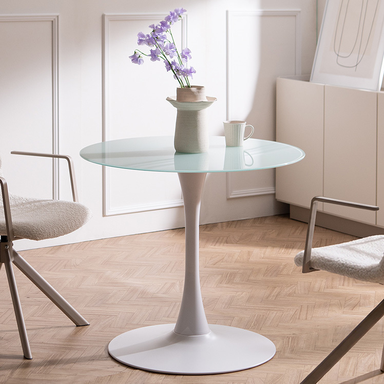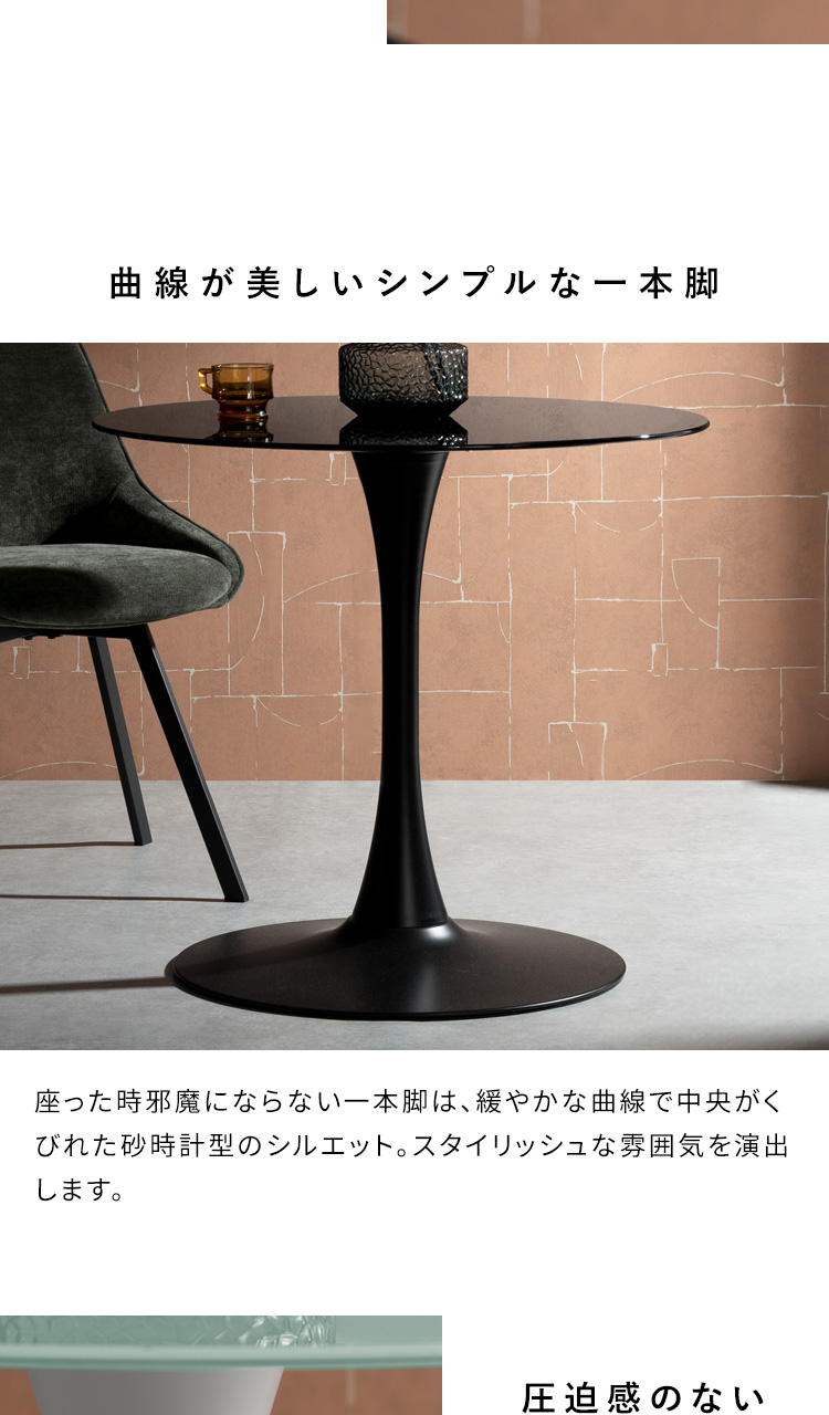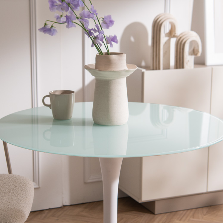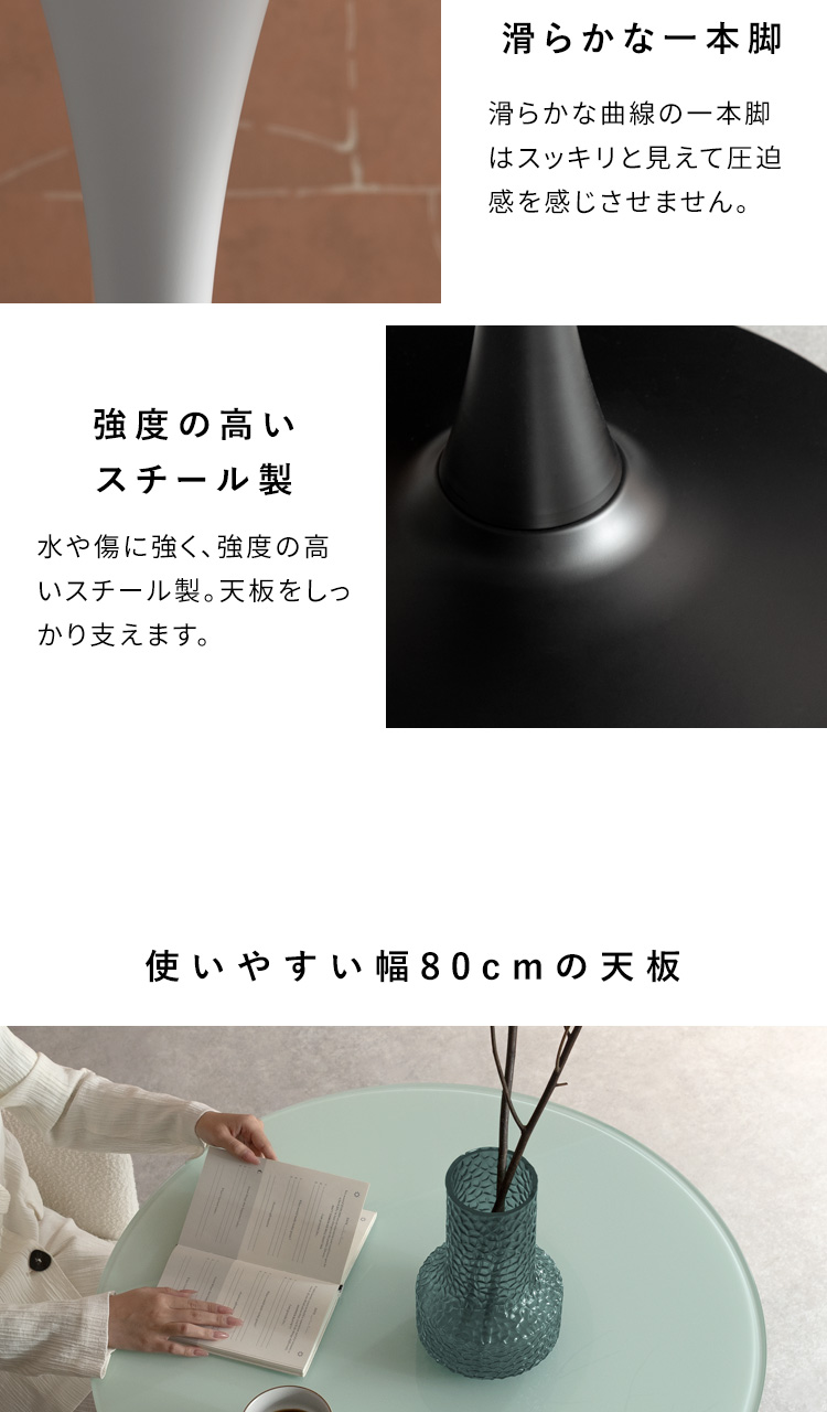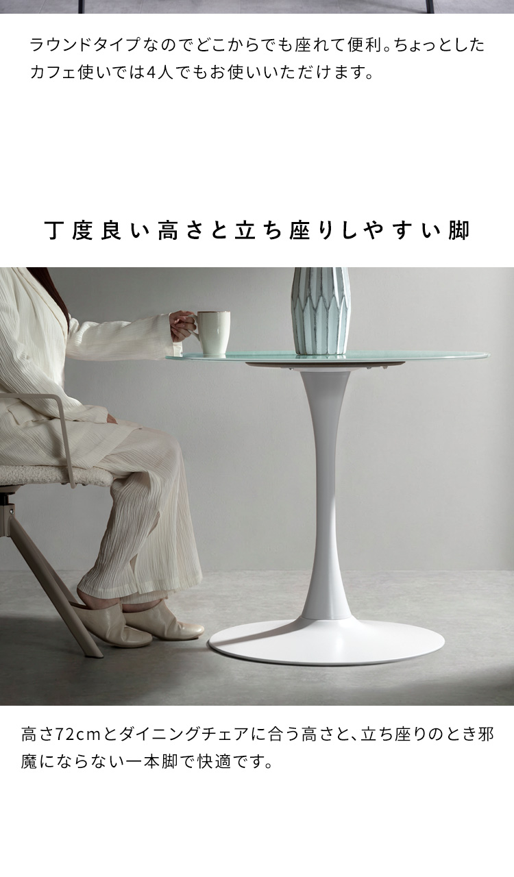 円形ダイニングテーブル Rivelle〔リヴェル〕/反射や映り込みが美しいガラス天板と曲線を描く一本脚が特徴のラウンドダイニングテーブル。立ち座りしやすいラウンドタイプでお食事やカフェタイムも快適です。カラーはホワイトとブラックの2カラーからお部屋の雰囲気やお好みでお選びいただけます。