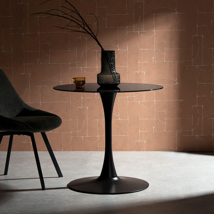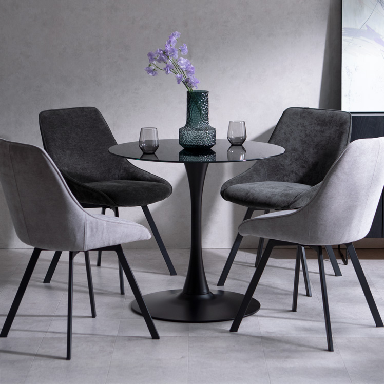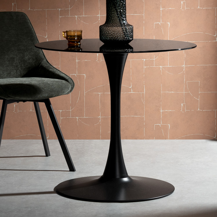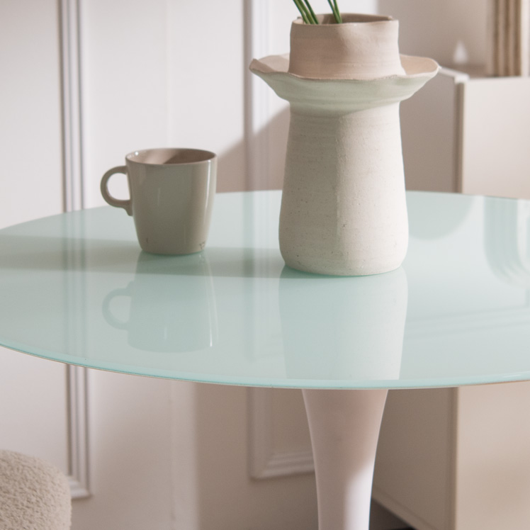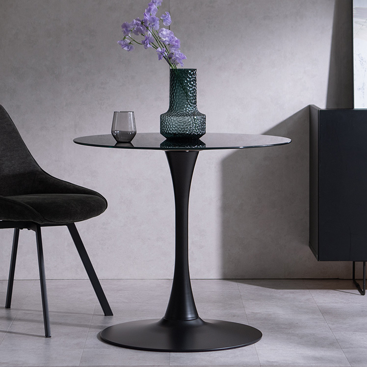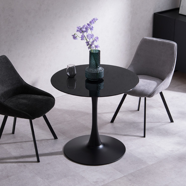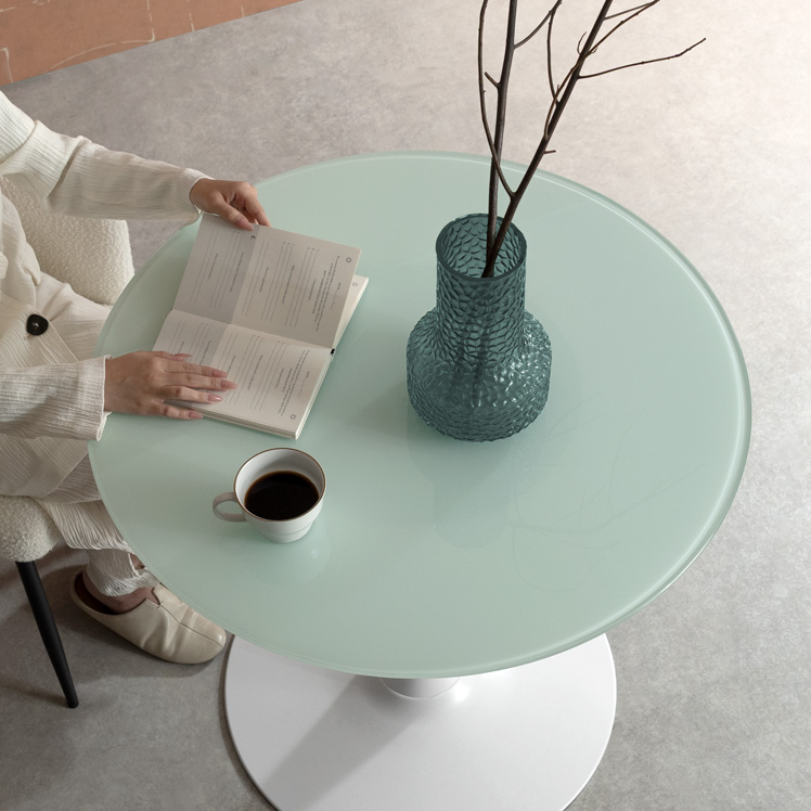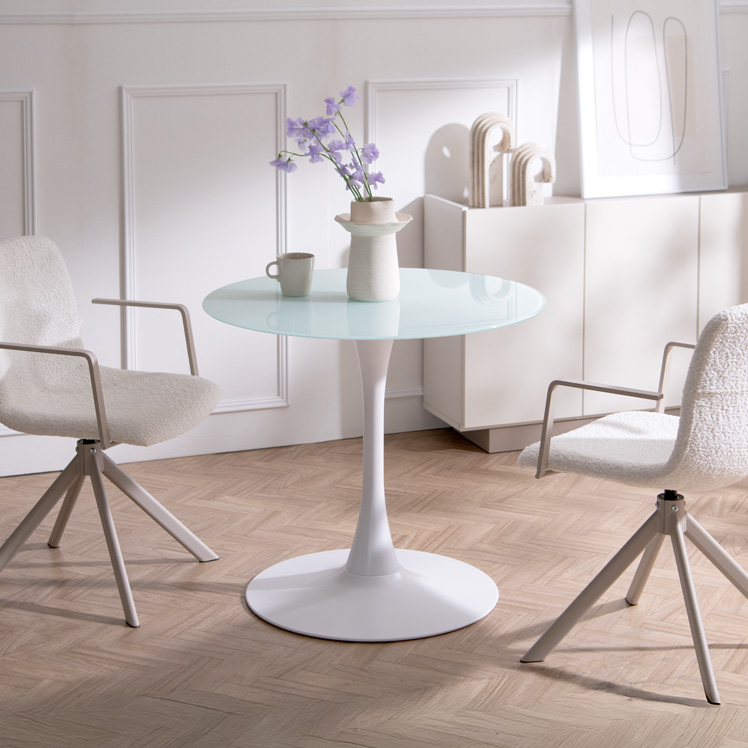 円形ダイニングテーブル Rivelle〔リヴェル〕/反射や映り込みが美しいガラス天板と曲線を描く一本脚が特徴のラウンドダイニングテーブル。立ち座りしやすいラウンドタイプでお食事やカフェタイムも快適です。カラーはホワイトとブラックの2カラーからお部屋の雰囲気やお好みでお選びいただけます。