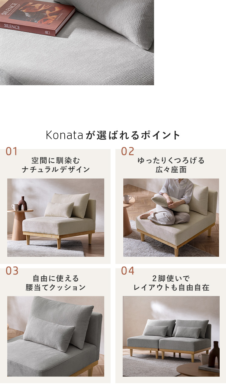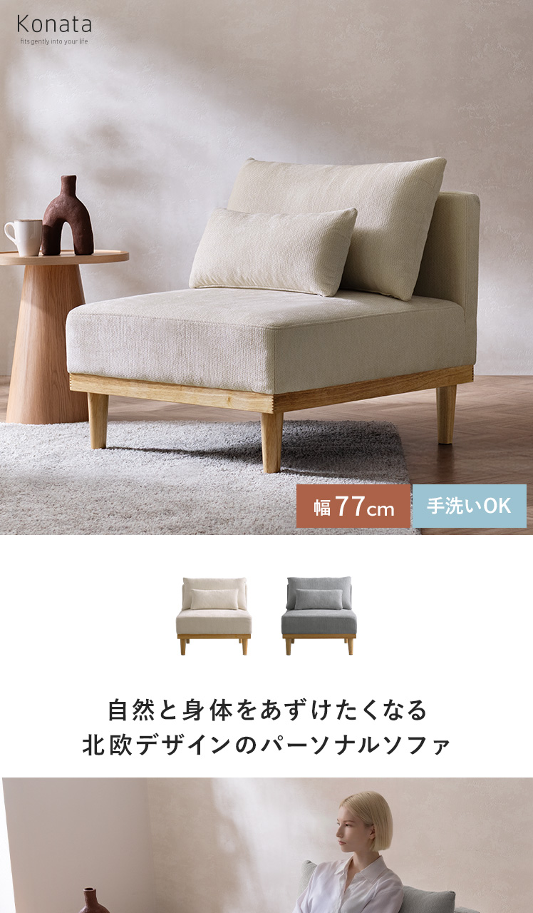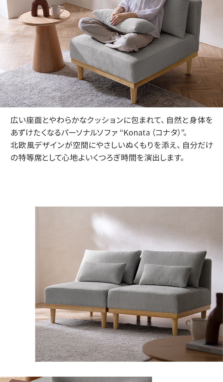 北欧デザインのパーソナルソファ Konata〔コナタ〕/広い座面とやわらかなクッションに包まれて、自然と身体をあずけたくなるパーソナルソファ“Konata(コナタ)”。北欧風デザインが空間にやさしいぬくもりを添え、自分だけの特等席として心地よいくつろぎ時間を演出します。