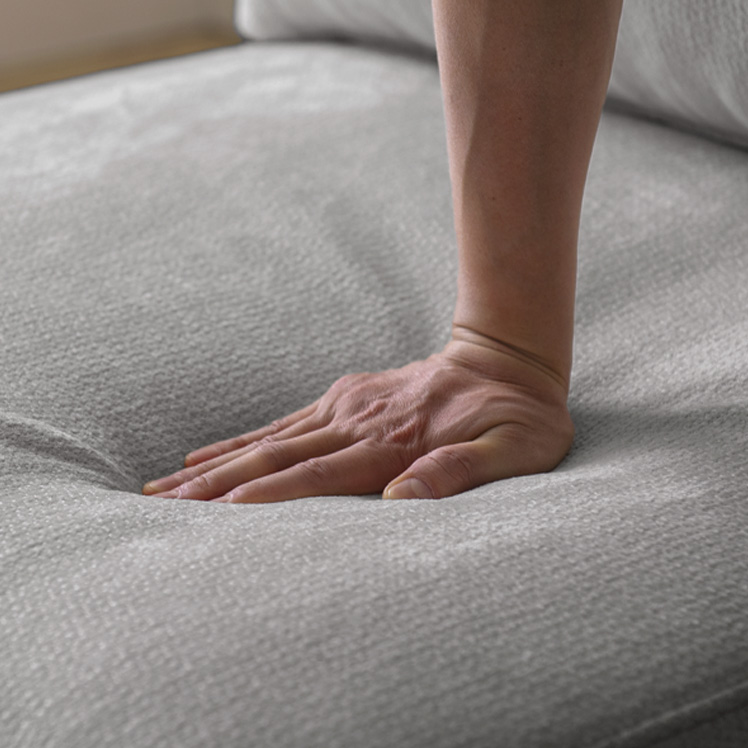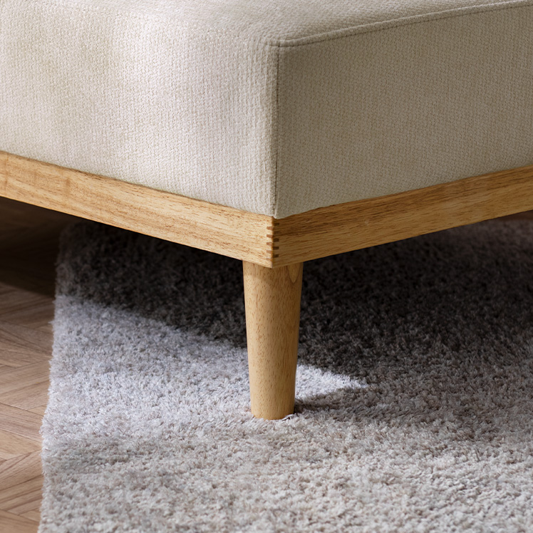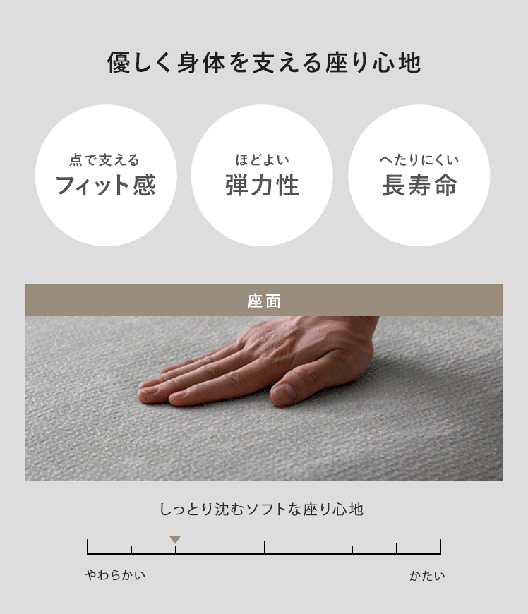 | 材質 | 天然木(ラッカー塗装仕上げ)、ウェービングベルト、鋼製バネ、ポリエステル、ウレタンフォーム、シリコンフィル |