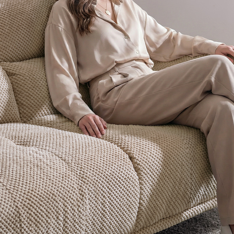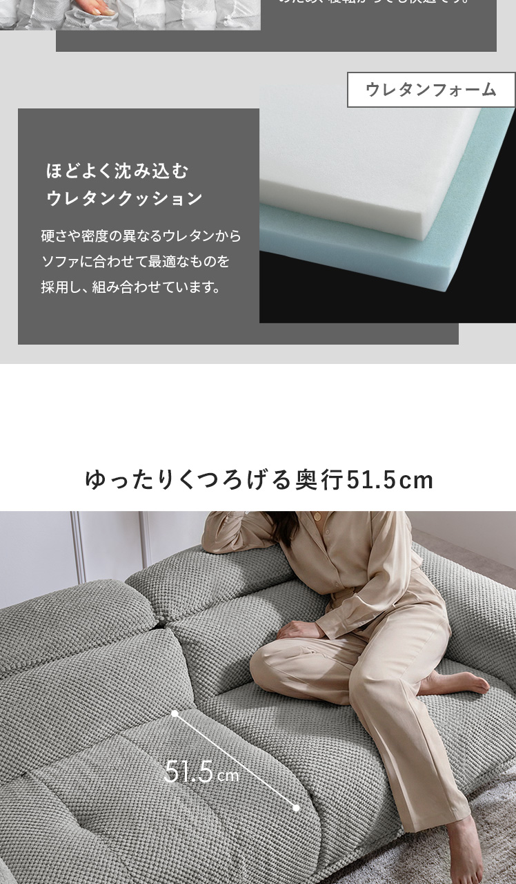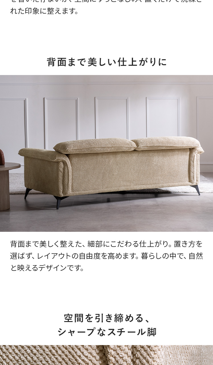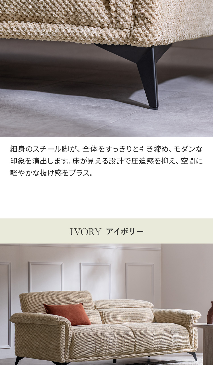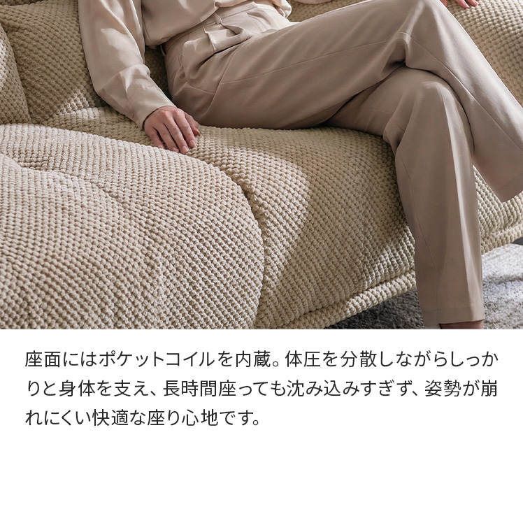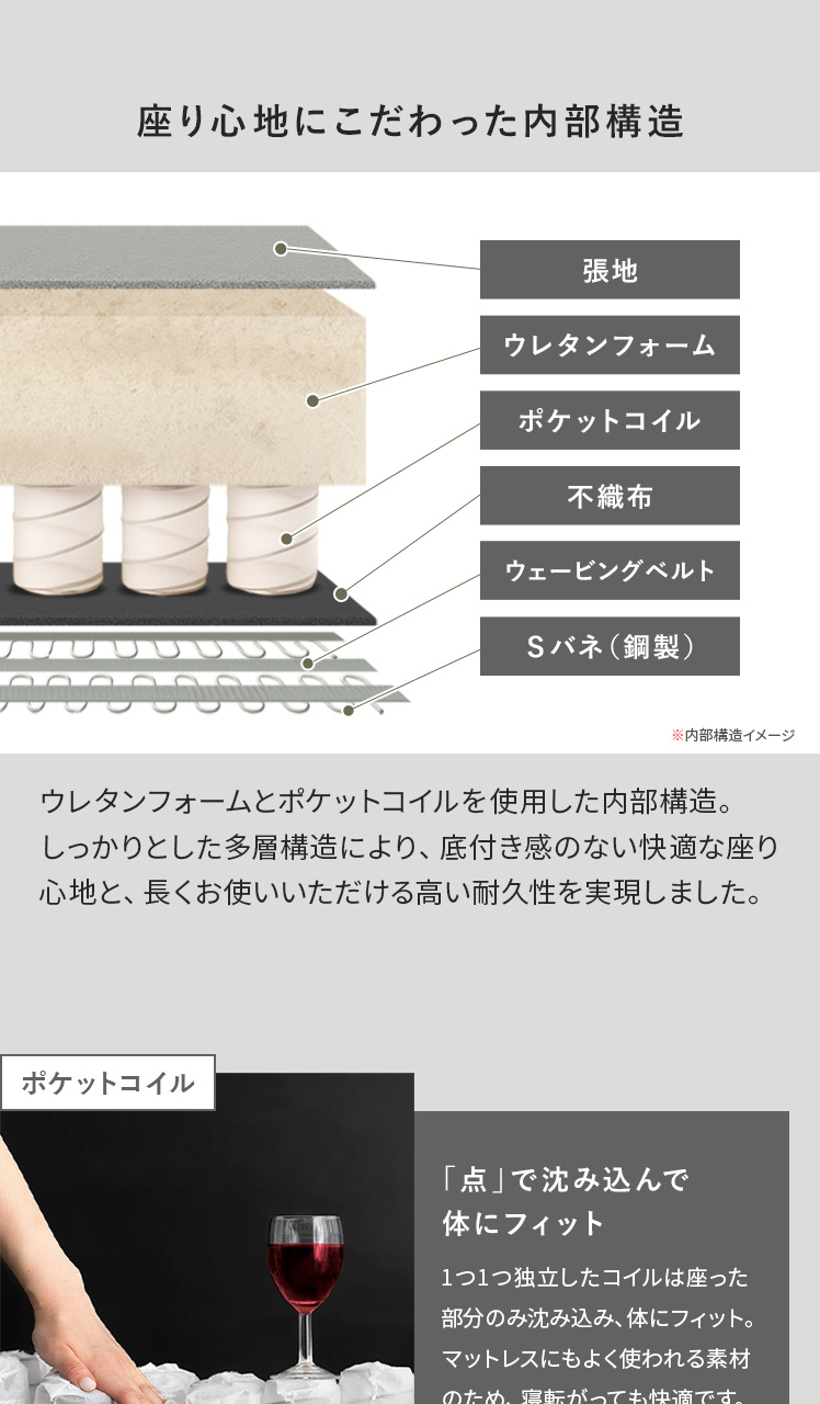 | 材質 | 本体/ポケットコイル、銅製バネ、ウレタン、ウェービングベルト 脚/スチール(粉体塗装仕上げ) 張地/ポリエステル100% クッション材/ウレタンフォーム |