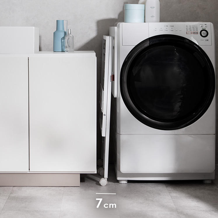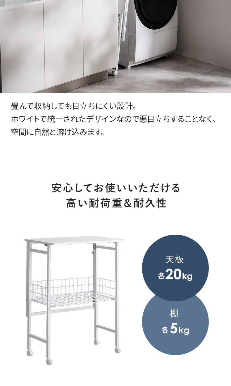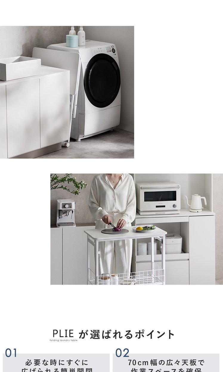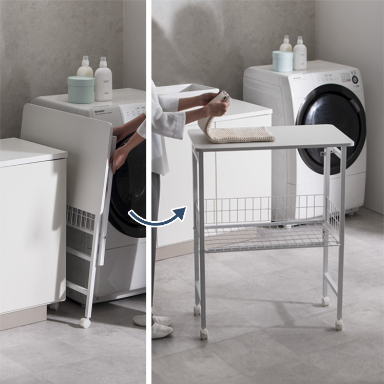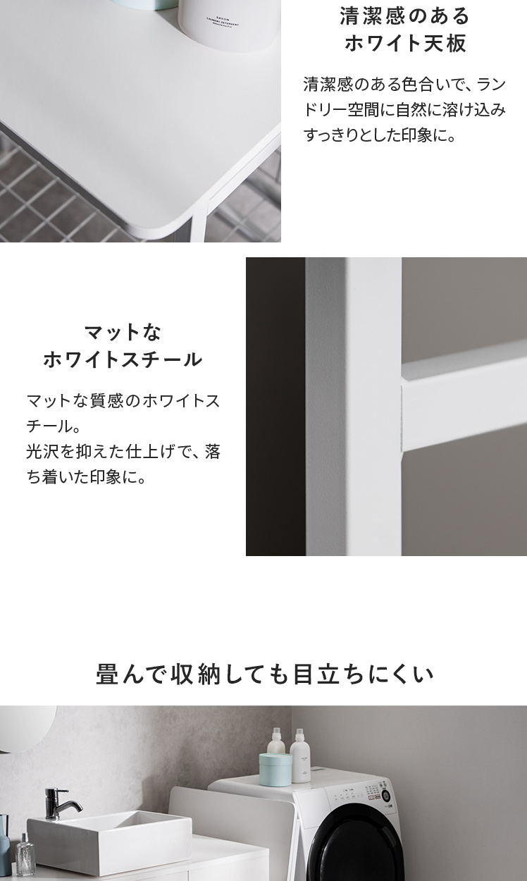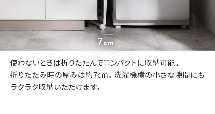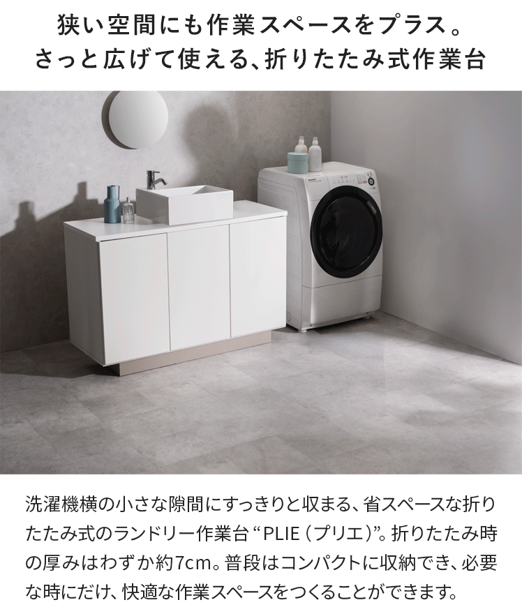 折りたためるランドリー作業台 PLIE〔プリエ〕/洗濯機横の小さな隙間にすっきりと収まる、省スペースな折りたたみ式のランドリー作業台。折りたたみ時の厚みはわずか約7cm。普段はコンパクトに収納でき、必要な時にだけ、快適な作業スペースをつくることができます。