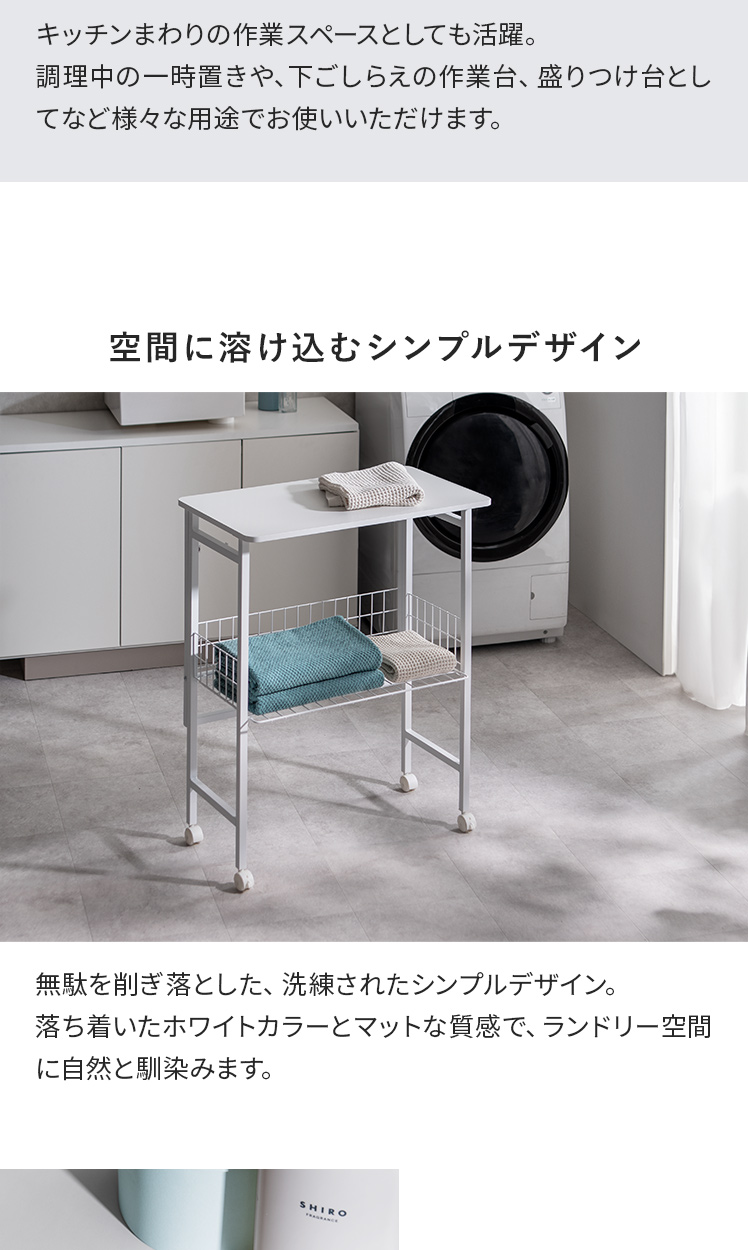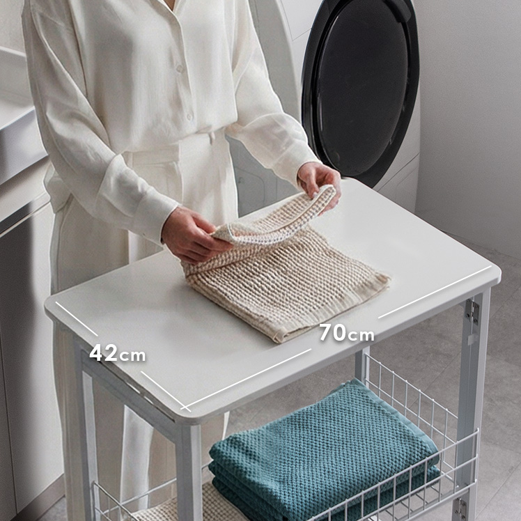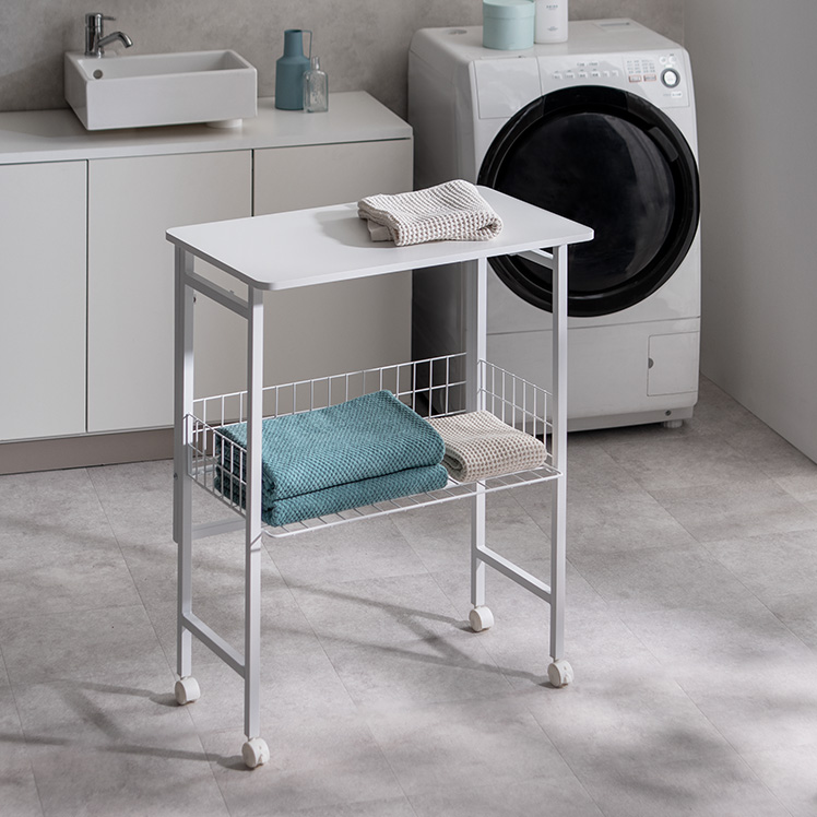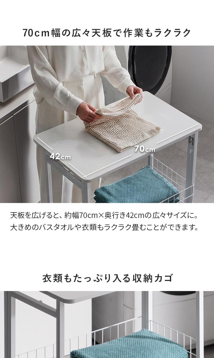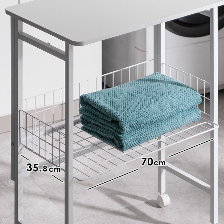 ランドリー作業台 折りたたみ式 作業台 幅70cm ランドリーワゴン 収納 キッチンワゴン キッチン作業台 省スペース コンパクト 幅7cm 隙間収納 作業スペース キャスター付き ロック機能付き 収納かご フック付き 作業机 棚付き スリム ストッパー付き ランドリー キッチン 盛りつけ台 洗濯物置き シンプル ホワイト