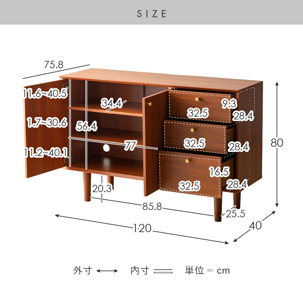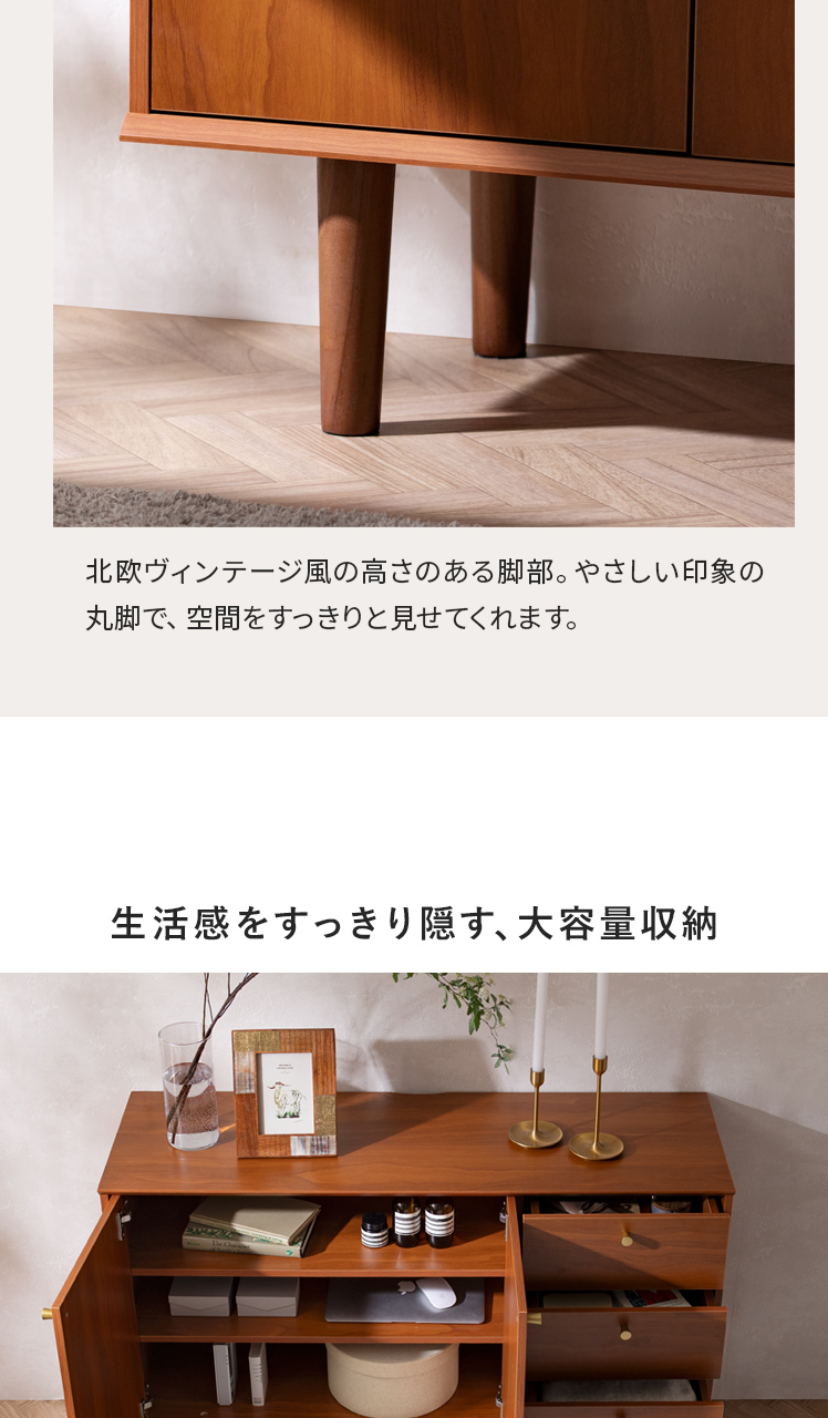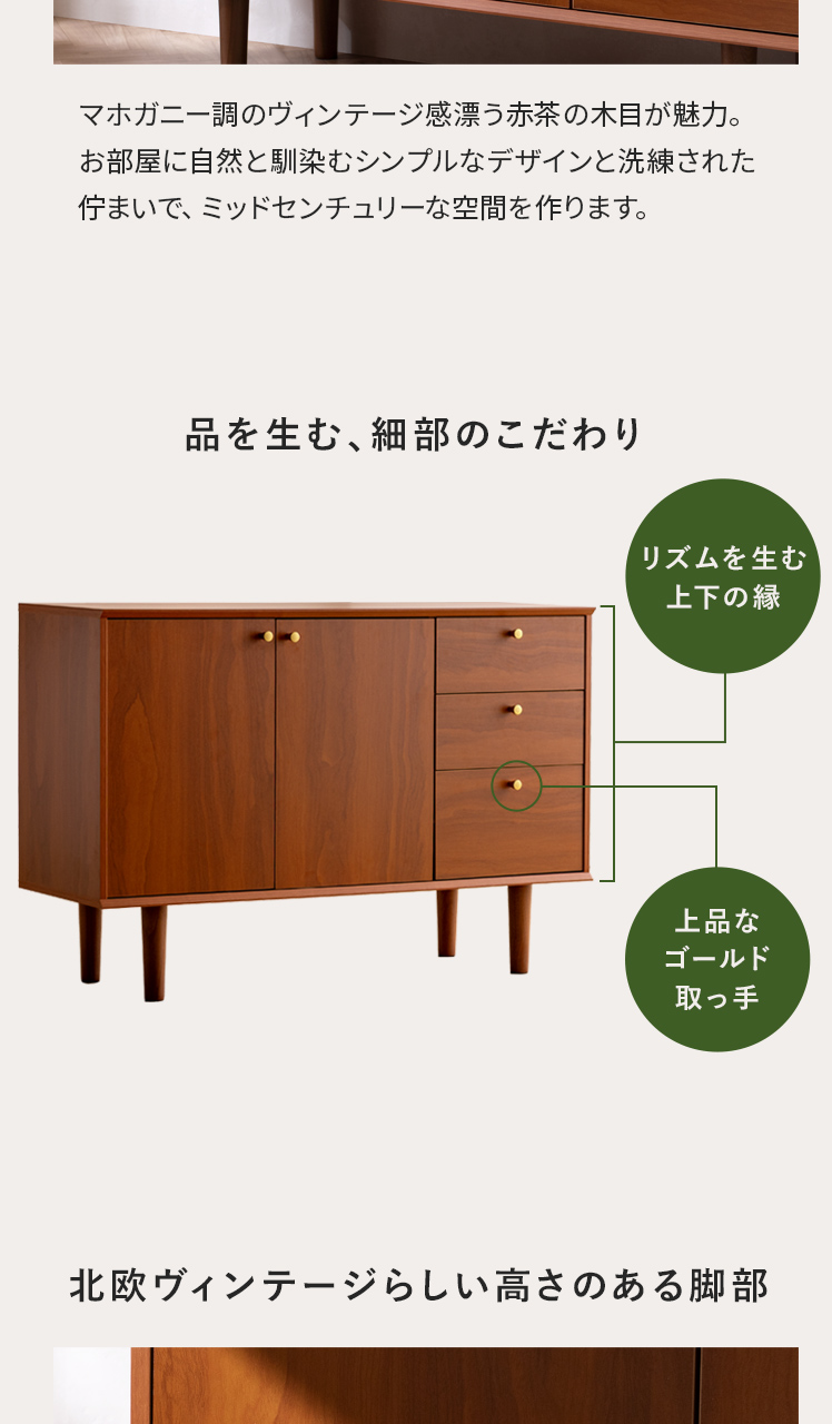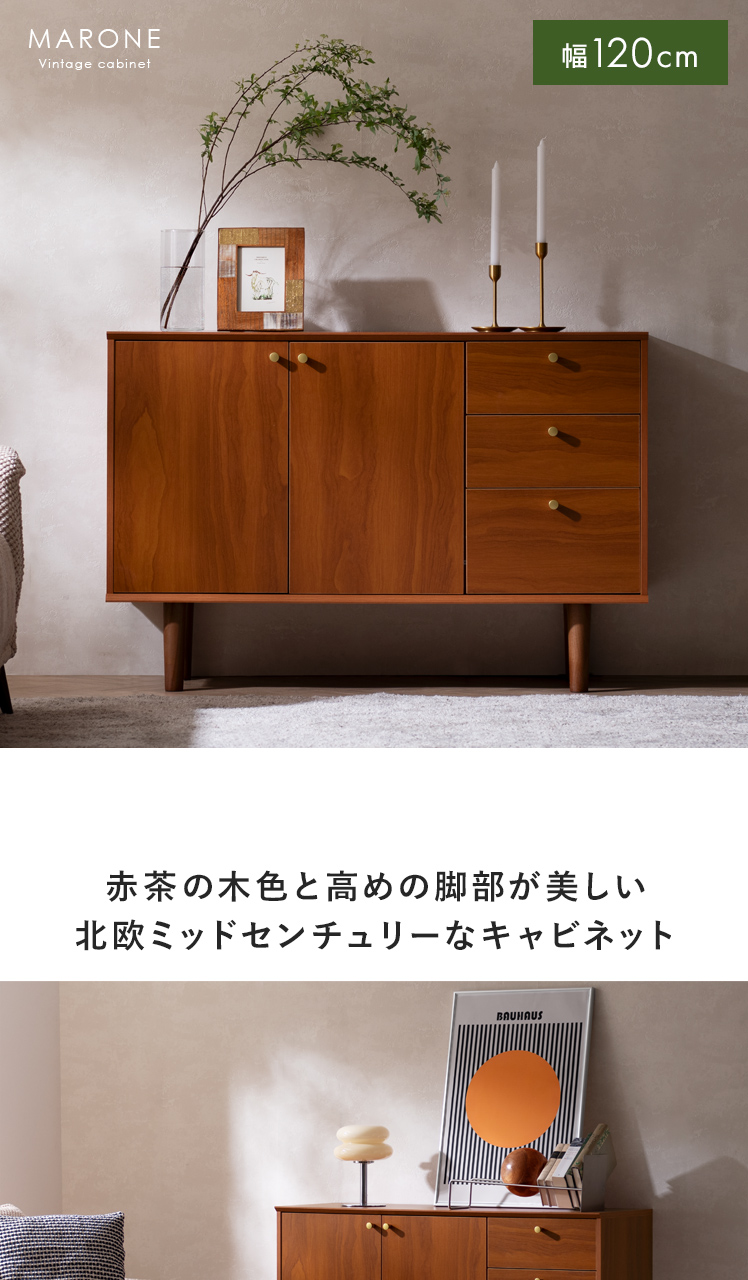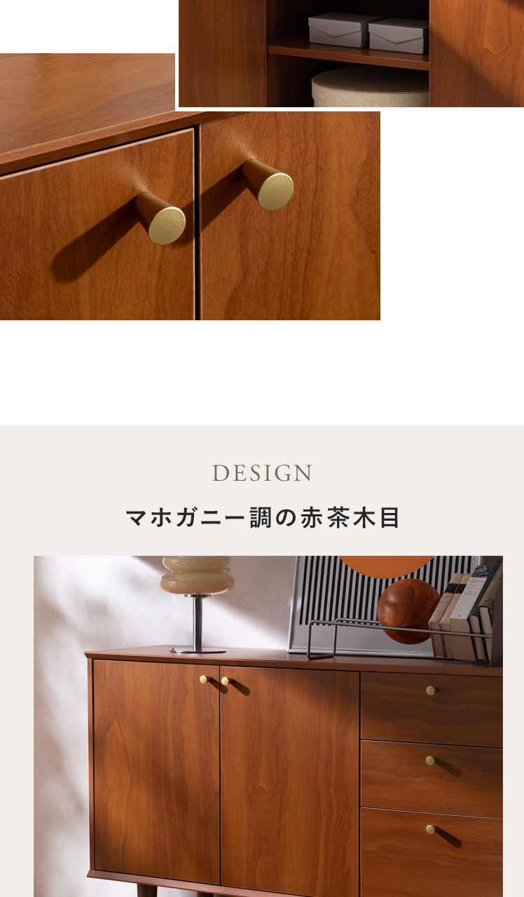 収納家具 チェスト ラック 収納 棚 幅120cm シェルフ リビング収納 寝室 ダイニング キャビネット 引き出し 扉収納 可動棚 11段階 マホガニー調 木目調 木製 丸脚 大容量 小物収納 収納棚 コード穴 コードスリット ディスプレイスペース メラミン モダン 北欧 ミッドセンチュリー ヴィンテージ ワイド ナチュラル シンプル 上品 赤茶 ブラウン