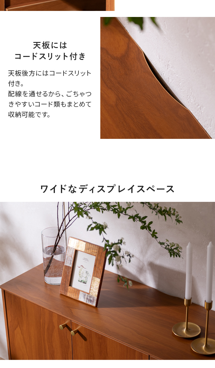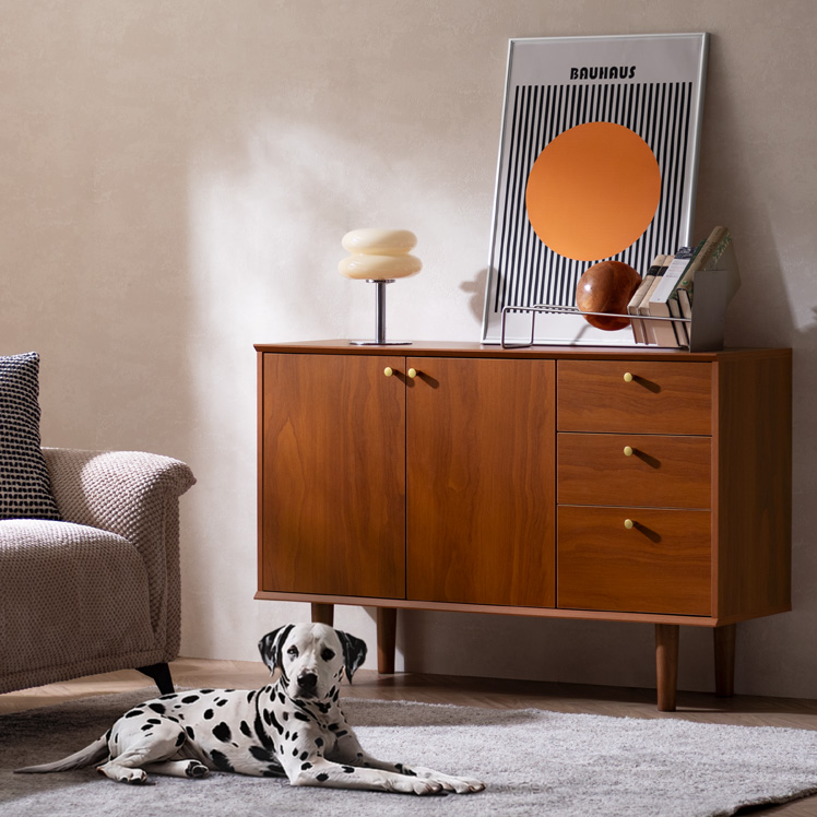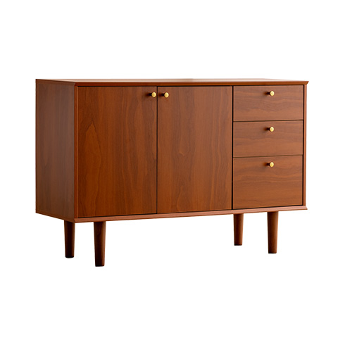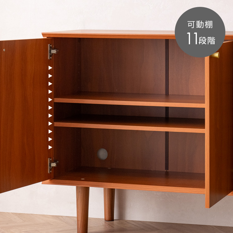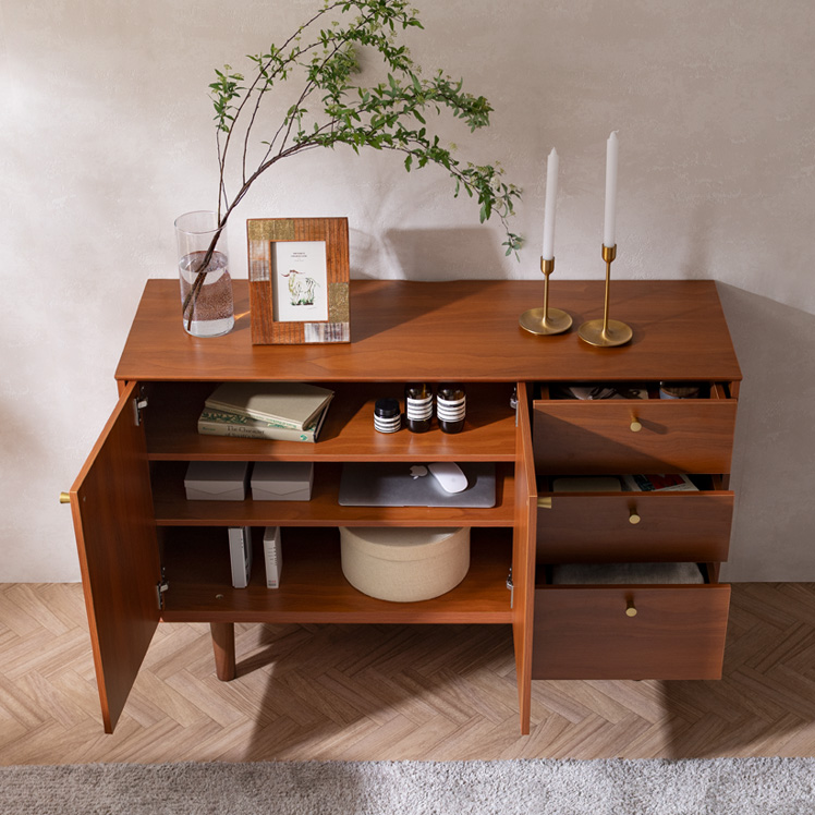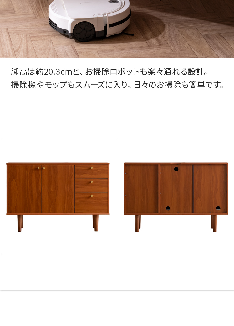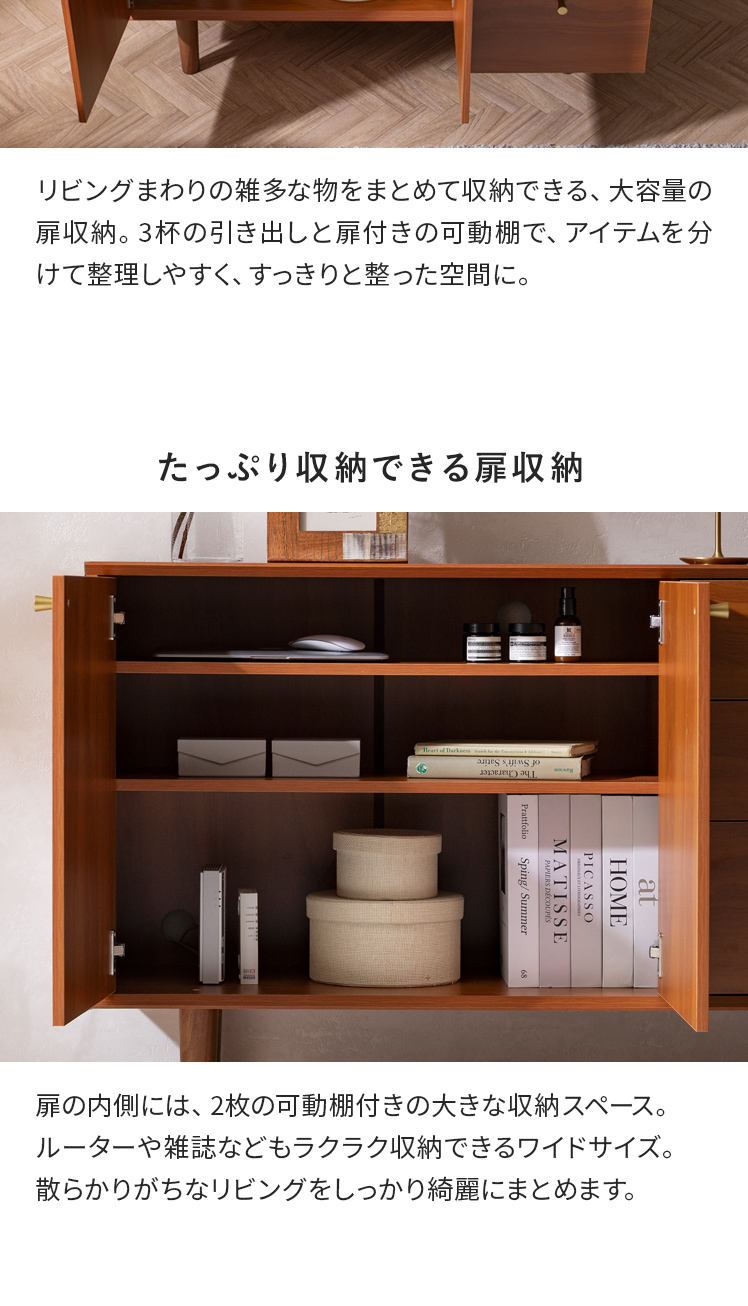 収納家具 チェスト ラック 収納 棚 幅120cm シェルフ リビング収納 寝室 ダイニング キャビネット 引き出し 扉収納 可動棚 11段階 マホガニー調 木目調 木製 丸脚 大容量 小物収納 収納棚 コード穴 コードスリット ディスプレイスペース メラミン モダン 北欧 ミッドセンチュリー ヴィンテージ ワイド ナチュラル シンプル 上品 赤茶 ブラウン