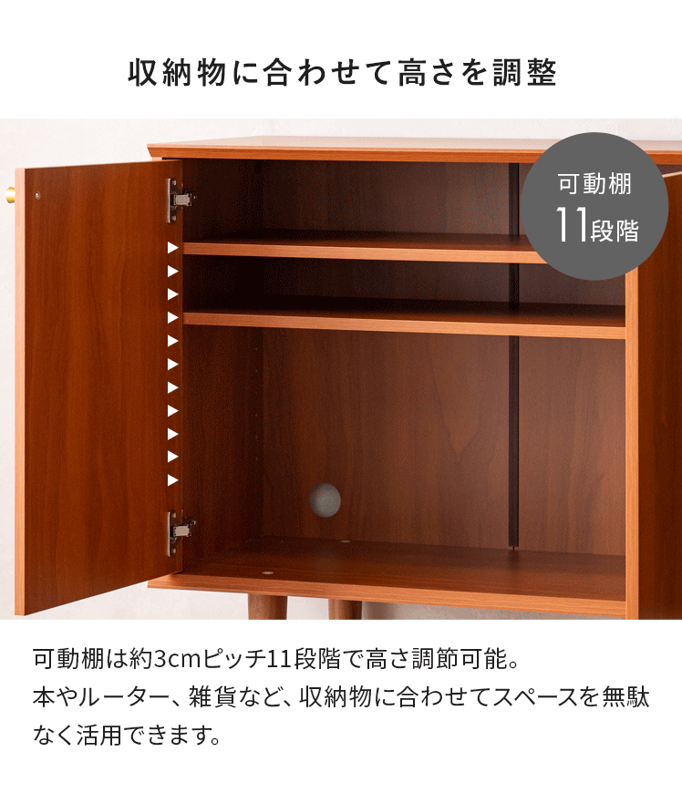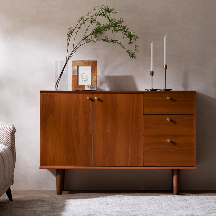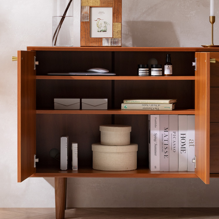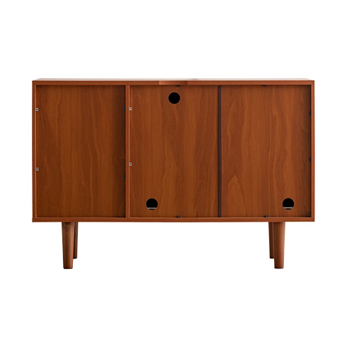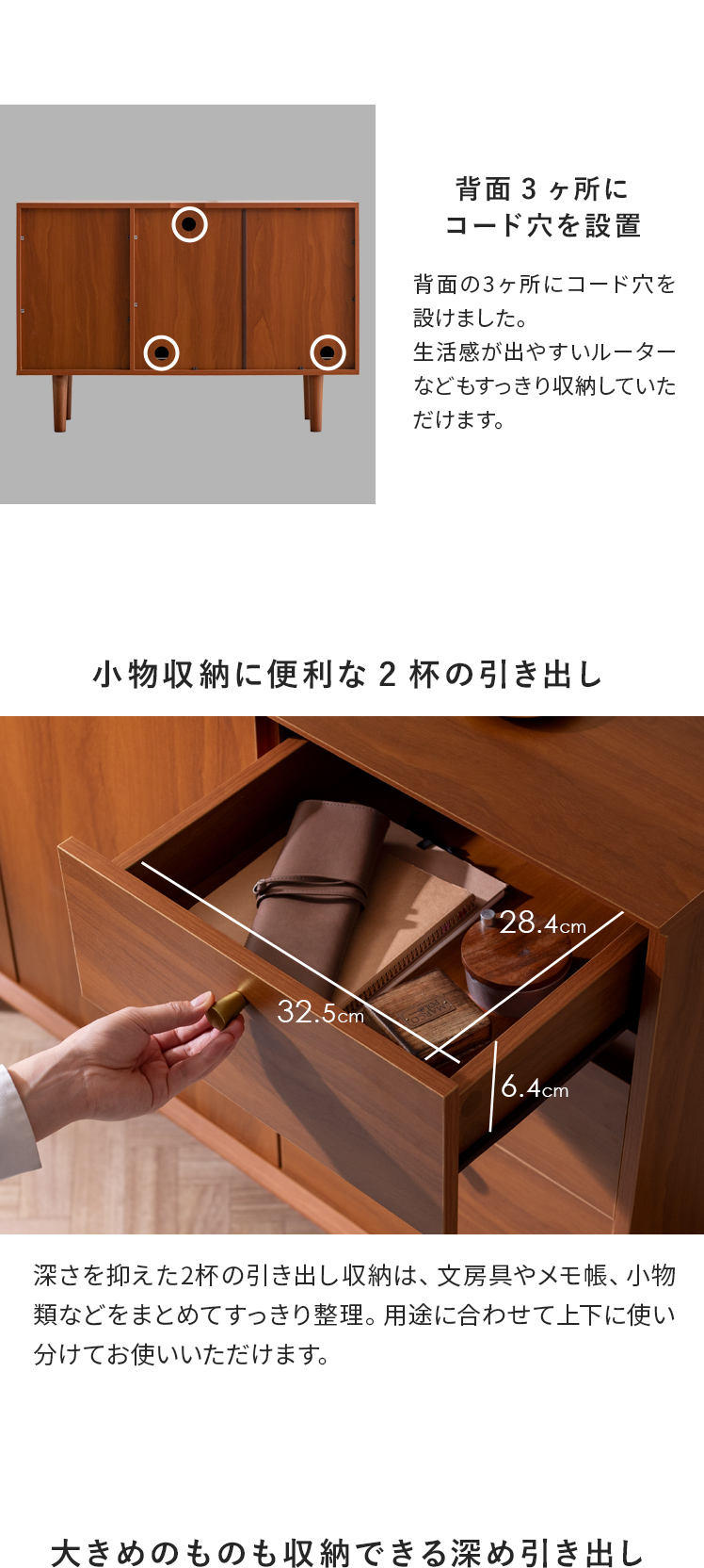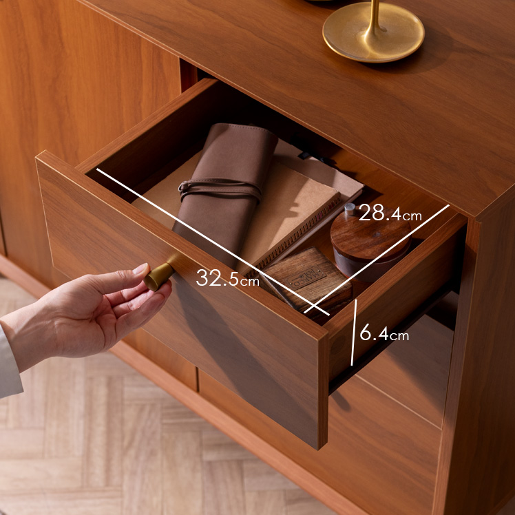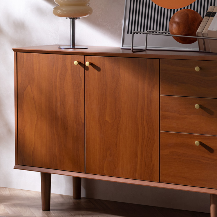 収納家具 チェスト ラック 収納 棚 幅120cm シェルフ リビング収納 寝室 ダイニング キャビネット 引き出し 扉収納 可動棚 11段階 マホガニー調 木目調 木製 丸脚 大容量 小物収納 収納棚 コード穴 コードスリット ディスプレイスペース メラミン モダン 北欧 ミッドセンチュリー ヴィンテージ ワイド ナチュラル シンプル 上品 赤茶 ブラウン