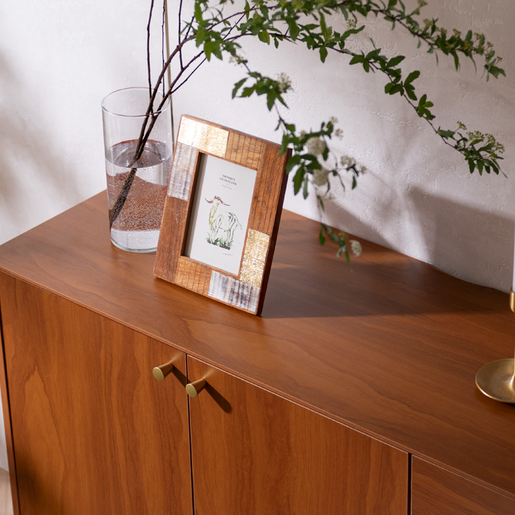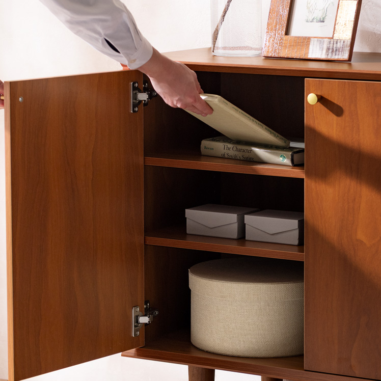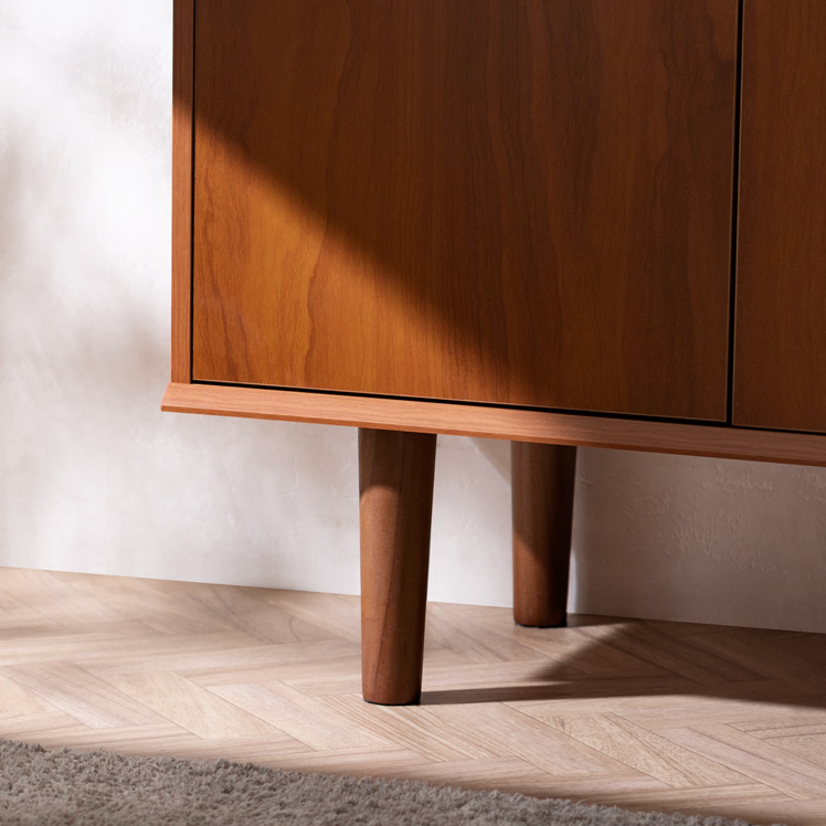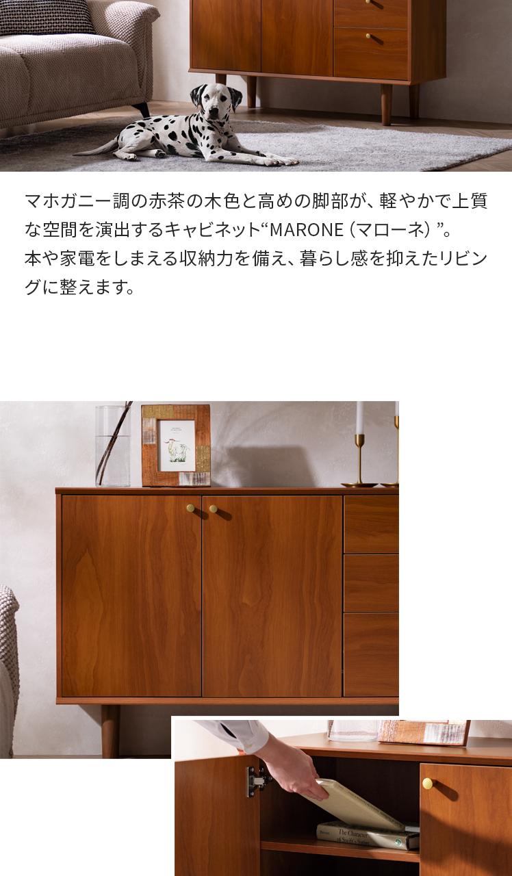 ヴィンテージ風キャビネット MARONE〔マローネ〕/マホガニー調の赤茶の木色と高めの脚部が、軽やかで上質な空間を演出するキャビネット。本や家電をしまえる収納力を備え、暮らし感を抑えたリビングに整えます。