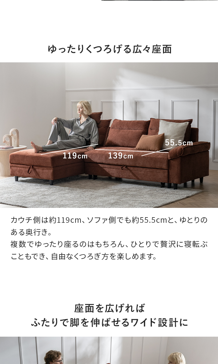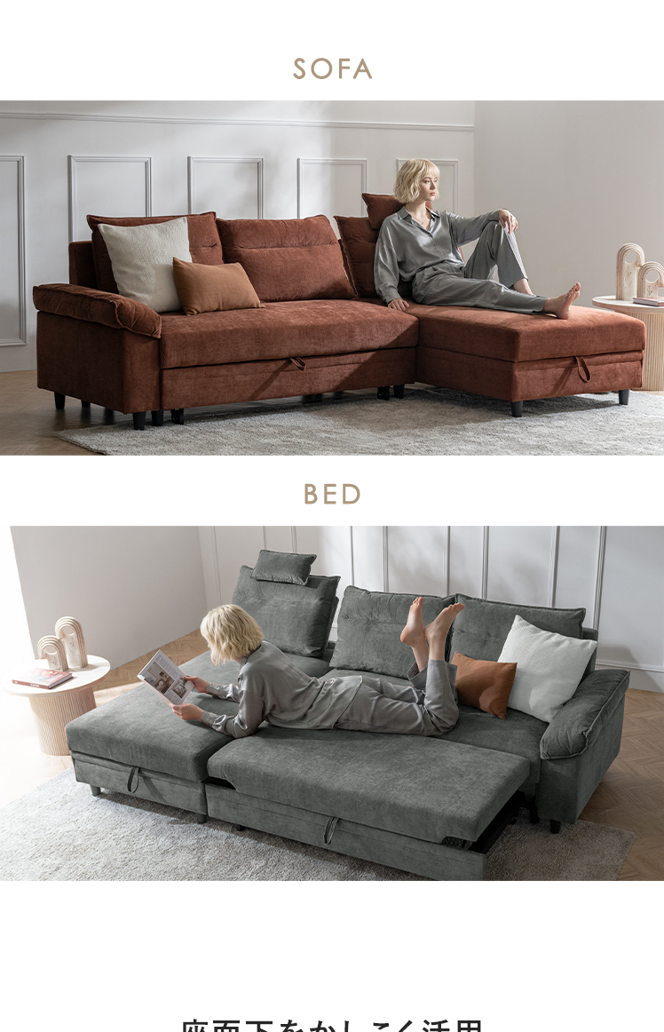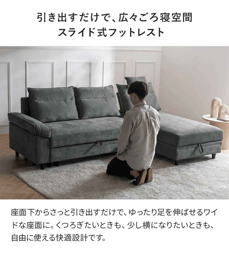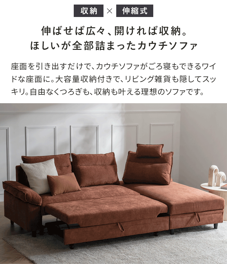 収納付き2WAYカウチソファ Nubia〔ヌビア〕/座面を引き出すだけで、カウチソファがごろ寝もできるワイドな座面に。大容量収納付きで、リビング雑貨も隠してスッキリ。自由なくつろぎも、収納も叶える理想のソファです。