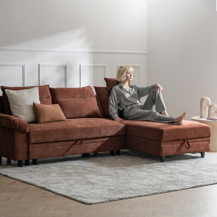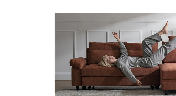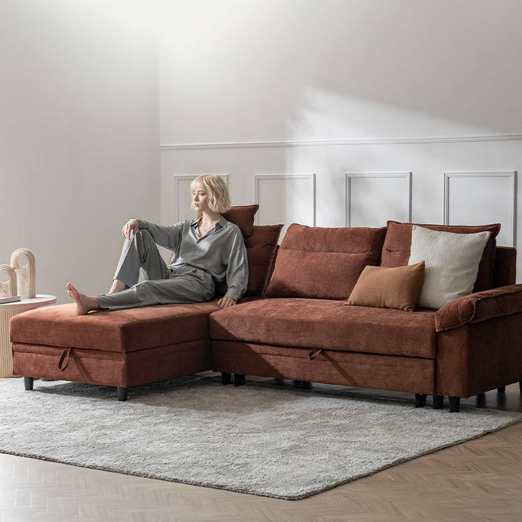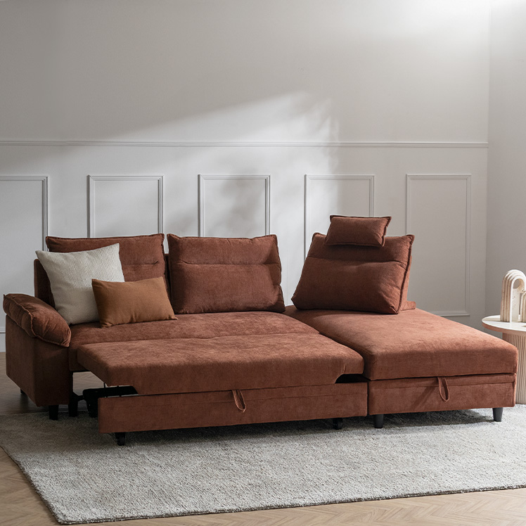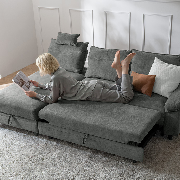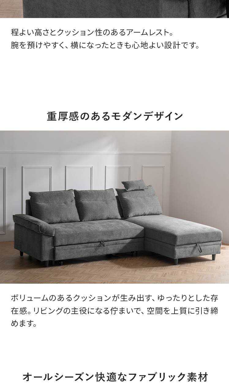 収納付き2WAYカウチソファ Nubia〔ヌビア〕/座面を引き出すだけで、カウチソファがごろ寝もできるワイドな座面に。大容量収納付きで、リビング雑貨も隠してスッキリ。自由なくつろぎも、収納も叶える理想のソファです。