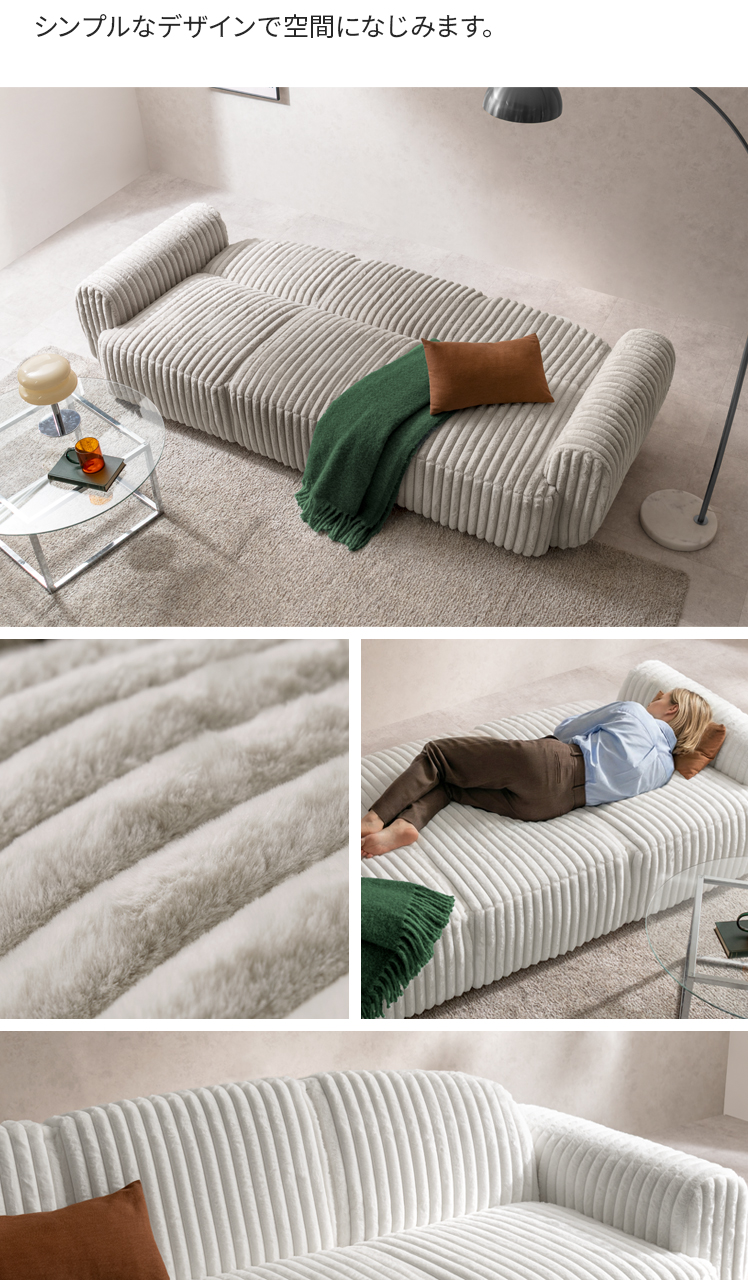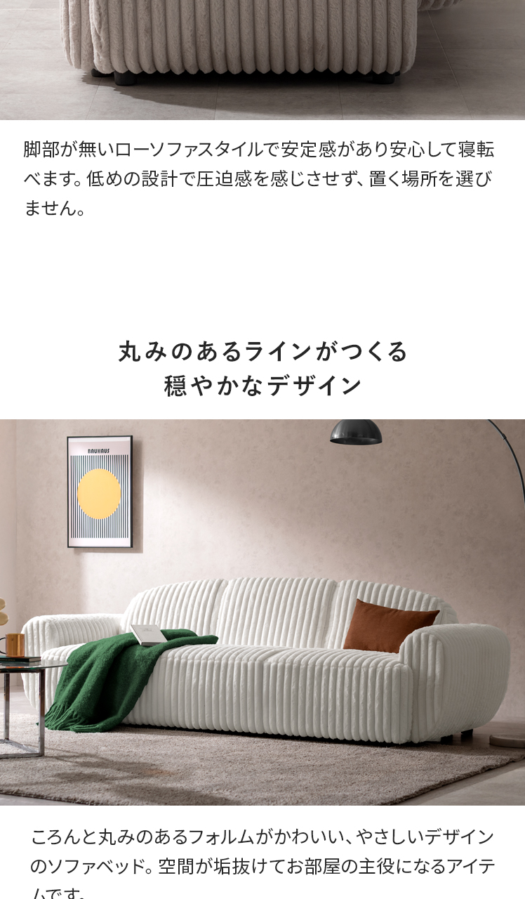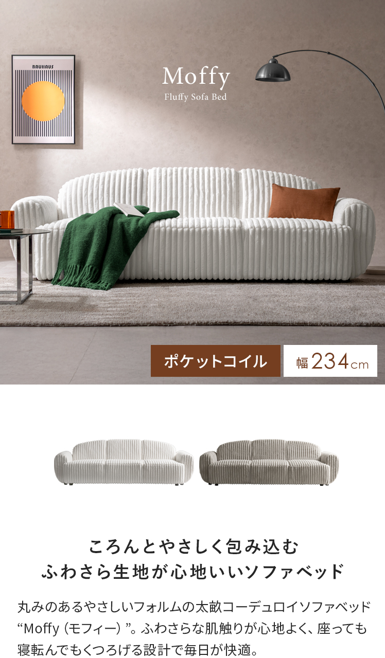 ソファベッド Moffy〔モフィー〕/丸みのあるやさしいフォルムの太畝コーデュロイソファベッド。ふわさらな肌触りが心地よく、座っても寝転んでもくつろげる設計で毎日が快適。シンプルなデザインで空間になじみます。