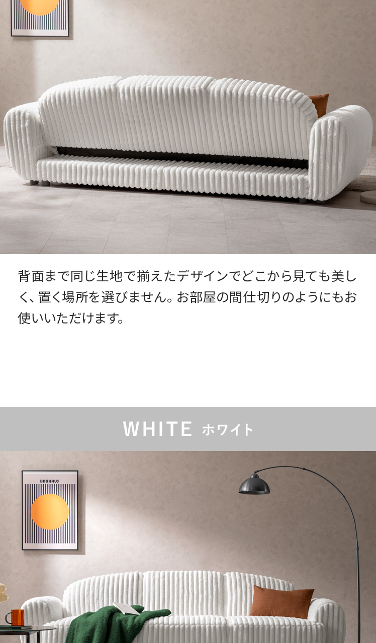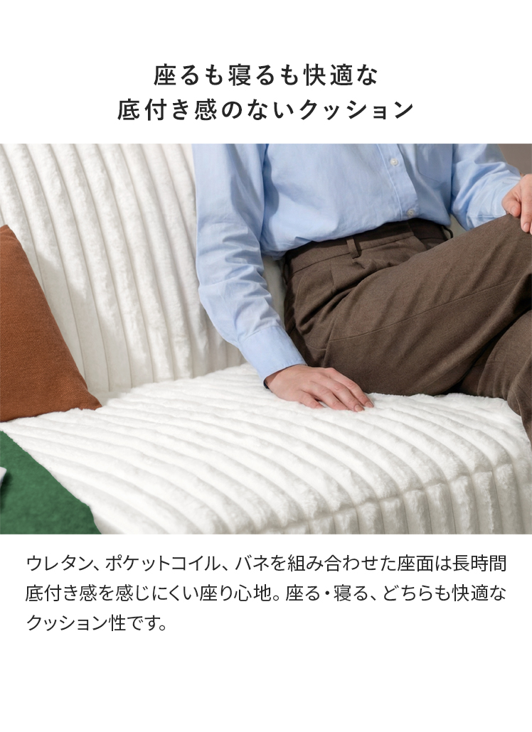 | 材質 | 鋼製バネ、ウレタン、ポケットコイル、ウェービングベルト、脚/スチール(粉体塗装)、ポリエステル100%、ウレタンフォーム |