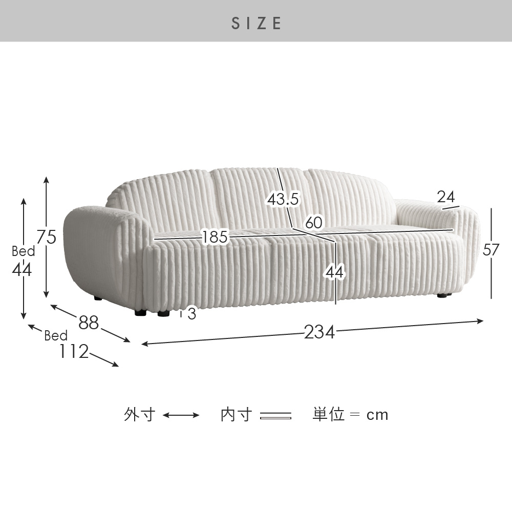 | サイズ | 約幅234×奥行き88〜112×高さ75cm |