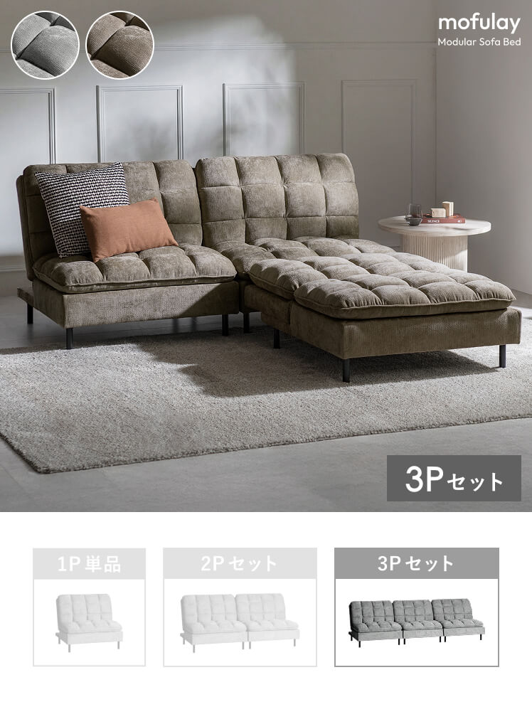 ユニットソファベッド mofulay〔モフレイ〕3Pセット/暮らしに合わせて形を変えられる1Pソファベッド。2台並べて2Pソファに、両方倒せばベッドのようにも使えます。ふっくらとしたキルティングの素材感が、お部屋に洗練された落ち着きを添える一台です。