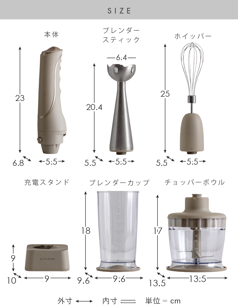 | サイズ | 本体+充電スタンド/約幅10×奥行き10.9×高さ24cm 本体/約幅5.5×奥行き6.8×高さ23cm 充電スタンド/約幅9×奥行き10×高さ9cm ブレンダースティック/約幅5.5×奥行き5.5×高さ20.4cm ホイッパー/約幅5.5×奥行き5.5×高さ25cm ブレンダーカップ/約幅9.6×奥行き9.6×高さ18cm チョッパーボウル/約幅13.5×奥行き13.5×高さ17cm |