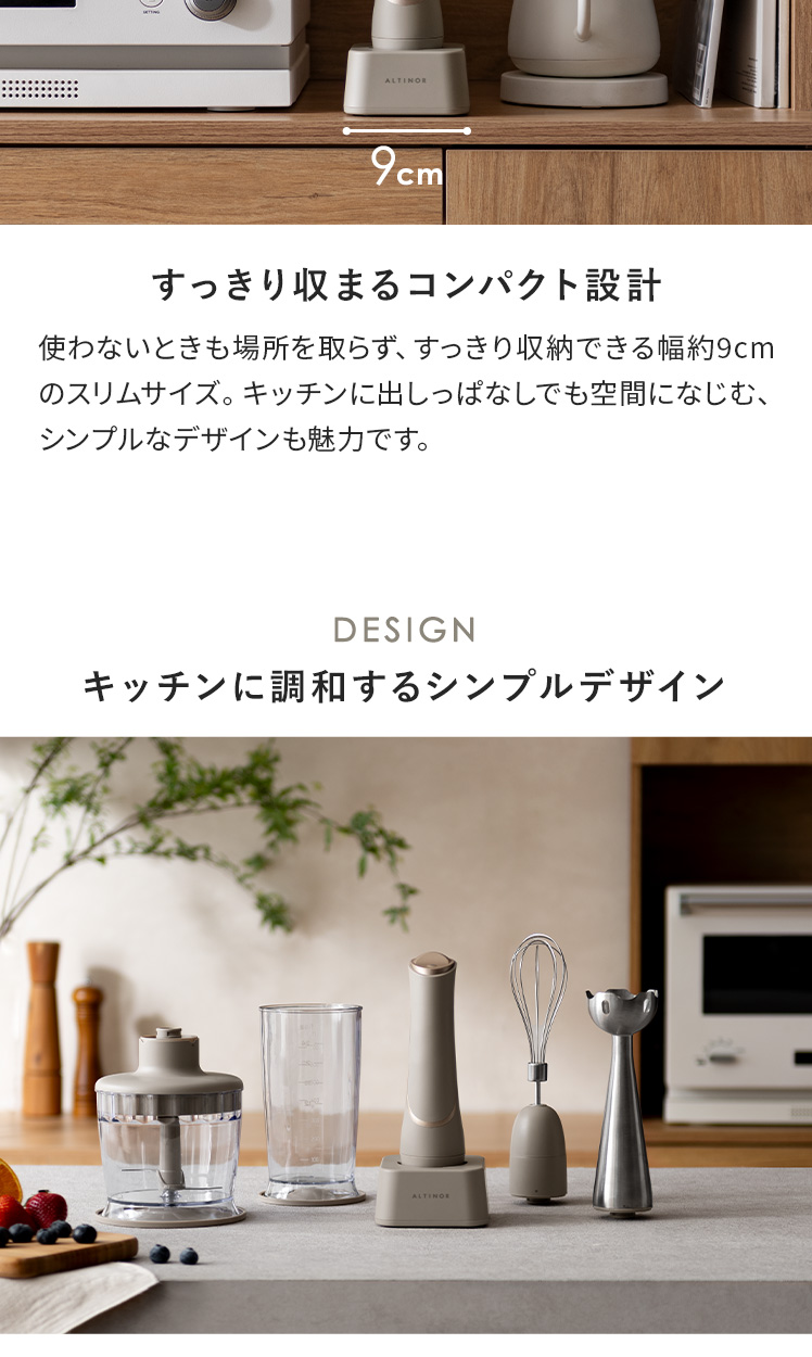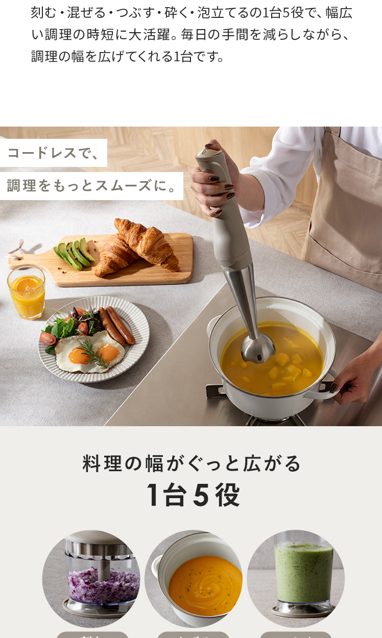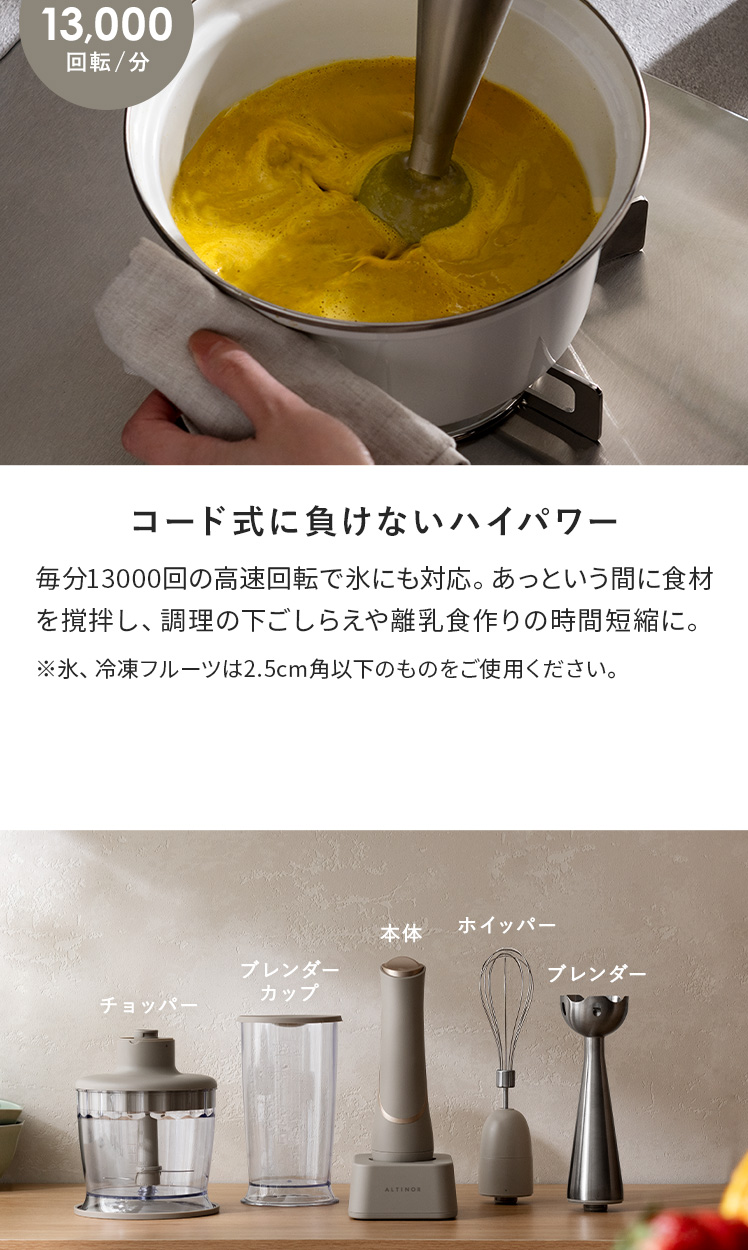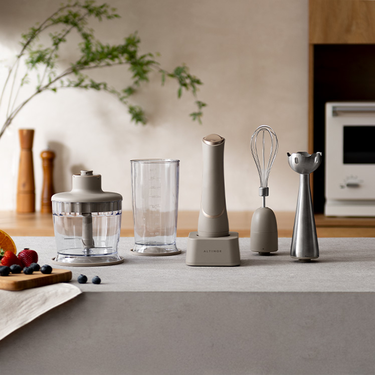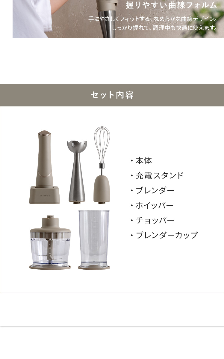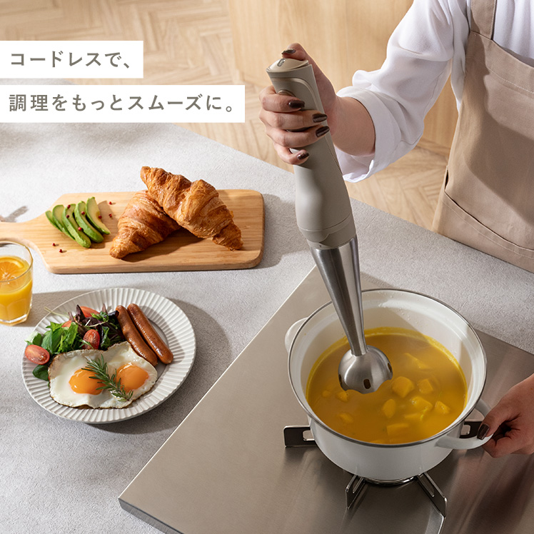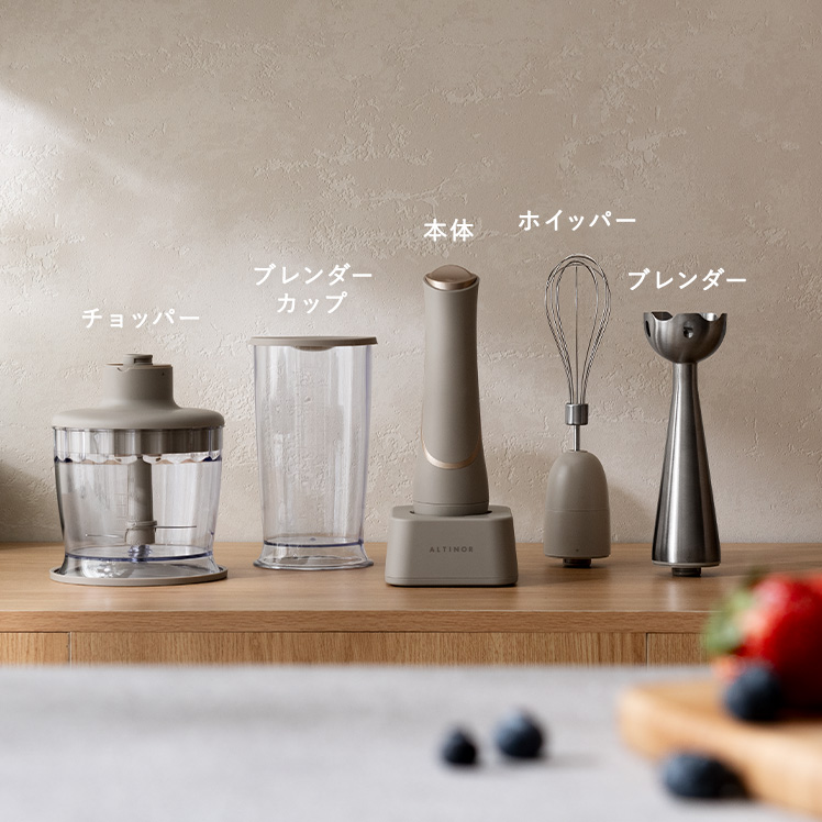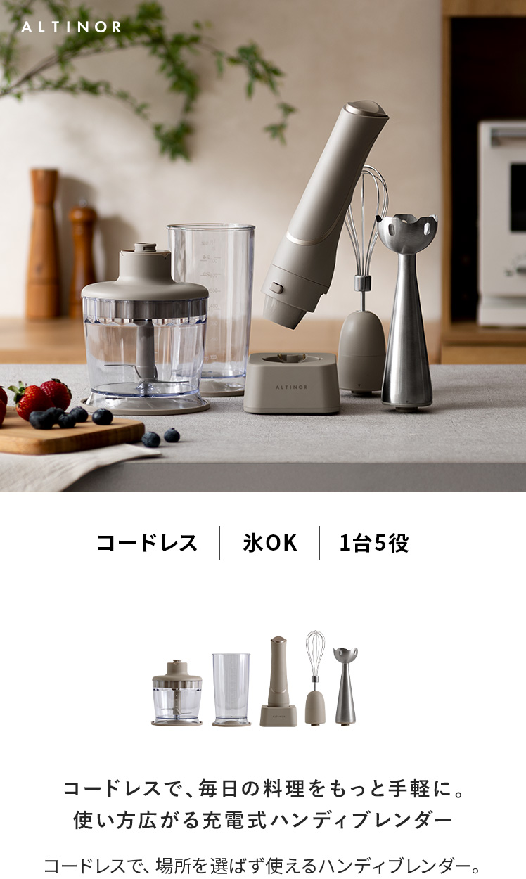 ALTINOR〔アルティノル〕コードレスハンディブレンダー/コードレスで、場所を選ばず使えるハンディブレンダー。刻む・混ぜる・つぶす・砕く・泡立てるの1台5役で、幅広い調理の時短に大活躍。毎日の手間を減らしながら、調理の幅を広げてくれる1台です。