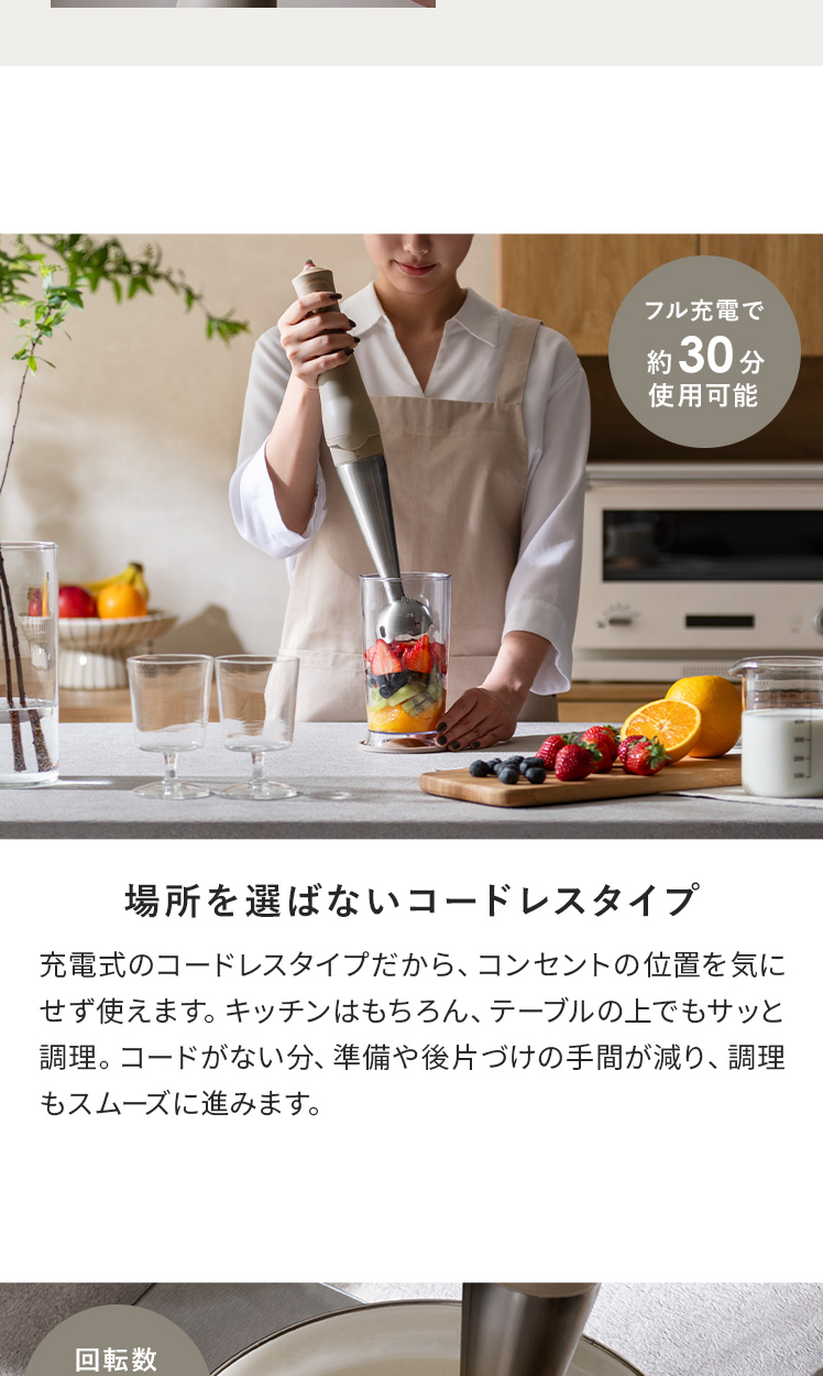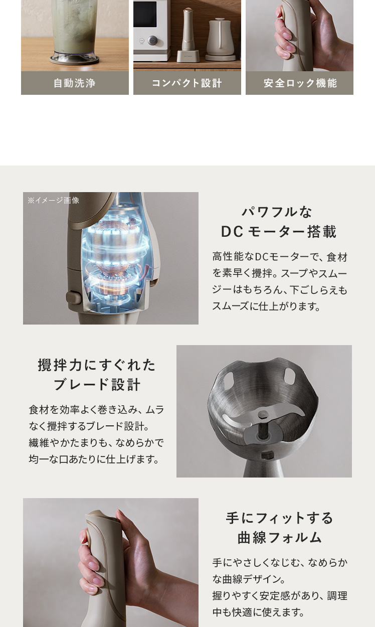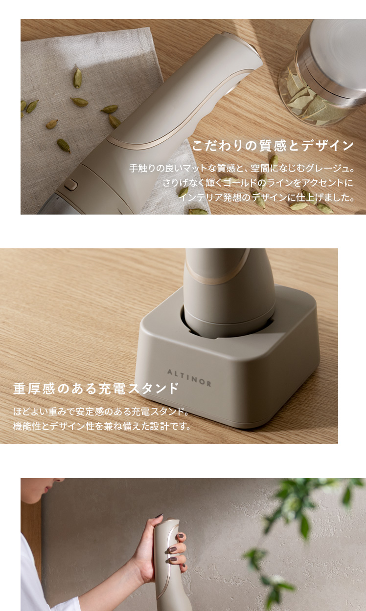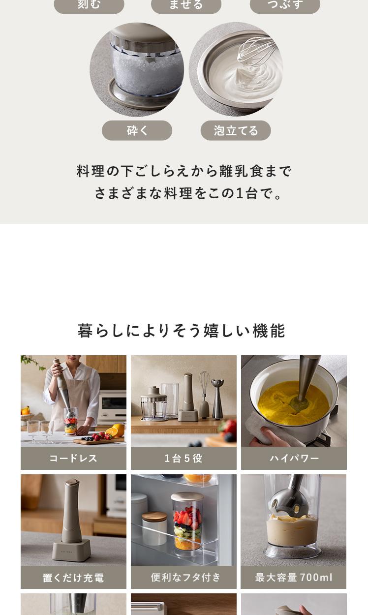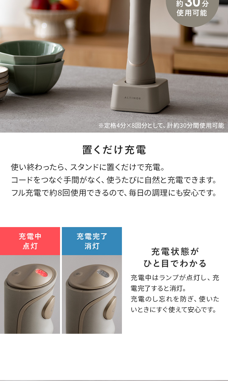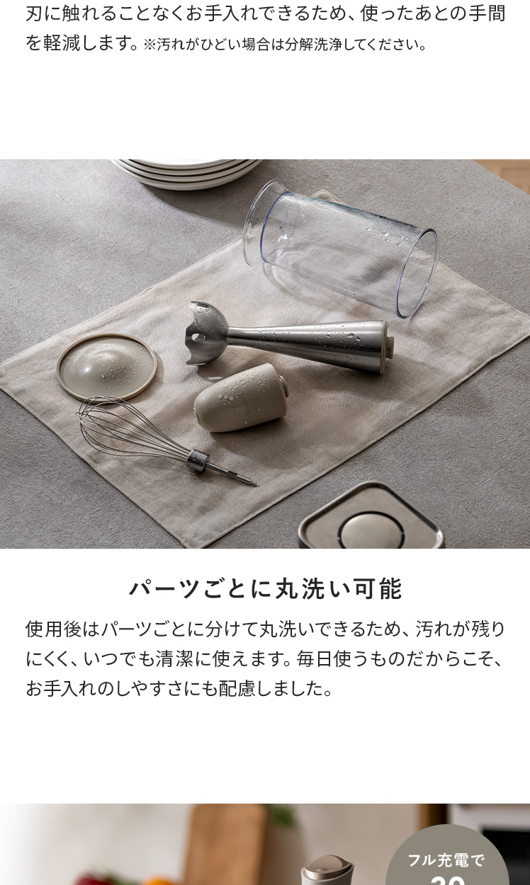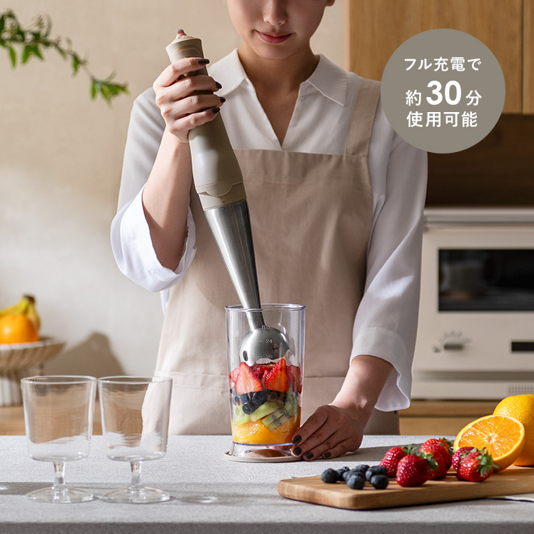 ALTINOR〔アルティノル〕コードレスハンディブレンダー/コードレスで、場所を選ばず使えるハンディブレンダー。刻む・混ぜる・つぶす・砕く・泡立てるの1台5役で、幅広い調理の時短に大活躍。毎日の手間を減らしながら、調理の幅を広げてくれる1台です。