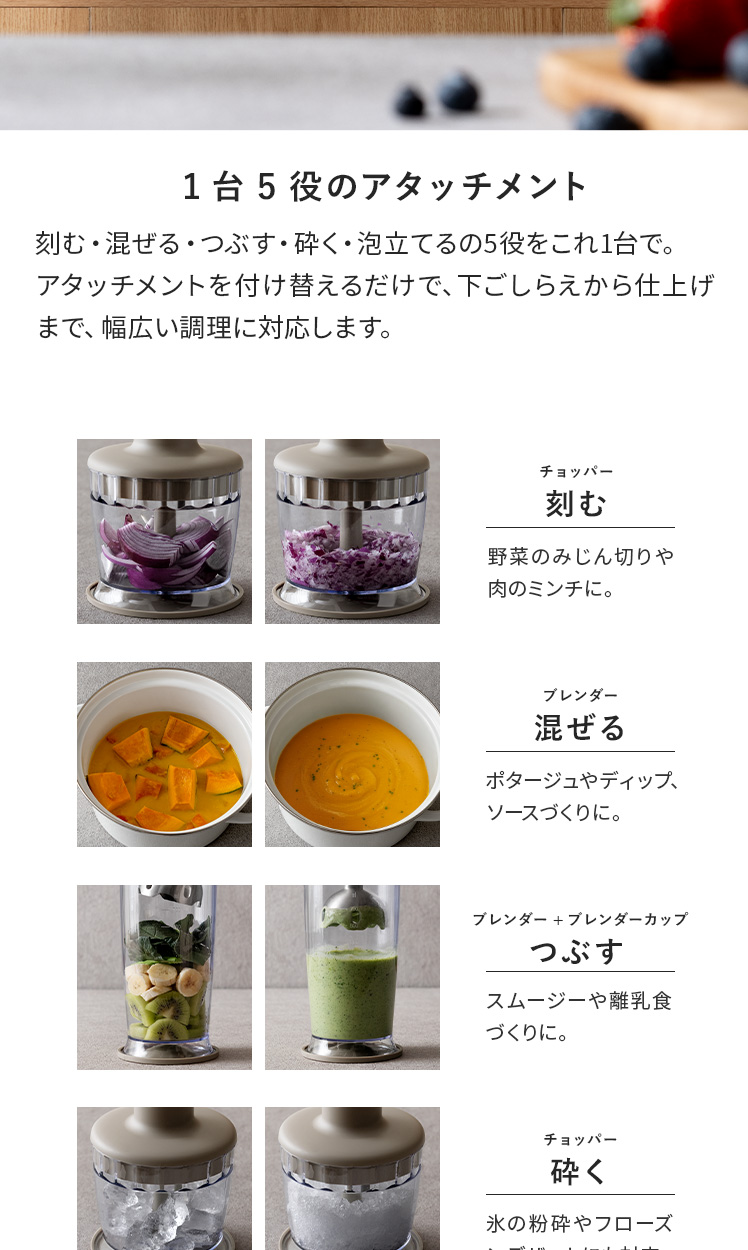 | セット内容 | 本体(リチウムイオン電池内蔵)、充電スタンド、ACアダプター、チョッパー用ブレード、ブレンダーカップ(滑り止めパッド付)、ブレンダースティック、チョッパーボウル(滑り止めパッド付)、ホイッパー、チョッパー |