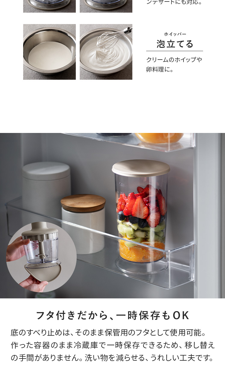 | 定格時間 | チョッパー(きざむ)/約30秒 ブレンダー700ml(つぶす・まぜる)/約1分 ホイッパー(泡立てる)/約3分 |