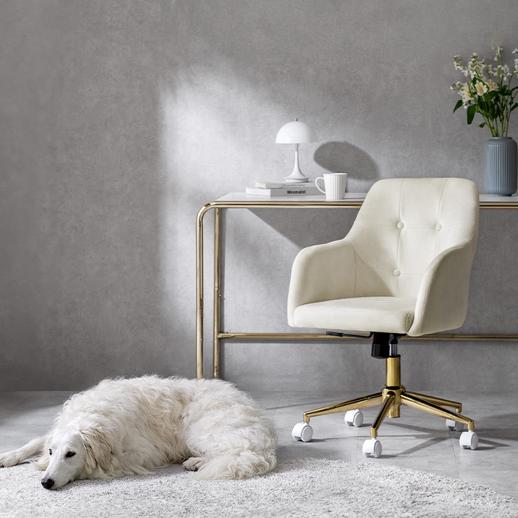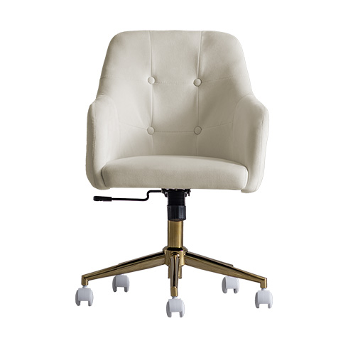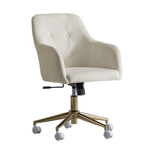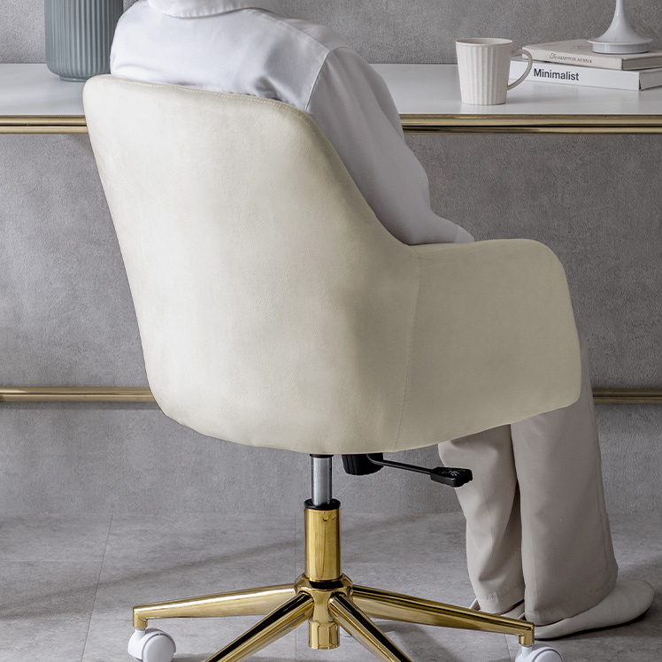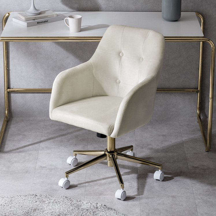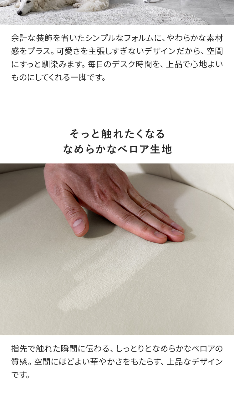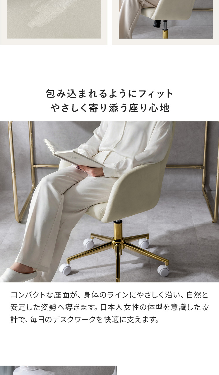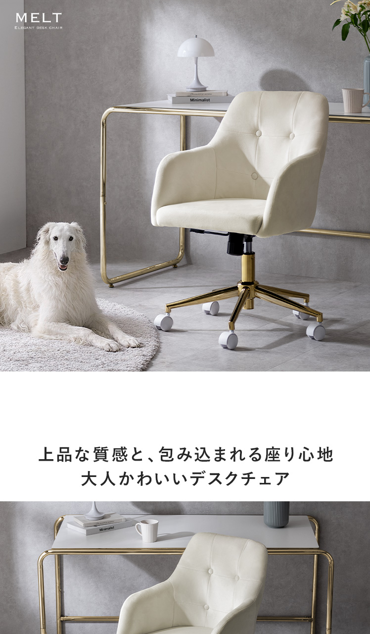 ベロア×ゴールドの大人かわいいデスクチェア MELT〔メルト〕/上品な質感と、包み込まれる座り心地が魅力の大人かわいいデスクチェア。なめらかなベロア生地が控えめに華やぐデザインと調和し、空間に上品なアクセントを添えます。