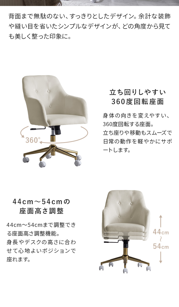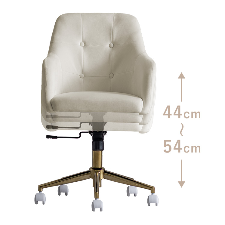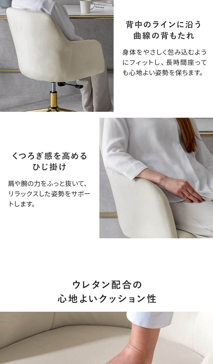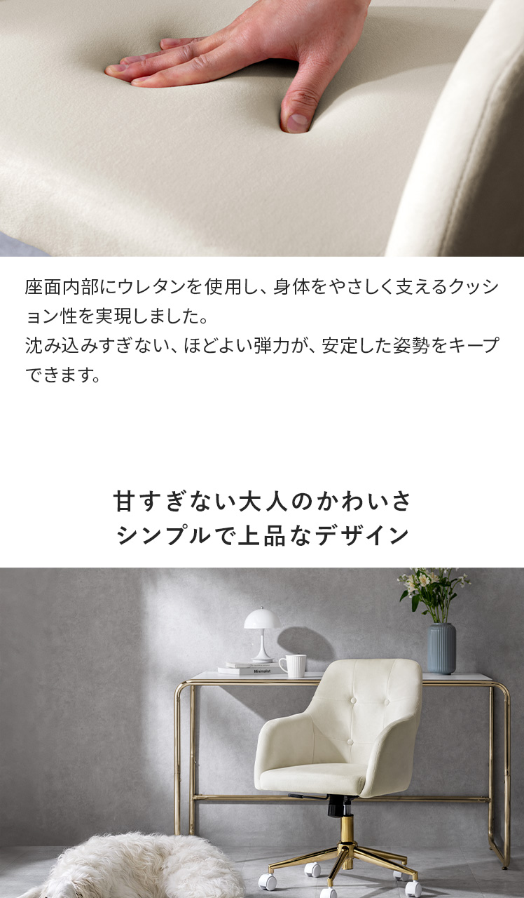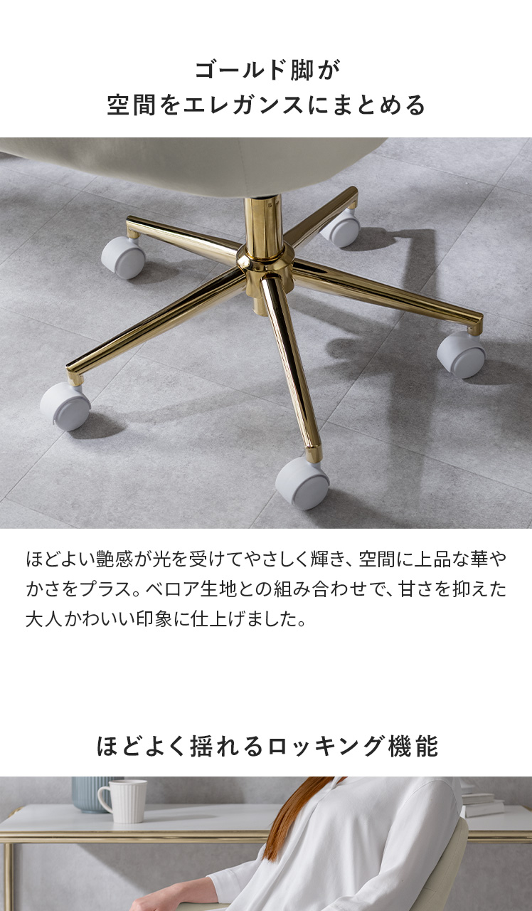 デスクチェア チェア キャスターチェア イス いす もちもち 椅子 韓国 ロッキング チェアー パーソナルチェア 大人かわいい デスクワーク ゴールド脚 エレガンス おしゃれ ナチュラル カフェ 上品 ウレタン 北欧 シンプル かわいい ひじ掛け ベロア生地 コンパクト カジュアル 360度回転 昇降 キャスター付き ホワイト