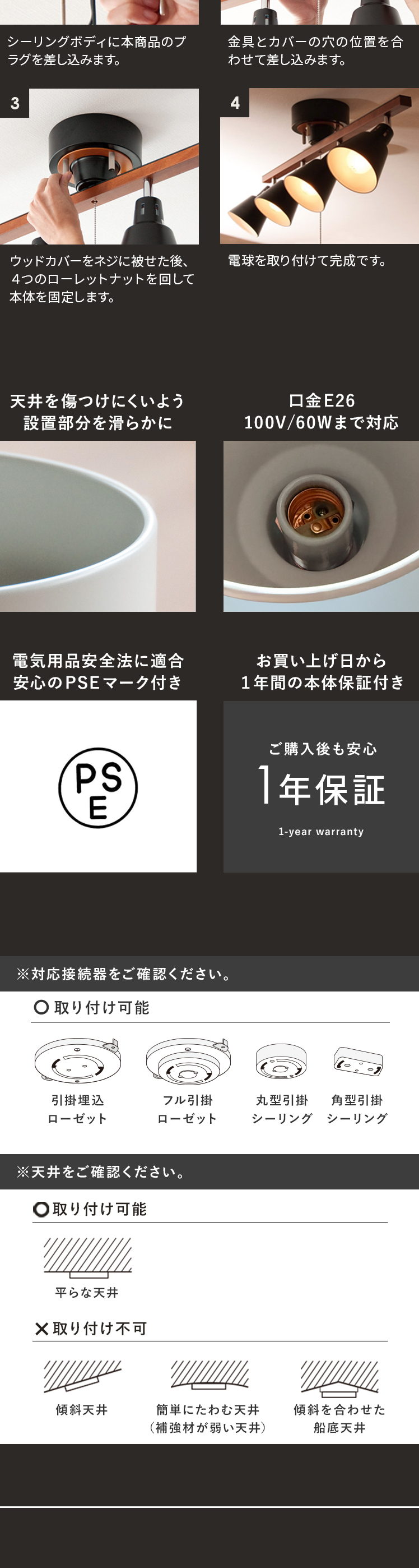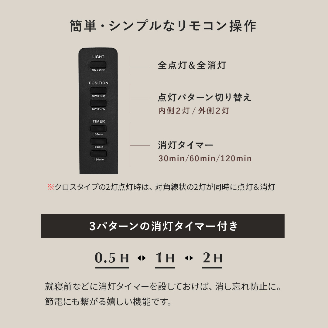 | 備考 | 組立式(両タイプ組立て時間約10分) ※若干の個体差により、表記サイズと多少の差異が生じる場合がございます。 LED対応、点灯パターン切替、1年保証 ※斜めの天井設置は不可となっております。 |