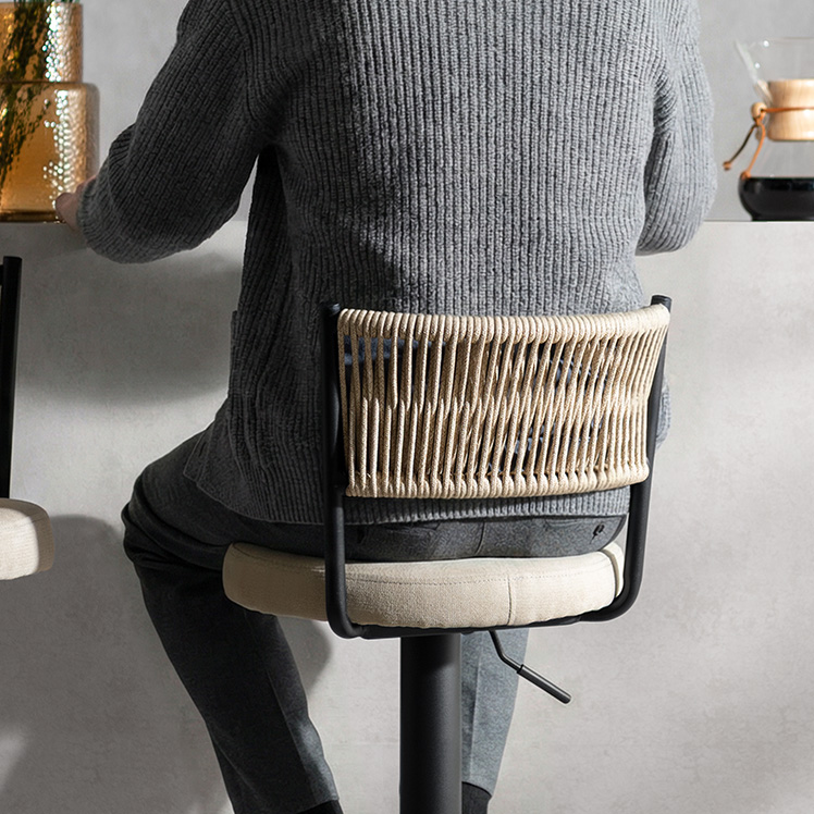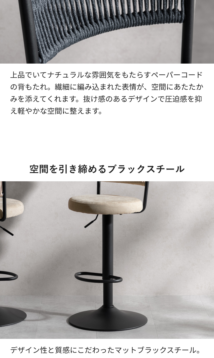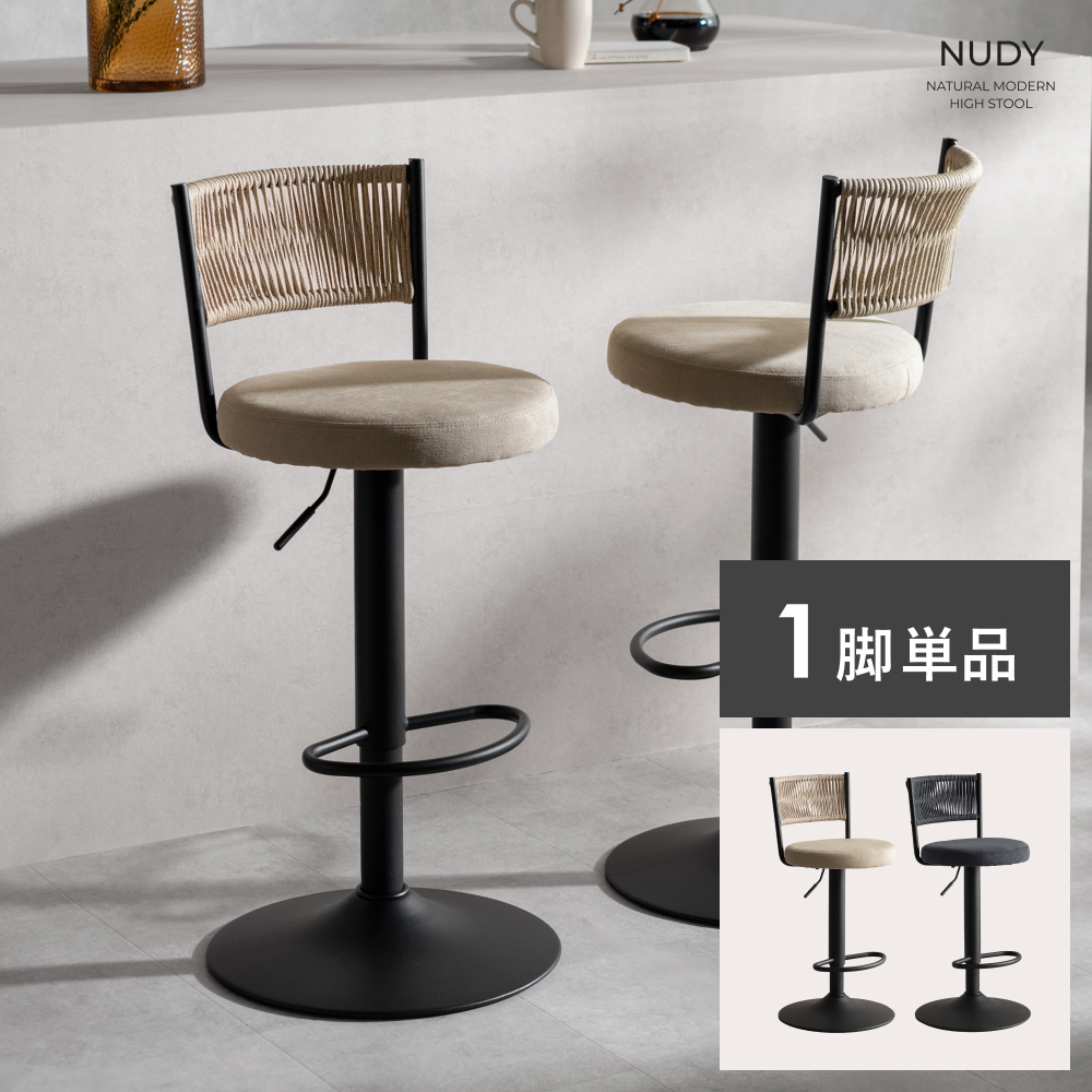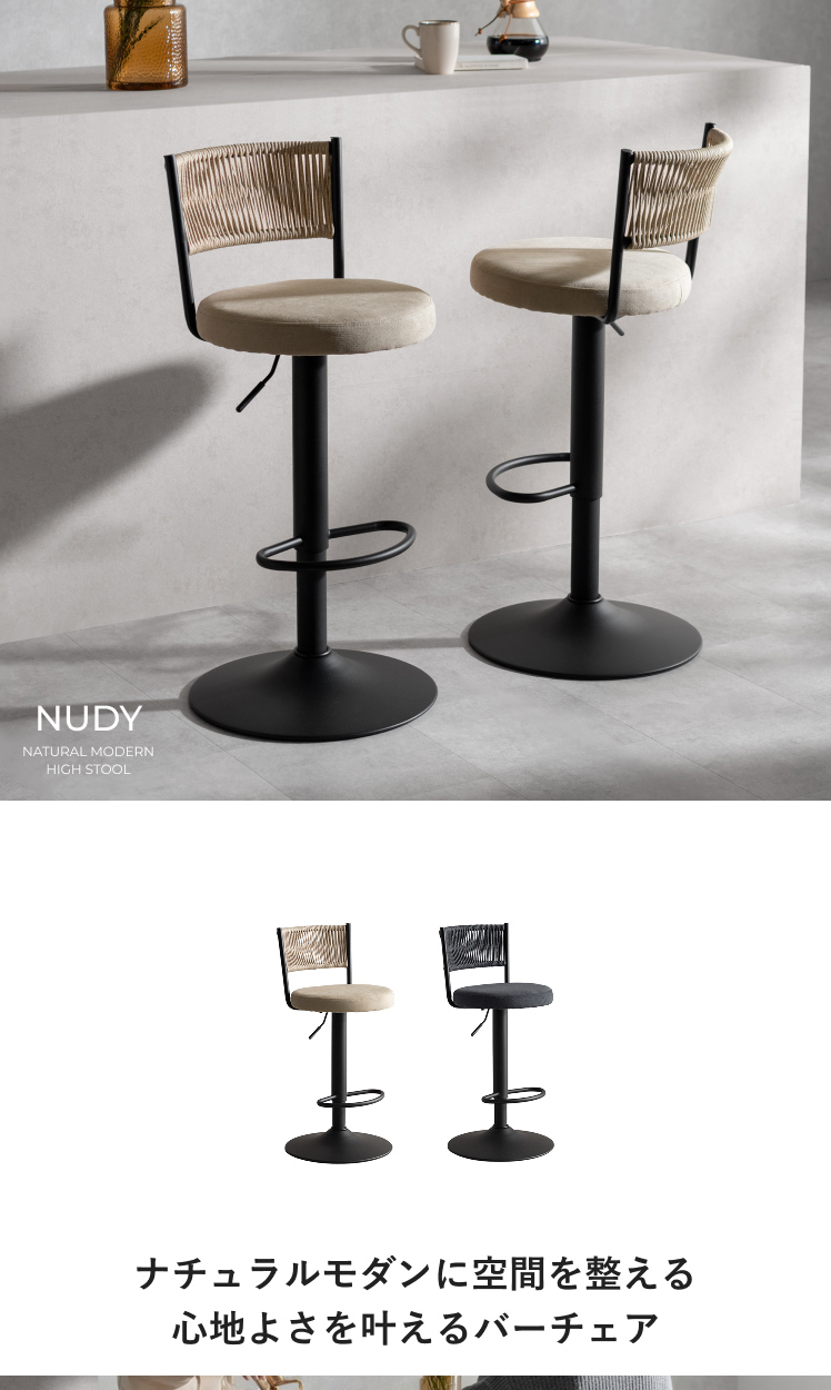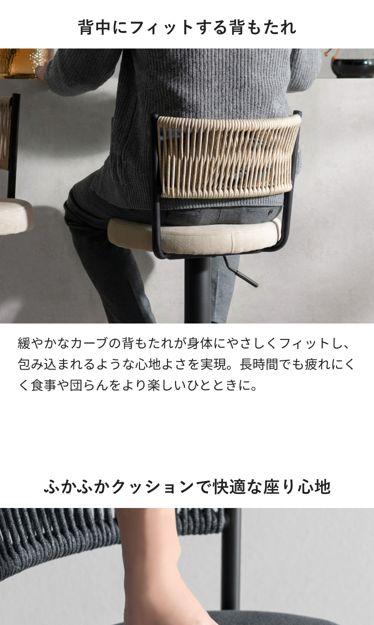 コード編みバーチェア NUDY〔ヌディ〕/やわらかな表情のペーパーコードの背もたれが目を惹く、ナチュラルモダンなバーチェア。ふかふかの座り心地と、360°回転・昇降機能で快適性もしっかり備えました。ご自宅のカウンターに洗練さと温もりをプラスします。