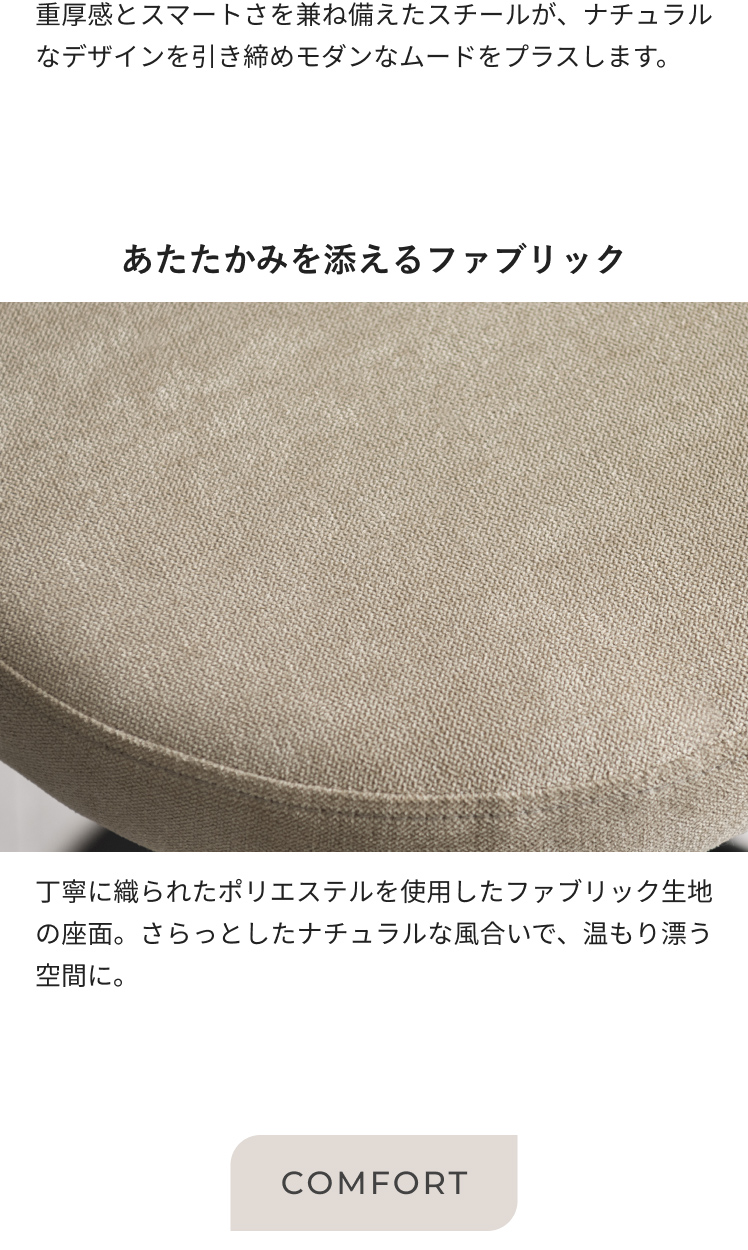 | 材質 | クッション材/ウレタンフォーム 張地・背もたれ/ポリエステル 脚部・フレーム/スチール(粉体塗装仕上げ) |
