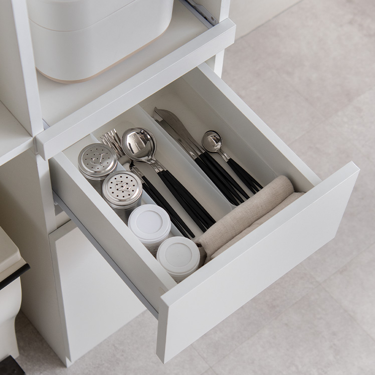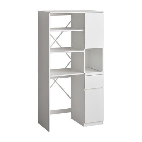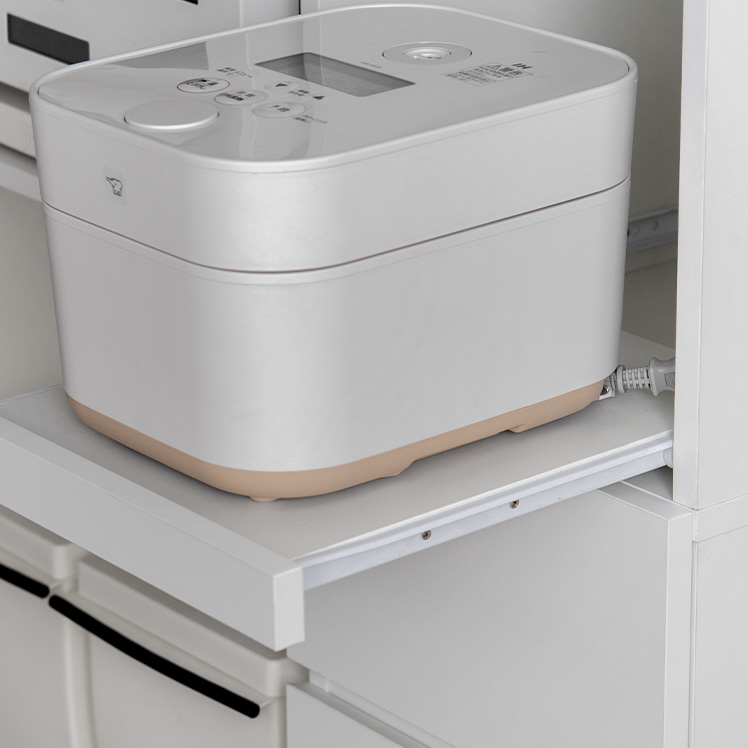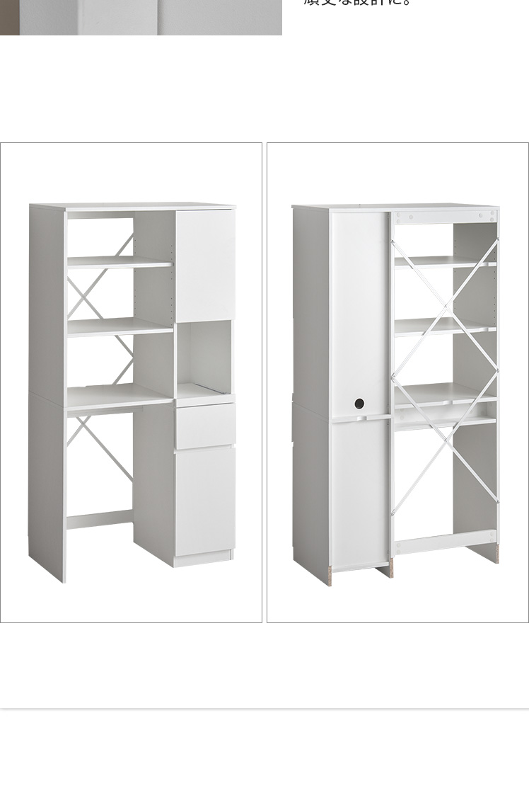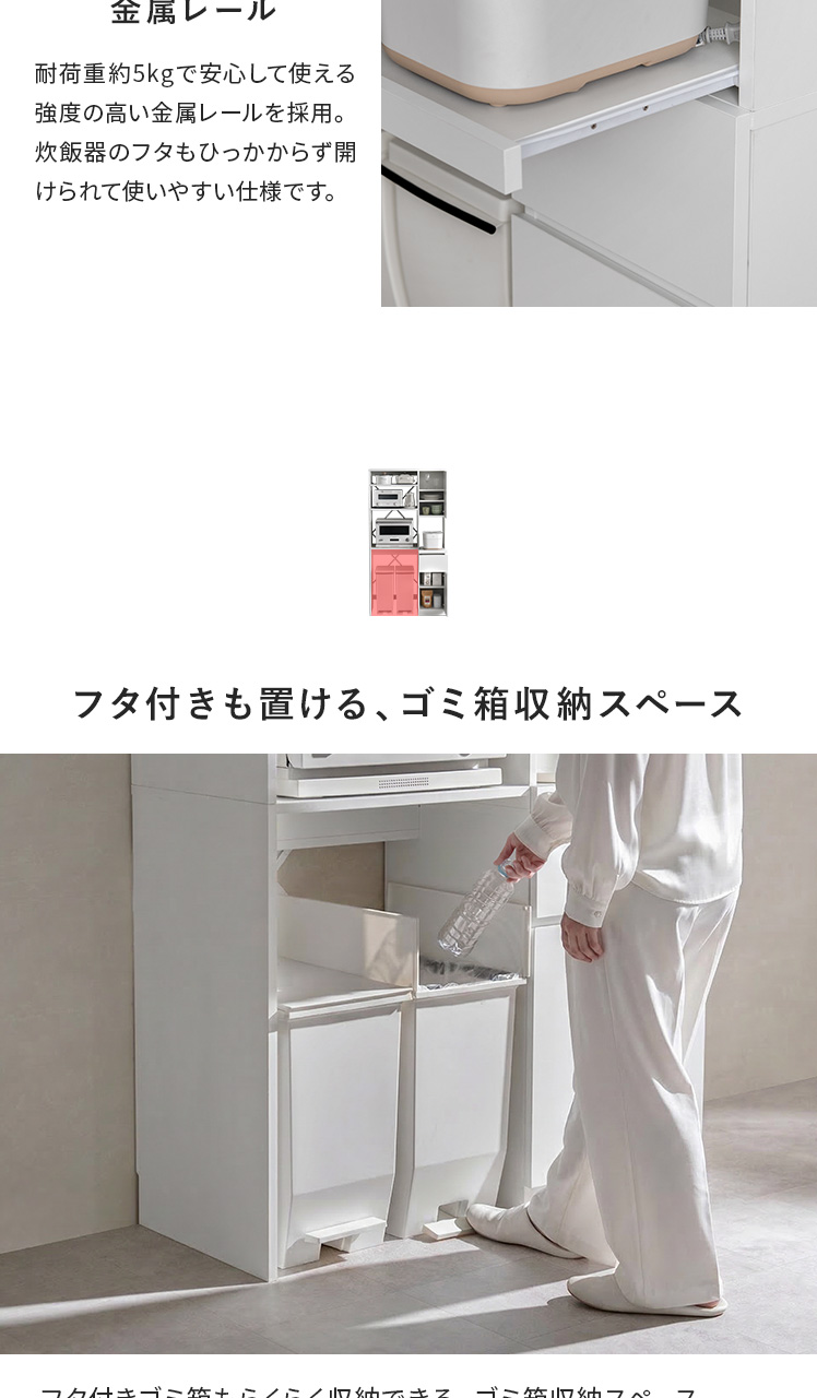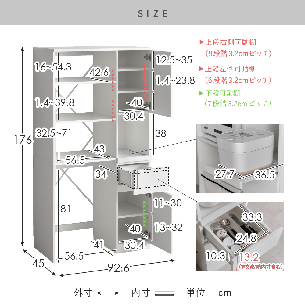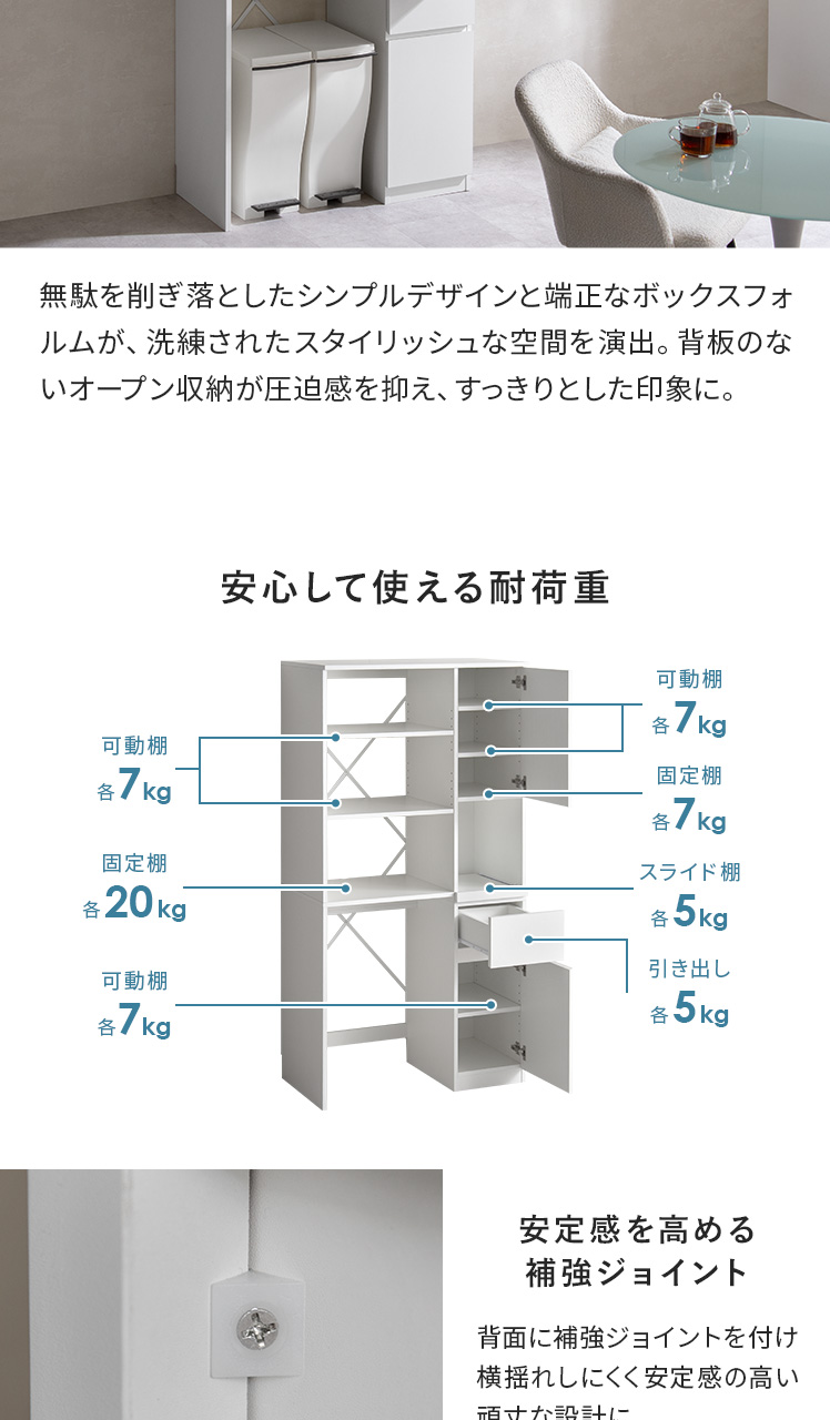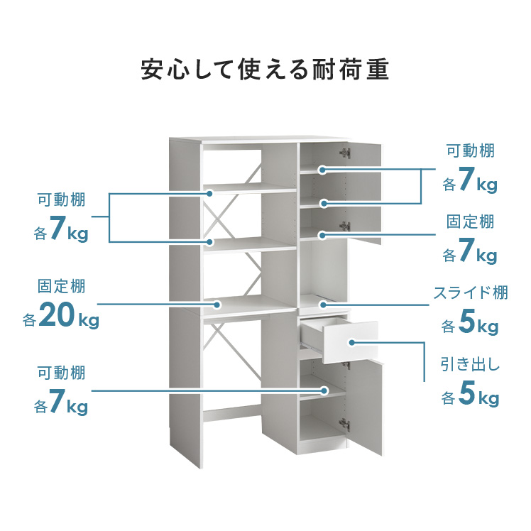 | 耐荷重 | 固定棚(大)/約20kg、固定棚(小)/約7kg、可動棚(大・小)/約7kg、スライドトレー/約5kg、引き出し/約5kg、背面棚/約2kg |