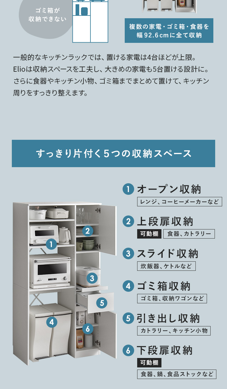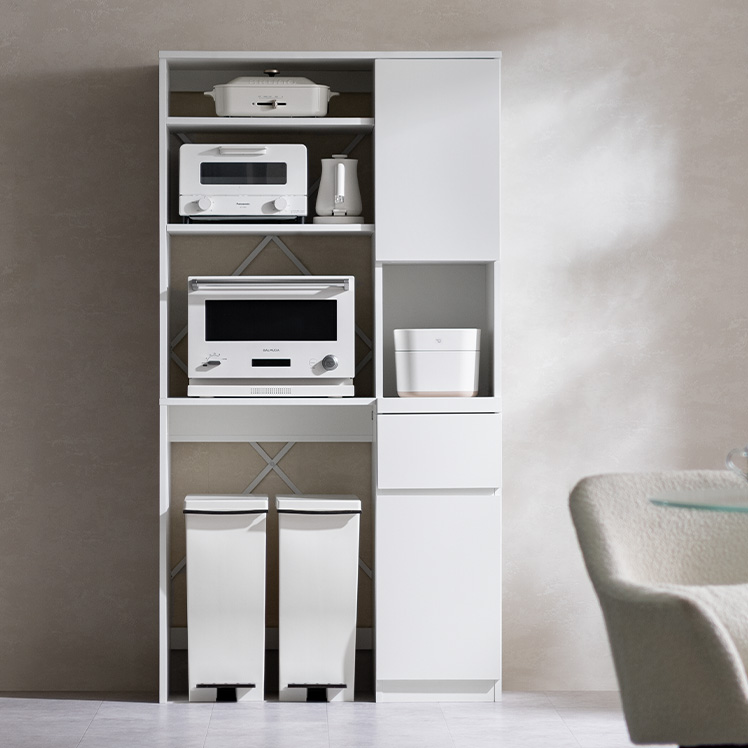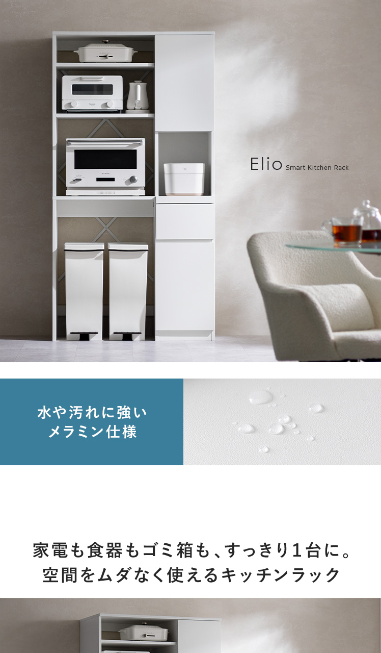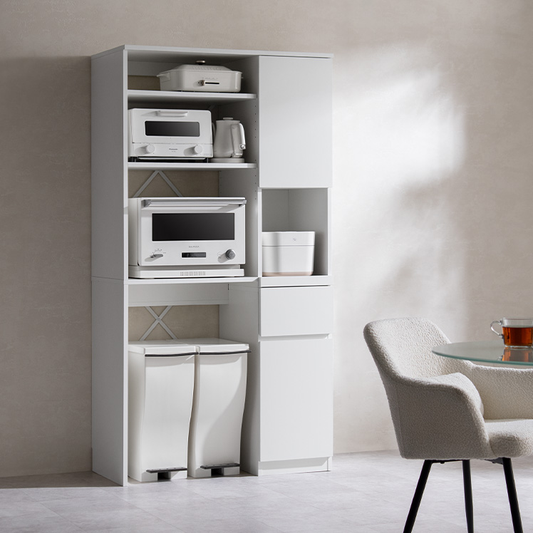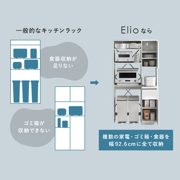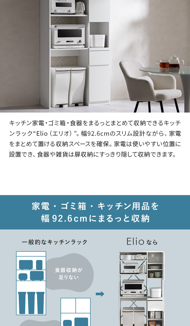 ゴミ箱収納キッチンボード Elio〔エリオ〕/キッチン家電・ゴミ箱・食器をまるっとまとめて収納できるキッチンラック。幅92.6cmのスリム設計ながら、家電をまとめて置ける収納スペースを確保。家電は使いやすい位置に設置でき、食器や雑貨は扉収納にすっきり隠して収納できます。